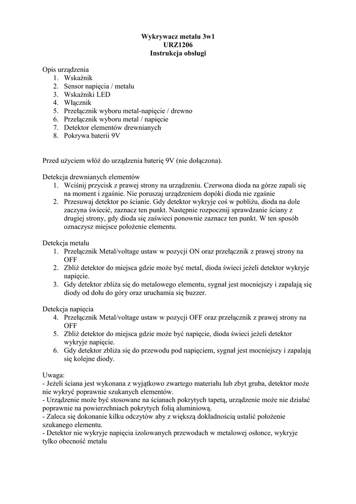 Wykrywacz metalu 3w1 URZ1206 Instrukcja obsługi Opis urządzenia 1. Wskaźnik 2. Sensor napięcia / metalu 3. Wskaźniki LED 4. Włącznik 5. Przełącznik wyboru metal-napięcie / drewno 6. Przełącznik wyboru metal / napięcie 7. Detektor elementów drewnianych 8. Pokrywa baterii 9V Przed użyciem włóż do urządzenia baterię 9V (nie dołączona). Detekcja drewnianych elementów 1. Wciśnij przycisk z prawej strony na urządzeniu. Czerwona dioda na górze zapali się na moment i zgaśnie. Nie poruszaj urządzeniem dopóki dioda nie zgaśnie 2. Przesuwaj detektor po ścianie. Gdy detektor wykryje coś w pobliżu, dioda na dole zaczyna świecić, zaznacz ten punkt. Następnie rozpocznij sprawdzanie ściany z drugiej strony, gdy dioda się zaświeci ponownie zaznacz ten punkt. W ten sposób oznaczysz miejsce położenie elementu. Detekcja metalu 1. Przełącznik Metal/voltage ustaw w pozycji ON oraz przełącznik z prawej strony na OFF 2. Zbliż detektor do miejsca gdzie może być metal, dioda świeci jeżeli detektor wykryje napięcie. 3. Gdy detektor zbliża się do metalowego elementu, sygnał jest mocniejszy i zapalają się diody od dołu do góry oraz uruchamia się buzzer. Detekcja napięcia 4. Przełącznik Metal/voltage ustaw w pozycji OFF oraz przełącznik z prawej strony na OFF 5. Zbliż detektor do miejsca gdzie może być napięcie, dioda świeci jeżeli detektor wykryje napięcie. 6. Gdy detektor zbliża się do przewodu pod napięciem, sygnał jest mocniejszy i zapalają się kolejne diody. Uwaga: - Jeżeli ściana jest wykonana z wyjątkowo zwartego materiału lub zbyt gruba, detektor może nie wykryć poprawnie szukanych elementów. - Urządzenie może być stosowane na ścianach pokrytych tapetą, urządzenie może nie działać poprawnie na powierzchniach pokrytych folią aluminiową. - Zaleca się dokonanie kilku odczytów aby z większą dokładnością ustalić położenie szukanego elementu. - Detektor nie wykryje napięcia izolowanych przewodach w metalowej osłonce, wykryje tylko obecność metalu