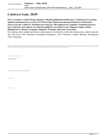 Celebryci Gala: 28.09 Autor: Adres: http://wrotalubuskie.eu/PL/424/1328/Celebryci__Gala__28_09/k/ Celebryci Gala: 28.09 Od 3 września w Galerii Wojewódzkiej i Miejskiej Biblioteki Publicznej w Zielonej Górze można oglądać pokonkursową wystawę XVI Otwartego Międzynarodowego Konkursu na Rysunek Satyryczny ph. Celebryci. Znalazło się na niej ok. 100 najlepszych rysunków wyłonionych przez jury konkursu. Ich autorzy to czołówka polskich rysowników m.in. Zbigniew Jujka, Julian Bohdanowicz, Maciej Trzepałka, Zbigniew Woźniak, Sławomir Łuczyński. Nie brakuje także międzynarodowej reprezentacji tej dziedziny twórczości plastycznej, takich nazwisk jak: Pol Leurs, Kfir Weizman, Konstantin Kazanchev, Ross Thomson, Andrea Bersani, Mariagrazia „Gio" Quaranta. Oglądając tegoroczną wystawę można zauważyć, że rysownicy „przeanalizowali" zagadnienie wielostronnie. Dla wielu celebryci to jednoznaczne skojarzenia z konkretnymi, rozpoznawalnymi na całym świecie osobami, stąd na ekspozycji sporo karykatur. Dla innych wart skomentowania okazał się fenomen dzisiejszych czasów, bycie osobą znaną z tego, że jest się znaną. Celebryci to też zwyczajni ludzie, a ich życie podobnie jak innych śmiertelników bywa ciężkie, nad czym z właściwą sobie zjadliwością pochylili się kolejni uczestnicy konkursu. Wielu rysowników twierdzi, że każdy może być celebrytą. Pojawiają się oni w naszych małych „wielkich światach", w lokalnych społecznościach, związkach, bo celebryta to bardziej stan ducha i potrzeba bycia w centrum uwagi, niż wykreowana przez media gwiazda. I takich celebrytów na wystawie znalazło się najwięcej. Warto zajrzeć do Galerii Biblioteki Norwida by obejrzeć co i jak na temat celebrytów myślą rysownicy z całego świata. Wystawa czynna od 3 do 30 września (Galeria WiiMBP) poniedziałek-piątek w godzinach 8.00-19.00 sobota w godzinach 9.00-16.00 Gala wręczenia nagród 28.09.2014 (niedziela), godz. 18, Filharmonia Zielonogórska Serdecznie zapraszamy! źródło: www.wimbp.zgora.pl strona 1 / 1 Powered by TCPDF (www.tcpdf.org)
