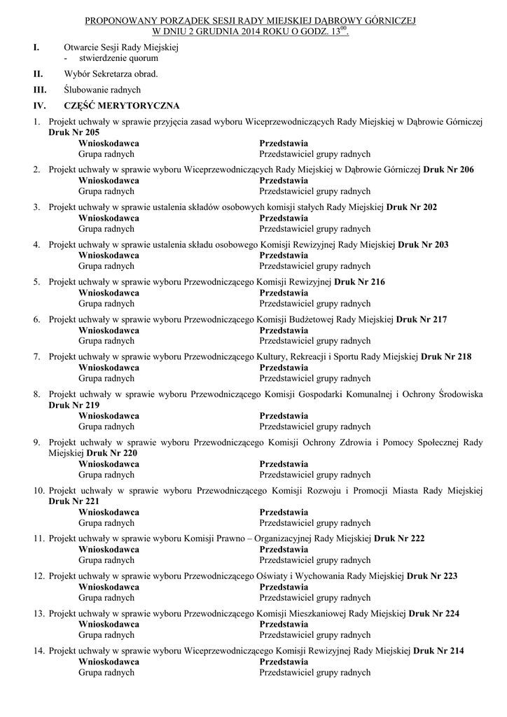 PROPONOWANY PORZĄDEK SESJI RADY MIEJSKIEJ DĄBROWY GÓRNICZEJ W DNIU 2 GRUDNIA 2014 ROKU O GODZ. 1300. I. Otwarcie Sesji Rady Miejskiej - stwierdzenie quorum II. Wybór Sekretarza obrad. III. Ślubowanie radnych IV. CZĘŚĆ MERYTORYCZNA 1. Projekt uchwały w sprawie przyjęcia zasad wyboru Wiceprzewodniczących Rady Miejskiej w Dąbrowie Górniczej Druk Nr 205 Wnioskodawca Przedstawia Grupa radnych Przedstawiciel grupy radnych 2. Projekt uchwały w sprawie wyboru Wiceprzewodniczących Rady Miejskiej w Dąbrowie Górniczej Druk Nr 206 Wnioskodawca Przedstawia Grupa radnych Przedstawiciel grupy radnych 3. Projekt uchwały w sprawie ustalenia składów osobowych komisji stałych Rady Miejskiej Druk Nr 202 Wnioskodawca Przedstawia Grupa radnych Przedstawiciel grupy radnych 4. Projekt uchwały w sprawie ustalenia składu osobowego Komisji Rewizyjnej Rady Miejskiej Druk Nr 203 Wnioskodawca Przedstawia Grupa radnych Przedstawiciel grupy radnych 5. Projekt uchwały w sprawie wyboru Przewodniczącego Komisji Rewizyjnej Druk Nr 216 Wnioskodawca Przedstawia Grupa radnych Przedstawiciel grupy radnych 6. Projekt uchwały w sprawie wyboru Przewodniczącego Komisji BudŜetowej Rady Miejskiej Druk Nr 217 Wnioskodawca Przedstawia Grupa radnych Przedstawiciel grupy radnych 7. Projekt uchwały w sprawie wyboru Przewodniczącego Kultury, Rekreacji i Sportu Rady Miejskiej Druk Nr 218 Wnioskodawca Przedstawia Grupa radnych Przedstawiciel grupy radnych 8. Projekt uchwały w sprawie wyboru Przewodniczącego Komisji Gospodarki Komunalnej i Ochrony Środowiska Druk Nr 219 Wnioskodawca Przedstawia Grupa radnych Przedstawiciel grupy radnych 9. Projekt uchwały w sprawie wyboru Przewodniczącego Komisji Ochrony Zdrowia i Pomocy Społecznej Rady Miejskiej Druk Nr 220 Wnioskodawca Przedstawia Grupa radnych Przedstawiciel grupy radnych 10. Projekt uchwały w sprawie wyboru Przewodniczącego Komisji Rozwoju i Promocji Miasta Rady Miejskiej Druk Nr 221 Wnioskodawca Przedstawia Grupa radnych Przedstawiciel grupy radnych 11. Projekt uchwały w sprawie wyboru Komisji Prawno – Organizacyjnej Rady Miejskiej Druk Nr 222 Wnioskodawca Przedstawia Grupa radnych Przedstawiciel grupy radnych 12. Projekt uchwały w sprawie wyboru Przewodniczącego Oświaty i Wychowania Rady Miejskiej Druk Nr 223 Wnioskodawca Przedstawia Grupa radnych Przedstawiciel grupy radnych 13. Projekt uchwały w sprawie wyboru Przewodniczącego Komisji Mieszkaniowej Rady Miejskiej Druk Nr 224 Wnioskodawca Przedstawia Grupa radnych Przedstawiciel grupy radnych 14. Projekt uchwały w sprawie wyboru Wiceprzewodniczącego Komisji Rewizyjnej Rady Miejskiej Druk Nr 214 Wnioskodawca Przedstawia Grupa radnych Przedstawiciel grupy radnych 15. Projekt uchwały w sprawie wyboru Wiceprzewodniczącego Komisji BudŜetowej Rady Miejskiej Druk Nr 215 Wnioskodawca Przedstawia Grupa radnych Przedstawiciel grupy radnych 16. Projekt uchwały w sprawie wyboru Wiceprzewodniczącego Kultury, Rekreacji i Sportu Rady Miejskiej Druk Nr 207 Wnioskodawca Przedstawia Grupa radnych Przedstawiciel grupy radnych 17. Projekt uchwały w sprawie wyboru Wiceprzewodniczącego Gospodarki Komunalnej i Ochrony Środowiska Rady Miejskiej Druk Nr 208 Wnioskodawca Przedstawia Grupa radnych Przedstawiciel grupy radnych 18. Projekt uchwały w sprawie wyboru Wiceprzewodniczącego Ochrony Zdrowia i Pomocy Społecznej Rady Miejskiej Druk Nr 209 Wnioskodawca Przedstawia Grupa radnych Przedstawiciel grupy radnych 19. Projekt uchwały w sprawie wyboru Wiceprzewodniczącego Rozwoju i Promocji Miasta Rady Miejskiej Druk Nr 210 Wnioskodawca Przedstawia Grupa radnych Przedstawiciel grupy radnych 20. Projekt uchwały w sprawie wyboru Wiceprzewodniczącego Prawno – Organizacyjnej Druk Nr 211 Wnioskodawca Przedstawia Grupa radnych Przedstawiciel grupy radnych Rady Miejskiej 21. Projekt uchwały w sprawie wyboru Wiceprzewodniczącego Oświaty i Wychowania Rady Miejskiej Druk Nr 212 Wnioskodawca Przedstawia Grupa radnych Przedstawiciel grupy radnych 22. Projekt uchwały w sprawie wyboru Wiceprzewodniczącego Mieszkaniowej Rady Miejskiej Druk Nr 213 Wnioskodawca Przedstawia Grupa radnych Przedstawiciel grupy radnych 23. Projekt uchwały w sprawie ustalenia składu osobowego Komisji BudŜetowej Druk Nr 204 Wnioskodawca Przedstawia Grupa radnych Przedstawiciel grupy radnych V. VI. VII. Interpelacje i zapytania. Oświadczenia. Wolne wnioski. VIII. Zakończenie sesji -2-