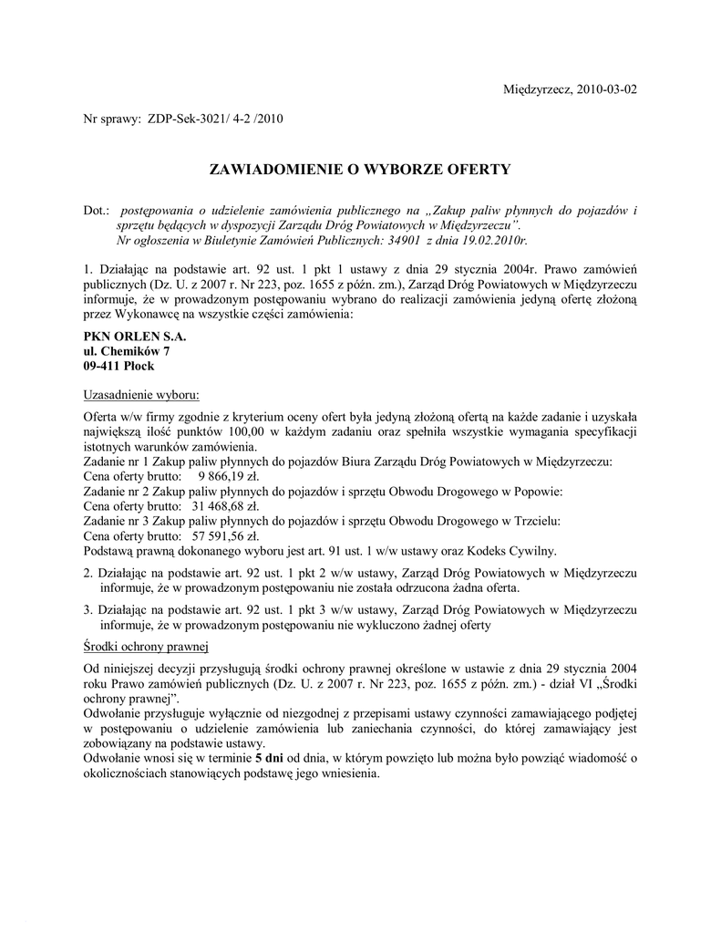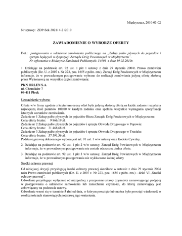 Międzyrzecz, 2010-03-02 Nr sprawy: ZDP-Sek-3021/ 4-2 /2010 ZAWIADOMIENIE O WYBORZE OFERTY Dot.: postępowania o udzielenie zamówienia publicznego na „Zakup paliw płynnych do pojazdów i sprzętu będących w dyspozycji Zarządu Dróg Powiatowych w Międzyrzeczu”. Nr ogłoszenia w Biuletynie Zamówień Publicznych: 34901 z dnia 19.02.2010r. 1. Działając na podstawie art. 92 ust. 1 pkt 1 ustawy z dnia 29 stycznia 2004r. Prawo zamówień publicznych (Dz. U. z 2007 r. Nr 223, poz. 1655 z późn. zm.), Zarząd Dróg Powiatowych w Międzyrzeczu informuje, że w prowadzonym postępowaniu wybrano do realizacji zamówienia jedyną ofertę złożoną przez Wykonawcę na wszystkie części zamówienia: PKN ORLEN S.A. ul. Chemików 7 09-411 Płock Uzasadnienie wyboru: Oferta w/w firmy zgodnie z kryterium oceny ofert była jedyną złożoną ofertą na każde zadanie i uzyskała największą ilość punktów 100,00 w każdym zadaniu oraz spełniła wszystkie wymagania specyfikacji istotnych warunków zamówienia. Zadanie nr 1 Zakup paliw płynnych do pojazdów Biura Zarządu Dróg Powiatowych w Międzyrzeczu: Cena oferty brutto: 9 866,19 zł. Zadanie nr 2 Zakup paliw płynnych do pojazdów i sprzętu Obwodu Drogowego w Popowie: Cena oferty brutto: 31 468,68 zł. Zadanie nr 3 Zakup paliw płynnych do pojazdów i sprzętu Obwodu Drogowego w Trzcielu: Cena oferty brutto: 57 591,56 zł. Podstawą prawną dokonanego wyboru jest art. 91 ust. 1 w/w ustawy oraz Kodeks Cywilny. 2. Działając na podstawie art. 92 ust. 1 pkt 2 w/w ustawy, Zarząd Dróg Powiatowych w Międzyrzeczu informuje, że w prowadzonym postępowaniu nie została odrzucona żadna oferta. 3. Działając na podstawie art. 92 ust. 1 pkt 3 w/w ustawy, Zarząd Dróg Powiatowych w Międzyrzeczu informuje, że w prowadzonym postępowaniu nie wykluczono żadnej oferty Środki ochrony prawnej Od niniejszej decyzji przysługują środki ochrony prawnej określone w ustawie z dnia 29 stycznia 2004 roku Prawo zamówień publicznych (Dz. U. z 2007 r. Nr 223, poz. 1655 z późn. zm.) - dział VI „Środki ochrony prawnej”. Odwołanie przysługuje wyłącznie od niezgodnej z przepisami ustawy czynności zamawiającego podjętej w postępowaniu o udzielenie zamówienia lub zaniechania czynności, do której zamawiający jest zobowiązany na podstawie ustawy. Odwołanie wnosi się w terminie 5 dni od dnia, w którym powzięto lub można było powziąć wiadomość o okolicznościach stanowiących podstawę jego wniesienia.