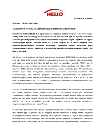 Informacja prasowa Wyględy, 28 sierpnia 2009 r. Rekordowe wyniki HELIO powyżej oczekiwań analityków Bakaliowa Spółka HELIO S.A. opublikowała raport za ostatni kwartał roku obrotowego 2008/2009. Jak wskazują prezentowane dane, miniony rok był dla Spółki rekordowy zarówno pod względem uzyskanych przychodów ze sprzedaży jak i zysków. W ujęciu narastającym Spółka zarobiła netto aż o 47% więcej niż w roku ubiegłym przy piętnastoprocentowym wzroście sprzedaży. Znakomite wyniki finansowe jakie zaprezentował Emitent, świadczą o utrzymaniu wysokiej dynamiki rozwoju Spółki i jej dobrej kondycji. Jak donosi raport okresowy za ostatni kwartał roku obrotowego 2008/2009 (rok obrotowy spółki trwa od 1 lipca do 30 czerwca), HELIO wypracowało na przestrzeni ostatnich czterech kwartałów zysk netto na poziomie 5.912 tys. zł, zaś przychody ze sprzedaży wyniosły 72.067 tys. zł. Odnosząc powyższe rezultaty do danych za analogiczny okres ubiegłego roku (lipiec 2007 – czerwiec 2008), Spółka odnotowała 15 procentowy wzrost sprzedaży przy 47 procentowym wzroście zysku netto. Pomyślność prezentowanych wyników potwierdza dodatkowo fakt, że przewyższają one ostatnie prognozy analityków zaprezentowane w pozytywnych rekomendacjach domów maklerskich (raporty analityczne BM Banku BGŻ S.A. z dn. 07.05.2009 oraz DM AmerBrokers z dn. 16.07.2009 r.), co świadczy o znacznym niedowartościowaniu akcji bakaliowego potentata na warszawskim parkiecie. – Liczę, że wyniki ostatniego roku zadowolą nawet wymagających akcjonariuszy – skomentował Pan Leszek Wąsowicz, Prezes Zarządu HELIO S.A. - Odnotowany wzrost jest wymiernym i oczekiwanym efektem przyjętej i konsekwentnie realizowanej strategii rozwoju, który mam nadzieję zachęci do nas także nowych inwestorów. Wierzę jednocześnie, że kolejne lata przyniosą kolejne rekordy, do których niewątpliwe przybliża nas budowa nowego kompleksu produkcyjnomagazynowego w Brochowie – dodał Prezes. W kontekście prezentowanych wyników, godnym komentarza są również dane za ostatni kwartał roku obrotowego 2008/2009. HELIO osiągnęło bowiem rekordowe w swojej historii przychody ze sprzedaży w okresie kwiecień – czerwiec, które wyniosły 7.811 tys. zł i były o 45% większe niż w analogicznym okresie ubiegłego roku obrotowego. Wzrost sprzedaży w połączeniu z efektywną polityką kosztową zaowocowały zaś zredukowaniem charakterystycznej dla czwartego kwartału starty. Na tle historii naszej działalności okres kwiecień – czerwiec corocznie cechował się ujemnym wynikiem netto, ponieważ jest to czas, w którym sprzedaż bakalii spada, a jednocześnie ze względu na rosnącą skalę działalności przedsiębiorstwa, Spółka dokonuje zwiększonych zakupów surowca oraz produkcji do obsłużenia przyszłej sprzedaży – wyjaśnił Prezes Wąsowicz – Zniwelowanie zeszłorocznej straty o ponad 80% jest zatem dużym sukcesem, który pozwolił utrzymać wysoki wynik wcześniejszych kwartałów bieżącego roku. Mam jednocześnie nadzieję, że wzrost zainteresowania bakaliami w okresach deficytowych przyczyni się również do poprawy wyników w przyszłych latach – dodał na zakończenie Prezes. Wyniki finansowe HELIO S.A. (w tys. zł) IV kwartał roku 2008/2009 01.04-30.06.2009 Analogiczny kwartał roku 2007/2008 01.04-30.06.2008 Cztery kwartały narastająco roku 2008/2009 01.07.2008 30.06.2009 Analogiczne cztery kwartały narastająco roku 2007/2008 01.07.2007 - 30.06.2008 Przychody ze sprzedaży 7.811 5.378 72.067 62.648 Zysk netto -137 -731 5.912 4.014 Zysk netto (w mln. PLN) Przychody ze sprzedaży (w mln. PLN) 80 7 70 6 60 5 4 50 3 40 2 30 1 20 - 10 -1 - -2 kwiecień czerwiec 2008 kwiecień - czerwiec kwiecień - czerwiec lipiec 2007 - czerwiec lipiec 2008 - czerwiec 2008 2009 2008 2009 kwiecień czerwiec 2009 lipiec 2007 czerwiec 2008 lipiec 2008 czerwiec 2009 * * * Podstawowe informacje o Spółce: HELIO S.A. jest czołowym importerem i dystrybutorem bakalii oraz liderem na rynku producentów mas makowych. Poza produktami z maku w ofercie HELIO znajdują się orzechy, owoce suszone i kandyzowane oraz ziarna. Spółka oferuje swoje produkty pod markami: HELIO, Słoneczne Owoce, Bona do największych sieci handlowych, hurtowni i sklepów spożywczych w Polsce, a także zaopatruje pod markami własnymi (tzw. private labels) m.in. Auchan, E.Leclerc, JMD „Biedronka”, Real, czy Tesco. Firma powstała w 1992 roku. Zakłady produkcyjne spółki zlokalizowane są w Wyględach, k. Warszawy, gdzie znajdują się m.in. najnowocześniejsze automaty paczkujące oraz autorska linia do produkcji masy makowej. Ze względu na dynamicznie rosnącą skalę działalności, HELIO jest obecnie w trakcie budowy nowego kompleksu produkcyjno-magazynowego w Brochowie pod Sochaczewem. W 2003 roku Spółka, jako pierwsza firma z branży bakaliowej w Polsce, otrzymała certyfikat jakości HACCP, nadany przez TÜV Rheinland Group. W latach 2005-2009 HELIO jedenastokrotnie uhonorowane zostało godłami „Laur Konsumenta” w kategoriach „Bakalie” oraz „Dodatki do ciast”. Od kwietnia 2007 r. papiery wartościowe spółki notowane są na Giełdzie Papierów Wartościowych w Warszawie. Kontakt: Grzegorz Sobociński HELIO S.A. [email protected] Tel. (22) 796 32 16 Dodatkowe informacje o Spółce oraz jej produktach: www.helio.pl
