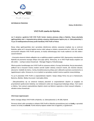 INFORMACJA PRASOWA Kielce, 03.08.2016 r. VIVE Profit zawita do Rybnika. Już 5 sierpnia o godzinie 9.00 VIVE Profit Center otwiera pierwszy sklep w Rybniku. Nowa placówka ogólnopolskiej sieci z niepowtarzalną odzieżą używaną zlokalizowana będzie przy ul. Zebrzydowickiej 3. To już 23 wielkopowierzchniowy punkt handlowy VIVE Profit w Polsce. Nowy sklep ogólnopolskiej sieci sprzedaży detalicznej odzieży używanej znajduje się w centrum Rybnika, gdzie od 5 sierpnia będzie można robić zakupy w lokalu o powierzchni ok. 1195 m2. Szeroki asortyment sklepów VIVE Profit sprawia, że każdy odwiedzający bez trudu wybierze coś dla siebie i swoich bliskich. - Uroczyste otwarcie lokalu odbędzie się w najbliższy piątek o godzinie 9.00. Zapraszamy mieszkańców Rybnika do poznania naszego sklepu oraz jego oferty. Wierzymy, że w VIVE Profit każdy znajdzie coś dla siebie. – zachęca Łukasz Kowalczyk - Manager Regionu Południowego. Oferta punktu handlowego sieci VIVE Profit to używana odzież z Europy Zachodniej. Na jej wieszakach, półkach lub w koszach można znaleźć szeroki wybór odzieży znanych marek, ale również obuwie, akcesoria i dodatki do domu. Cechą charakterystyczną sklepu jest całkowita wymiana asortymentu w tygodniowym cyklu. Oznacza to, że co tydzień w sprzedaży znaleźć można zupełnie nową kolekcję. To już 6 placówka VIVE Profit w województwie śląskim. Swoje sklepy firma ma już w Katowicach, Bytomiu, Bielsko- Białej, Knurowie i Jastrzębiu Zdrój. - Zdecydowaliśmy się na otwarcie kolejnej placówki w województwie śląskim ze względu na przychylność społeczności lokalnej. Już niebawem czeka nas inauguracja kolejnego sklepu. Tym razem w Zabrzu. Tym samym województwo śląskim stanie się liderem regionów w ilości naszych sklepów. – zdradza Łukasz Kowalczyk. Informacje organizacyjne: Adres nowego sklepu VIVE Profit w Rybniku: ul. Zebrzydowicka 3, 44-200, Rybnik Pierwszy dzień cyklu sprzedaży w sklepie VIVE Profit w Rybniku przewidziany jest na środę, a sprzedaż towaru na torby na wtorek. Punkt otwarty będzie siedem dni w tygodniu, w godzinach: VIVE Profit Center Sp. z o.o. 25-663 Kielce, ul. K. Olszewskiego 6 Tel. +48 (41) 347 63 50 Fax +48 (41) 347 63 55 www.vive.com.pl NIP 959 171 47 17, REGON 260058950 Poniedziałek Wrotek Środa Czwartek Piątek Sobota Niedziela 9:00 – 19:00 8:00 – 20:00 8:00 – 20:00 9:00 – 19:00 9:00 – 19:00 9:00 – 19:00 10:00 – 18:00 Adresy innych punktów VIVE Profit w Polsce można sprawdzić na mapie: http://www.viveprofit.pl/znajdz-sklep/ Zapraszamy na zakupy. Kontakt dla mediów: Ewelina Rozpara, Manager ds. PR i Projektów Marketingowych tel. +48 (41) 347 63 50 wew. 269 kom. 723 184 218 [email protected] Magdalena Chłopek, Specjalista ds. komunikacji wewnętrznej i PR kom. 723 172 524 [email protected] VIVE Profit Center Spółka wchodząca w skład VIVE Group, zajmująca się rozwojem i zarządzaniem sieci wielkopowierzchniowych sklepów z niepowtarzalną odzieżą – VIVE Profit. Obecnie spółka posiada kilkadziesiąt sklepów detalicznych w Polsce centralnej ,południowej i wschodniej, stale rozbudowując sieć w całym kraju. Duża powierzchnia każdego sklepu daje klientom ogromny wybór i pozwala na dokonywanie zakupów w komfortowych warunkach, a oferowany towar w zależności od rodzaju, eksponowany jest na wieszakach, półkach lub w koszach. Każdy ze sklepów sieci oferuje klientom ponad 100 000 sztuk markowej odzieży w cyklu 7 dniowym. Po tygodniu następuje całkowita wymiana asortymentu. Grupa VIVE Dziewięć powiązanych ze sobą spółek, z których główna – VIVE Textile Recycling, została założona w 1992 roku i od wielu lat jest liderem w branży recyclingu tekstyliów. Grupa VIVE nieustannie rozwija działalność w kolejnych obszarach, takich jak transport i logistyka, optymalizacja kosztów ponoszonych przez przedsiębiorstwa, czy innowacyjne metody recyklingu. W skład grupy wchodzą: VIVE Textile Recycling, VIVE Transport, VIVE Profit Center, VIVE Properties, VIVE Biznes, VIVE Innovation, VIVE Retail Services, Dimatex i Eco-Collections. Jednocześnie, jako przedsiębiorca odpowiedzialny społecznie, VIVE Group wspiera działalność Klubu Sportowego VIVE Kielce oraz Fundacji VIVE Serce Dzieciom. VIVE Profit Center Sp. z o.o. 25-663 Kielce, ul. K. Olszewskiego 6 Tel. +48 (41) 347 63 50 Fax +48 (41) 347 63 55 www.vive.com.pl NIP 959 171 47 17, REGON 260058950