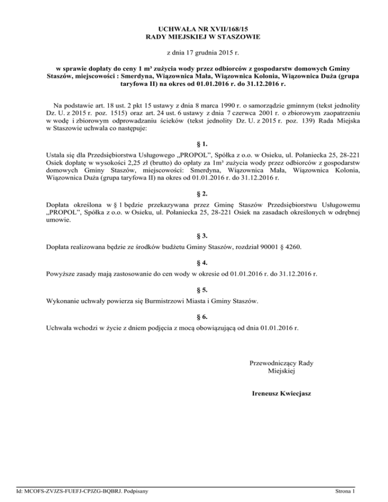 UCHWAŁA NR XVII/168/15 RADY MIEJSKIEJ W STASZOWIE z dnia 17 grudnia 2015 r. w sprawie dopłaty do ceny 1 m³ zużycia wody przez odbiorców z gospodarstw domowych Gminy Staszów, miejscowości : Smerdyna, Wiązownica Mała, Wiązownica Kolonia, Wiązownica Duża (grupa taryfowa II) na okres od 01.01.2016 r. do 31.12.2016 r. Na podstawie art. 18 ust. 2 pkt 15 ustawy z dnia 8 marca 1990 r. o samorządzie gminnym (tekst jednolity Dz. U. z 2015 r. poz. 1515) oraz art. 24 ust. 6 ustawy z dnia 7 czerwca 2001 r. o zbiorowym zaopatrzeniu w wodę i zbiorowym odprowadzaniu ścieków (tekst jednolity Dz. U. z 2015 r. poz. 139) Rada Miejska w Staszowie uchwala co następuje: § 1. Ustala się dla Przedsiębiorstwa Usługowego „PROPOL”, Spółka z o.o. w Osieku, ul. Połaniecka 25, 28-221 Osiek dopłatę w wysokości 2,25 zł (brutto) do opłaty za 1m³ zużycia wody przez odbiorców z gospodarstw domowych Gminy Staszów, miejscowości: Smerdyna, Wiązownica Mała, Wiązownica Kolonia, Wiązownica Duża (grupa taryfowa II) na okres od 01.01.2016 r. do 31.12.2016 r. § 2. Dopłata określona w § 1 będzie przekazywana przez Gminę Staszów Przedsiębiorstwu Usługowemu „PROPOL”, Spółka z o.o. w Osieku, ul. Połaniecka 25, 28-221 Osiek na zasadach określonych w odrębnej umowie. § 3. Dopłata realizowana będzie ze środków budżetu Gminy Staszów, rozdział 90001 § 4260. § 4. Powyższe zasady mają zastosowanie do cen wody w okresie od 01.01.2016 r. do 31.12.2016 r. § 5. Wykonanie uchwały powierza się Burmistrzowi Miasta i Gminy Staszów. § 6. Uchwała wchodzi w życie z dniem podjęcia z mocą obowiązującą od dnia 01.01.2016 r. Przewodniczący Rady Miejskiej Ireneusz Kwiecjasz Id: MCOFS-ZVJZS-FUEFJ-CPJZG-BQBRJ. Podpisany Strona 1 Uzasadnienie do Uchwały Nr XVII/168/15 Rady Miejskiej w Staszowie z dnia 17 grudnia 2015 r. W przedłożonych przez Przedsiębiorstwo Produkcyjno Usługowe „PROPOL”, Spółka z o.o. w Osieku, ul. Połaniecka 25, 28-221 Osiek taryfach na zbiorowe zaopatrzenie w wodę miejscowości: Smerdyna, Wiązownica Mała, Wiązownica Kolonia, Wiązownica Duża, gmina Staszów na okres od 01.01.2016 r. do 31.12.2016 r. określona została grupa taryfowa II – gospodarstwa dmowe do celów socjalno-bytowych z terenu Gminy Staszów, miejscowości: Smerdyna, Wiązownica Mała, Wiązownica Kolonia, Wiązownica Duża , w której cena za 1m³ wody wynosi 6,06 zł brutto (słownie: sześć złotych 06/100). Porównując stawkę za 1m³ wody przedłożoną przez Przedsiębiorstwo „PROPOL” do stawki obowiązującej dla pozostałych miejscowości z terenu Gminy Staszów, zaopatrywanych w wodę przez Przedsiębiorstwo Gospodarki Komunalnej i Mieszkaniowej w Staszowie, Spółka Gminy z o.o., ul. Wojska Polskiego 3, 28-200 Staszów, która wynosi 3,46 zł brutto za 1m³, uznać należy, iż cena ustalona przez Przedsiębiorstwo Produkcyjno Usługowe „PROPOL”, Spółka z o.o. w Osieku, ul. Połaniecka 25, 28-221 Osiek stanowi znaczne, dodatkowe obciążenie finansowe dla mieszkańców ww. miejscowości. W związku z powyższym uznano za uzasadnioną dopłatę w wysokości 2,25 zł brutto do ceny 1m³ zużytej wody przez odbiorców z gospodarstw domowych Gminy Staszów, miejscowości: Smerdyna, Wiązownica Mała, Wiązownica Kolonia, Wiązownica Duża na okres od 01.01.2016 r. do 31.12.2016 r. Przedmiotowa dopłata stanowić będzie rekompensatę różnicy ceny ustalonej przez Przedsiębiorstwo Produkcyjno Usługowe „PROPOL”, Spółka z o.o. w Osieku, ul. Połaniecka 25, 28-221 Osiek dla ww. miejscowości, a ceną ustaloną przez Przedsiębiorstwo Gospodarki Komunalnej i Mieszkaniowej w Staszowie, Spółka Gminy z o.o., ul. Wojska Polskiego 3, 28-200 Staszów dla pozostałych miejscowości z terenu Gminy Staszów. Id: MCOFS-ZVJZS-FUEFJ-CPJZG-BQBRJ. Podpisany Strona 1