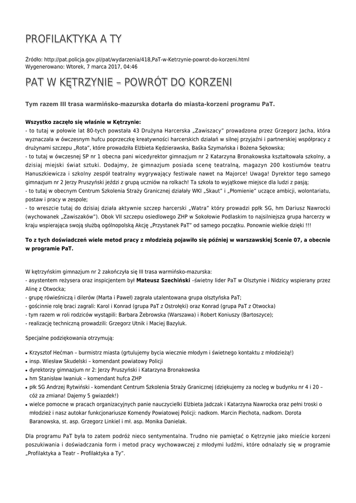 PROFILAKTYKA A TY Źródło: http://pat.policja.gov.pl/pat/wydarzenia/418,PaT-w-Ketrzynie-powrot-do-korzeni.html Wygenerowano: Wtorek, 7 marca 2017, 04:46 PAT W KĘTRZYNIE – POWRÓT DO KORZENI Tym razem III trasa warmińsko-mazurska dotarła do miasta-korzeni programu PaT. Wszystko zaczęło się właśnie w Kętrzynie: - to tutaj w połowie lat 80-tych powstała 43 Drużyna Harcerska „Zawiszacy” prowadzona przez Grzegorz Jacha, która wyznaczała w ówczesnym hufcu poprzeczkę kreatywności harcerskich działań w silnej przyjaźni i partnerskiej współpracy z drużynami szczepu „Rota”, które prowadziła Elżbieta Kędzierawska, Baśka Szymańska i Bożena Sękowska; - to tutaj w ówczesnej SP nr 1 obecna pani wicedyrektor gimnazjum nr 2 Katarzyna Bronakowska kształtowała szkolny, a dzisiaj miejski świat sztuki. Dodajmy, że gimnazjum posiada scenę teatralną, magazyn 200 kostiumów teatru Hanuszkiewicza i szkolny zespół teatralny wygrywający festiwale nawet na Majorce! Uwaga! Dyrektor tego samego gimnazjum nr 2 Jerzy Pruszyński jeździ z grupą uczniów na rolkach! Ta szkoła to wyjątkowe miejsce dla ludzi z pasją; - to tutaj w obecnym Centrum Szkolenia Straży Granicznej działały WKI „Skaut” i „Płomienie” uczące ambicji, wolontariatu, postaw i pracy w zespole; - to wreszcie tutaj do dzisiaj działa aktywnie szczep harcerski „Watra” który prowadzi ppłk SG, hm Dariusz Nawrocki (wychowanek „Zawiszaków”). Obok VII szczepu osiedlowego ZHP w Sokołowie Podlaskim to najsilniejsza grupa harcerzy w kraju wspierająca swoją służbą ogólnopolską Akcję „Przystanek PaT” od samego początku. Ponownie wielkie dzięki !!! To z tych doświadczeń wiele metod pracy z młodzieżą pojawiło się później w warszawskiej Scenie 07, a obecnie w programie PaT. W kętrzyńskim gimnazjum nr 2 zakończyła się III trasa warmińsko-mazurska: - asystentem reżysera oraz inspicjentem był Mateusz Szechiński –świetny lider PaT w Olsztynie i Nidzicy wspierany przez Alinę z Otwocka; - grupę rówieśniczą i dilerów (Marta i Paweł) zagrała utalentowana grupa olsztyńska PaT; - gościnnie rolę braci zagrali: Karol i Konrad (grupa PaT z Ostrołęki) oraz Konrad (grupa PaT z Otwocka) - tym razem w roli rodziców wystąpili: Barbara Żebrowska (Warszawa) i Robert Koniuszy (Bartoszyce); - realizację techniczną prowadzili: Grzegorz Utnik i Maciej Bazyluk. Specjalne podziękowania otrzymują: ● Krzysztof Hećman – burmistrz miasta (grtulujemy bycia wiecznie młodym i świetnego kontaktu z młodzieżą!) ● insp. Wiesław Skudelski – komendant powiatowy Policji ● dyrektorzy gimnazjum nr 2: Jerzy Pruszyński i Katarzyna Bronakowska ● hm Stanisław Iwaniuk – komendant hufca ZHP ● płk SG Andrzej Rytwiński - komendant Centrum Szkolenia Straży Granicznej (dziękujemy za nocleg w budynku nr 4 i 20 – cóż za zmiana! Dajemy 5 gwiazdek!) ● wielce pomocne w pracach organizacyjnych panie nauczycielki Elżbieta Jadczak i Katarzyna Nawrocka oraz pełni troski o młodzież i nasz autokar funkcjonariusze Komendy Powiatowej Policji: nadkom. Marcin Piechota, nadkom. Dorota Baranowska, st. asp. Grzegorz Linkiel i mł. asp. Monika Danielak. Dla programu PaT była to zatem podróż nieco sentymentalna. Trudno nie pamiętać o Kętrzynie jako mieście korzeni poszukiwania i doświadczania form i metod pracy wychowawczej z młodymi ludźmi, które odnalazły się w programie „Profilaktyka a Teatr – Profilaktyka a Ty”. Zdjęcia: Robert Koniuszy Ocena: 3.5/5 (4) Tweetnij
