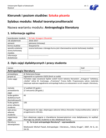 Uniwersytet Śląski w Katowicach Wydział str. 1 Kierunek i poziom studiów: Sztuka pisania Sylabus modułu: Moduł teoretycznoliteracki Nazwa wariantu modułu: Antropologia literatury 1. Informacje ogólne koordynator modułu rok akademicki semestr forma studiów sposób ustalania oceny końcowej modułu informacje dodatkowe Dr hab. Grzegorz Olszański 2016-2017 pierwszy (zimowy) Stacjonarne ocena końcowa z danego kursu jest równoważna ocenie końcowej modułu ------------------------------ 2. Opis zajęć dydaktycznych i pracy studenta nazwa Antropologia literatury prowadzący grupa(-y) treści zajęć dr Katarzyna Szopa logowanie w systemie USOS (limit xx osób) metody prowadzenia zajęć liczba godzin dydaktycznych (kontaktowych) liczba godzin pracy własnej studenta opis pracy własnej studenta organizacja zajęć literatura obowiązkowa 1/ wykład (15 godz.) 2/ ćwiczenia (30 godz.) kod -------------- Tematyka zajęć oscylować będzie wokół trzech tekstów literackich: „Antygona” Sofoklesa, „Hańba” Johna M. Coetzeego, „Przemiana” Franza Kafki. Proponowany zakres materiału obejmuje wybrane zagadnienia antropologii kultury ze wskazaniem na ich związki z literaturą. 45 135 Przygotowanie do zajęć, obejmujące zalecone lektury literackie i krytycznoliterackie; udział w przygotowaniu referatu. Kurs obejmuje zajęcia o charakterze konwersatorium oraz dedykowany im wykład. Wymaga się udziału studenta w obu składowych kursu. 1) Co to jest antropologia literatury? – wprowadzenie Markowski Michał Paweł, Antropologia i literatura, „Teksty Drugie”, 2007, Nr 6, str. 24-33. Uniwersytet Śląski w Katowicach Wydział str. 2 Nycz Ryszard, Antropologia literatury – kulturowa teoria literatury – poetyka doświadczenia, „Teksty Drugie”, 2007, Nr 6, str. 34-49. 2) Antygona Sofoklesa pokrewieństwo i genealogia – ujęcie psychoanalityczne: Zygmunt Freud: Totem i tabu. Przeł. J. Prokopiuk, M. Poręba. Warszawa 1993. Luce Irigaray: Ciało-w-ciało z matką. Przeł. A. Araszkiewicz. Kraków 2000. Izabela Kowalczyk, Ewa Majewska: Kompleks Antygony. W: Encyklopedia gender. Płeć w kulturze. Red. M. Rudaś-Grodzka, et al. Warszawa 2014. konflikt rodzinny – perspektywa feministyczna: Judith Butler: Żądanie Antygony. Rodzina między życiem a śmiercią. Przeł. M. Borowski, M. Sugiera. Kraków 2010. (rozdział I) Agata Araszkiewicz: Poza zakazem kazirodztwa. „Przegląd Filozoficzno-Literacki” 2003, nr 1(3). Joanna Mizielińska: Kim jest Antygona? Rozważania o pokrewieństwie. W: Tejże: Płeć, ciało, seksualność. Od feminizmu do teorii queer. Kraków 2006. konflikt płci – perspektywa genderowa: Anna Łebkowska: Gender. W: Kulturowa teoria literatury. Główne pojęcia i problemy. T. 1. Red. M.P. Markowski, R. Nycz. Kraków 2012. polityka pamięci: Judith Butler: Przedmowa: Kruche życie, życie godne opłakiwania. W: Tejże: Ramy wojny. Kiedy życie jest godne opłakiwania? Przeł. A. Czarnacka. Warszawa 2011. prawo boskie a prawo świeckie: Judith Butler: Polityka płci, tortury i czas świecki. Przeł. J. Dobrowolski. W: Tożsamość i obywatelstwo w społeczeństwie wielokulturowym. Red. E. Oleksy. Warszawa 2008. ekologia: Bruno Latour: Polityka natury. Przeł. A. Czarnacka. Warszawa 2009. (wybrany rozdział) filozofia miłości: Luce Irigaray: Etyka wzajemnego rozpoznania. Przeł. M. Glosowitz. „Opcje” 2014, nr 4. Dorota Głowacka: Miłość i strach, czyli afektywne aporie demokracji. W: Pamięć i afekty. Red. Z. Budrewicz. Warszawa 2014. teorie afektywne: Sarah Ahmed: Ekonomie afektywne. Przeł. M. Glosowitz. „Opcje” 2013, nr 1-2. Katarzyna Bojarska: Poczuć myślenie: afektywne procedury historii i krytyki (dziś). „Teksty Drugie” 2016, nr 2. 2) John M. Coetzee: Hańba G.Ch. Spivak: Czy podporządkowani Inni mogą przemówić? Przeł. E. Majewska. „Krytyka Polityczna” 2011, nr 24–25. 3) Franz Kafka: Przemiana. Uniwersytet Śląski w Katowicach Wydział str. 3 Braidotti, Rosi: Po człowieku. Przeł. J. Bednarek. Warszawa 2014. (fragmenty) Deleuze, Gilles i Guattari, Felix: Stawanie-się-intensywnym, stawanie-sięzwierzęciem, stawanie-się-niedostrzegalnym. W: Tychże: Tysiąc Plateau. Przeł. M. Herer. Warszawa 2015. LaCapra, Dominick: Powrót do pytania o to, co ludzkie i zwierzęce. Przeł. K. Bojarska. W: Teoria wiedzy o przeszłości na tle współczesnej humanistyki. Red. E. Domańska. Poznań 2010. Żychliński, Arkadiusz: Laboratorium antropofikcji. Dociekania filologiczne. Warszawa 2014. literatura uzupełniająca Ewa Kosowska, Anna Gomóła, Eugeniusz Jaworski (red.): Antropologia kultury – antropologia literatury. Na tropach koligacji. Katowice 2007. Michał Paweł Markowski, Ryszard Nycz (red.): Kulturowa Teoria Literatury. Główne pojęcia i problemy. Kraków 2006. Teresa Walas, Ryszard Nycz (red.): Kulturowa teoria literatury 2. Poetyki, problematyki, interpretacje. Kraków 2012. adres strony www zajęć informacje dodatkowe 3. Opis sposobów weryfikacji efektów kształcenia modułu Nazwa Antropologia literatury kod zajęć kod ------------------------- 02-PI-S1-AL osoba dr Katarzyna Szopa przeprowadzająca weryfikację grupa wymagania Podstawą zaliczenia jest aktywny udział w zajęciach oraz przygotowanie prezentacji merytoryczne na wybrany przez siebie temat związany z zagadnieniami omawianymi w trakcie zajęć. kryteria oceny Obecność i aktywność na zajęciach, przygotowanie referatu. Średnia ocen. przebieg procesu Na pierwszych zajęciach studenci zostaną zapoznani z sylabusem zajęć i z weryfikacji warunkami zaliczenia. informacje dodatkowe