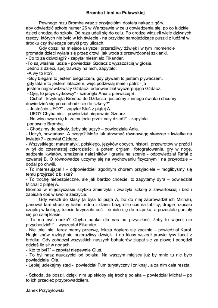 Bromba I inni na Puławskiej Pewnego razu Bromba wraz z przyjaciółmi dostała nakaz z góry, aby odwiedzić szkołę numer 26 w Warszawie w celu dowiedzenia się, po co ludzkie dzieci chodzą do szkoły. Od razu udali się do celu. Po drodze widzieli wiele dziwnych rzeczy. których nie było w ich świecie - na przykład samojeŜdŜące puszki z ludźmi w środku czy świecące patyki przy ulicach. Gdy doszli na miejsce usłyszeli przeraźliwy dźwięk i w tym momencie gromada dzieci wylała się przez drzwi, jak woda z przewróconej szklanki. - Co to za dziwolągi? - zapytał nieśmiało Fikander. -To są właśnie ludzie - powiedział GŜdacz z wyŜszością w głosie. Jedno z dzieci, spojrzawszy na nich, zapytało: -A wy to kto? -Gdy biegam to jestem biegaczem, gdy pływam to jestem pływaczem, gdy latam to jestem lataczem, więc podziwiaj mnie i patrz - ja jestem najprawdziwszy GŜdacz- odpowiedział wyczerpująco GŜdacz. - Ojej, to jacyś cyrkowcy" - szepnęła Ania z pierwszej B. - Cicho! - krzyknęła Bromba do GŜdacza- jesteśmy z innego świata i chcemy dowiedzieć się po co chodzicie do szkoły?". - Jesteście UFO?" - zapytał Staś z piątej A. - UFO? Chyba nie. - powiedział niepewnie GŜdacz. - No więc czym się tu zajmujecie przez cały dzień?" - zapytała ponownie Bromba. - Chodzimy do szkoły, Ŝeby się uczyć – powiedziała Ania. - Uczyć, powiadasz. A czego? MoŜe jak utrzymać równowagę skacząc z kwiatka na kwiatek? - zapytał GŜdacz. - Wszystkiego: matematyki, polskiego, języków obcych, historii, przewrotów w przód i w tył do czternastej czterdzieści, a potem orgiami, fotografowania, gry w nogę, sadzenia kwiatów, smaŜenia naleśników i grania na scenie - odpowiedział Rafał z czwartej B. O równowadze uczymy się na wychowaniu fizycznym i na przyrodzie – dodał po chwili. - To interesujące!!! – odpowiedzieli zgodnym chórem przyjaciele – moglibyśmy się temu przyjrzeć z bliska? - To trochę niebezpieczne, ale jak bardzo chcecie, to zapytamy dyra – powiedział Michał z piątej A. Bromba w międzyczasie szybko zmierzyła i zwaŜyła szkołę z zawartością i bez i zapisała coś w swoim zeszycie. Gdy weszli do klasy (a była to piąta A, bo do niej zaprowadził ich Michał), panował tam straszny hałas. edno z dzieci bazgroliło coś na tablicy, drugie rzucało czapką w kolegę, trzecie krzyczało coś i śmiało się do rozpuku, a pozostałe ganiały się po całej klasie. - To ma być nauka? Chyba nauka dla nas na przyszłość, Ŝeby tu więcej nie przychodzić!!!’ – wyszeptał Fikander. - Nie ,nie ,nie teraz mamy przerwę, lekcja dopiero się zacznie – powiedział Karol. Nagle znów rozległ się przeraźliwy dźwięk i do klasy wszedł prawie łysy facet z bródką. Gdy zobaczył wszystkich naszych bohaterów złapał się za głowę i popędził gdzieś ile sił w nogach. - Kto to był?” – zapytał niepewnie Gluś. - To był nasz nauczyciel od polaka. Na waszym miejscu juŜ by mnie tu nie było powiedziała Ola. - Lepiej uciekajmy stąd - powiedział Fum turystyczny i zniknął , a za nim cała reszta. - Szkoda, Ŝe poszli, dzięki nim upiekłoby się trochę polaka – powiedział Michał – po to ich przecieŜ przyprowadziłem. Janek Przybyłowski