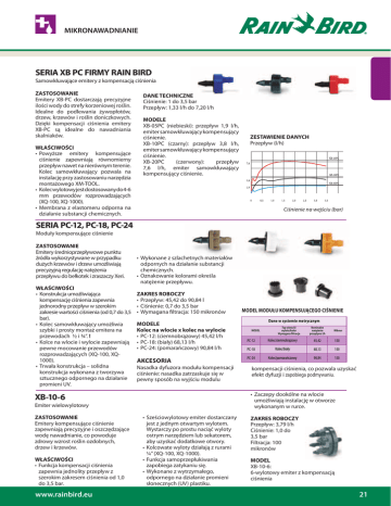 MIKRONAWADNIANIE SERIA XB PC FIRMY RAIN BIRD Samowkłuwające emitery z kompensacją ciśnienia ZASTOSOWANIE Emitery XB-PC dostarczają precyzyjne ilości wody do strefy korzeniowej roślin. Idealne do podlewania żywopłotów, drzew, krzewów i roślin doniczkowych. Dzięki kompensacji ciśnienia emitery XB-PC są idealne do nawadniania skalniaków. WŁAŚCIWOŚCI • Powyższe emitery kompensujące ciśnienie zapewniają równomierny przepływ nawet na nierównym terenie. Kolec samowkłuwający pozwala na instalację przy zastosowaniu narzędzia montażowego XM-TOOL. • Kolec wylotowy jest dostosowany do 4-6 mm przewodów rozprowadzających (XQ-100, XQ-1000). • Membrana z elastomeru odporna na działanie substancji chemicznych. DANE TECHNICZNE Ciśnienie: 1 do 3,5 bar Przepływ: 1,33 l/h do 7,20 l/h MODELE XB-05PC (niebieski): przepływ 1,9 l/h, emiter samowkłuwający kompensujący ciśnienie. XB-10PC (czarny): przepływ 3,8 l/h, emiter samowkłuwający kompensujący ciśnienie. XB-20PC (czerwony): przepływ 7,6 l/h, emiter samowkłuwający kompensujący ciśnienie. ZESTAWIENIE DANYCH Przepływ (l/h) Ciśnienie na wejściu (bar) SERIA PC-12, PC-18, PC-24 Moduły kompensujące ciśnienie ZASTOSOWANIE Emitery średnioprzepływowe punktu źródła wykorzystywane w przypadku dużych krzewów i drzew umożliwiają precyzyjną regulację natężenia przepływu do bełkotek i zraszaczy Xeri. WŁAŚCIWOŚCI • Konstrukcja umożliwiająca kompensację ciśnienia zapewnia jednorodny przepływ w szerokim zakresie wartości ciśnienia (od 0,7 do 3,5 bar). • Kolec samowkłuwający umożliwia szybki i prosty montaż emitera na przewodach ½ i ¾”. ! • Kolce na wlocie i wylocie zapewniają pewne mocowanie przewodów rozprowadzających (XQ-100, XQ1000). • Trwała konstrukcja – solidna konstrukcja wykonana z tworzywa sztucznego odpornego na działanie promieni UV. • Wykonane z szlachetnych materiałów odpornych na działanie substancji chemicznych. • Oznakowanie kolorami określa natężenie przepływu. ZAKRES ROBOCZY • Przepływ: 45,42 do 90,84 l • Ciśnienie: 0,7 do 3,5 bar • Wymagana filtracja: 150 mikronów MODELE Kolec na wlocie x kolec na wylocie • PC-12: (ciemnobrązowy) 45,42 l/h • PC-18: (biały) 68,13 l/h • PC-24: (pomarańczowy) 90,84 l/h AKCESORIA Nasadka dyfuzora modułu kompensacji ciśnienie: nasadka zatrzaskuje się w pewny sposób na wyjściu modulu Emiter wielowylotowy WŁAŚCIWOŚCI • Funkcja kompensacji ciśnienia zapewnia jednolity przepływ z szerokim zakresem ciśnienia od 1,0 do 3,5 bar. www.rainbird.eu Dane w systemie metrycznym MODEL Typ wlotu R/ wylotu/kolor Wymagana filtracja Nominalne natężenie przepływu l/h Mikron PC-12 Kolec/ciemnobrązowy 45,42 150 PC-18 Kolec/biały 68,13 150 PC-24 Kolec/pomarańczowy 90,84 150 kompensacji ciśnienia, co pozwala uzyskać efekt dyfuzji i zapobiega podmywaniu. • Zaczepy dookólne na wlocie umożliwiają instalację w otworze wykonanym w rurce. XB-10-6 ZASTOSOWANIE Emitery kompensujące ciśnienie zapewniają precyzyjne i oszczędzające wodę nawadnianie, co powoduje zdrowy wzrost roślin ozdobnych, drzew i krzewów. MODEL MODUŁU KOMPENSUJĄCEGO CIŚNIENIE • Sześciowylotowy emiter dostarczany jest z jednym otwartym wylotem. Wystarczy po prostu naciąć wyloty ostrym narzędziem lub sekatorem, aby uzyskać dodatkowe otwory. • Kolcowate wyloty działają z rurami ¼” (XQ-100, XQ-1000). • Funkcja samoprzepłukiwania zapobiega zatykaniu się. • Wykonane z wytrzymałego, odpornego na działanie promieni słonecznych (UV) plastiku. ZAKRES ROBOCZY Przepływ: 3,79 l/h Ciśnienie: 1,0 do 3,5 bar Filtracja: 100 mikronów MODEL XB-10-6: 6-wylotowy emiter z kompensacją ciśnienia 21