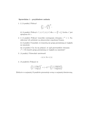 Sprawdzian 1 - przykładowe zadania 1. i) (4 punkty) Policzyć √ !35 3 1 −i ; 2 2 ii) (4 punkty) Policzyć z ∗ , |z/z ∗ |, |z|, |z ∗ | dla z = sprzężona do z. √ 7 2 + i 41 . Liczba z ∗ jest 2. i) (4 punkty) Policzyć wszystkie rozwiązania równania z −6 = 1. Naszkicować ich położenie na płaszczyźnie zespolonej Gaussa. ii) (4 punkty) Uzasadnić, że stanowią one grupę przemienną ze względu na mnożenie. iii) (2 punkty) Czy da się pokazać, że ogół pierwiastków równania z 4 = 16 stanowi grupę przemienną ze względu na mnożenie? 3. (4 punkty) Udowodnić nierówność −|z| ¬ =z ¬ |z|. 4. (8 punktów) Pokazać że 1 + i ctg φ 1 − i ctg φ !n n+1 = (−1) 1 + i ctg(nφ) 1 − i ctg(nφ) ! Zdobycie co najmniej 13 punktów gwarantuje ocenę co najmniej dostateczną.