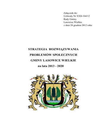 Załącznik do: Uchwały Nr XXII-164/12 Rady Gminy Lasowice Wielkie z dnia 28 grudnia 2012 roku STRATEGIA ROZWIĄZYWANIA PROBLEMÓW SPOŁECZNYCH GMINY LASOWICE WIELKIE na lata 2013 - 2020 SPIS TREŚCI Wstęp……………………………………………………………...…………….2 1. Dokumenty planistyczne…………………...…………………………..……3 1.1. Strategia Lizbońska…………………………………………………………3 1.2.Strategia rozwoju województwa opolskiego do roku 2020………………….3 1.3.Narodowa strategia spójności………………………………………………..4 1.4.Strategia rozwoju powiatu kluczborskiego………………………………….4 2. Diagnoza problemów społecznych gminy Lasowice Wielkie………….…..4 2.1.Charakterystyka gminy………………………………………………………4 2.2.Problemy społeczne gminy Lasowice Wielkie………………………………5 2.3.Ubóstwo a bezrobocie……………………………………………………….8 2.4.Niepełnosprawność……………………………………...………………….10 2.5.Kwestia alkoholizmu i przemocy w rodzinie…………………………..…..12 3.Zasoby umożliwiające rozwiązywanie problemów społecznych…...…….15 3.1.Gminny Ośrodek Pomocy Społecznej w Lasowicach Wielkich…………...15 3.2.Instytucje pozarządowe…………………………………………………….16 3.3.Lasowicki Dom Tolerancji i Kultury w Lasowicach Małych……………...16 4. Instytucje współpracujące w zakresie pomocy społecznej z terenu powiatu………………………………………………………………………...16 4.1.Dom Pomocy Społecznej w Gierałcicach i Kluczborku…………………...16 4.2.Powiatowy Ośrodek Interwencji Kryzysowej w Kluczborku……………...17 4.3. Placówka Opiekuńczo – Wychowawcza „Nasz Dom” Bogacica – Bąków.17 4.4.Powiatowe Centrum Pomocy Rodzinie w Kluczborku…………………….17 4.5.Warsztaty Terapii Zajęciowej w Kluczborku………………………………17 4.6.Środowiskowy Dom Samopomocy w Kluczborku………………………...17 4.7.Powiatowa Poradnia Psychologiczno – Pedagogiczna w Kluczborku……..17 5. Analiza SWOT………………………...……………………………………18 6. Cele strategiczne…………………………..………………………………..20 7. Monitoring i wdrażanie strategii……………………….………………….23 7.1.Monitoring i ewaluacja……………………………………………………..23 7.2.Cechy programów i projektów……………………………………………..24 8. Uwagi końcowe ……………………………...……………………………..24 STRATEGIA ROZWIĄZYWANIA PROBLEMÓW SPOŁECZNYCH W GMINIE LASOWICE WIELKIE 1 WSTĘP Strategia Rozwiązywania Problemów Społecznych jest dokumentem planistycznym, który wyznacza główne kierunki działań mających na celu zapewnienie mieszkańcom gminy Lasowice Wielkie odpowiedniego poziomu życia. Strategia jest wyrazem zintegrowanego planowania społecznego. Stworzenie spójnego systemu współpracy podmiotów realizujących zadania w zakresie: pomocy społecznej, oświaty, ochrony zdrowia, kultury i rekreacji, bezpieczeństwa publicznego i innych dziedzin życia społecznego zagwarantuje kompleksowość i efektywność podejmowanych działań. Strategia jest więc instrumentem umożliwiającym podejmowanie decyzji zarówno w najbliższym okresie, jak i w odległej perspektywie. Opracowanie i realizacja Strategii Rozwiązywania Problemów Społecznych jest zadaniem własnym gminy o charakterze obowiązkowym, wynikającym z art. 17 ust.1 pkt.1 ustawy o pomocy społecznej z dnia 12 marca 2004r. Różnorodność problemów społecznych występujących w gminie powoduje konieczność wzięcia pod uwagę także innych aktów prawnych, które mają istotny wpływ na konstrukcję dokumentu i rozwiązywanie zadań społecznych w przyszłości. Są to m.in.: - ustawa z dnia 13 czerwca 2003r. o zatrudnieniu socjalnym (tj. Dz. U. z 2011 r. Nr 43, poz. 225 z póź.zm.); - ustawa z dnia 24 kwietnia 2003 r. o działalności pożytku publicznego i o wolontariacie (tj. Dz. U. z 2010 r. Nr 234, poz. 1536 z póź. zm.); - ustawa z dnia 20 kwietnia 2004r. o promocji zatrudnienia i instytucjach rynku pracy (tj. Dz. U. z 2008r. Nr 69, poz. 415 z póź. zm.); - ustawa z dnia 19 sierpnia 1994r. o ochronie zdrowia psychicznego (tj. Dz. U. z 2011r. Nr 231, poz. 1375); - ustawa z dnia 26 października 1982 r. o wychowaniu w trzeźwości i przeciwdziałania alkoholizmowi (tj. Dz. U. z 2007r. Nr 70, poz. 473 z póź. zm.); - ustawa z dnia 27 sierpnia 1997r. o rehabilitacji zawodowej i społecznej oraz zatrudnieniu osób niepełnosprawnych (tj. Dz. U. z 2011r. Nr 127, poz. 721 z póź. zm. ); STRATEGIA ROZWIĄZYWANIA PROBLEMÓW SPOŁECZNYCH W GMINIE LASOWICE WIELKIE 2 - ustawa z dnia 27 sierpnia 2004r. o świadczeniach opieki zdrowotnej finansowanej ze środków publicznych (tj. Dz. U. z 2008r. Nr 164, poz. 1027 z póź. zm.); - ustawa z dnia 29 lipca 2005 r. o przeciwdziałaniu narkomanii (tj. Dz. U. z 2012r., poz.124); - ustawa z dnia 9 czerwca 2011r. o wspieraniu rodziny i systemie pieczy zastępczej (tj. Dz. U. z 2011r. Nr 149, poz. 887 z póź. zm. ) 1. DOKUMENTY PLANISTYCZNE: 1.1.STRATEGIA LIZBOŃSKA (SL) Duży nacisk kładła na edukację, jako zapobieganie wzrostu czynnika ubóstwa i marginalizacji, ponadto działania profilaktyczne, mianowicie : rozszerzenia dostępu do wychowania przedszkolnego, rozwijanie różnych form edukacji dla osób niepełnosprawnych, a także prowadzenie we wszystkich szkołach zajęć edukacyjnych dla uczniów, którzy posiadają niższe możliwości intelektualne. W zakresie pomocy społecznej SL na pierwszym planie stawia znaczenie i formy pracy socjalnej oraz poradni