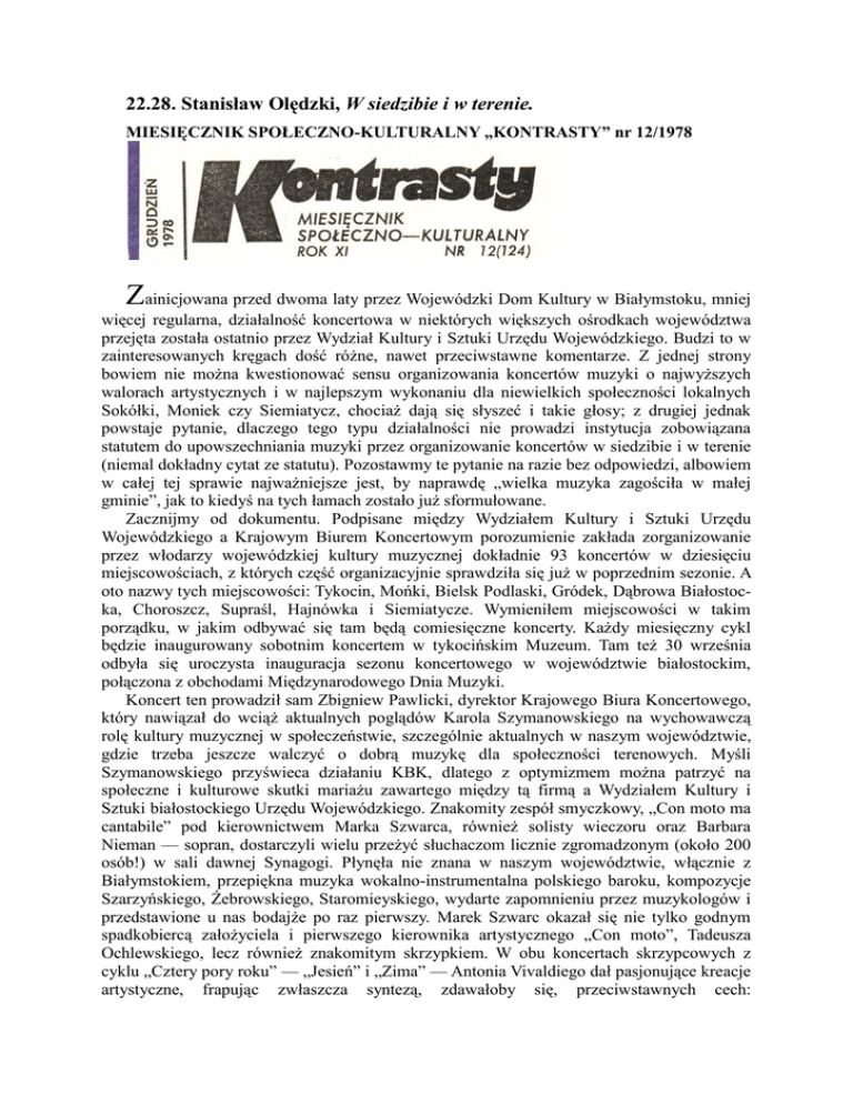 22.28. Stanisław Olędzki, W siedzibie i w terenie. MIESIĘCZNIK SPOŁECZNO-KULTURALNY „KONTRASTY” nr 12/1978 Z ainicjowana przed dwoma laty przez Wojewódzki Dom Kultury w Białymstoku, mniej więcej regularna, działalność koncertowa w niektórych większych ośrodkach województwa przejęta została ostatnio przez Wydział Kultury i Sztuki Urzędu Wojewódzkiego. Budzi to w zainteresowanych kręgach dość różne, nawet przeciwstawne komentarze. Z jednej strony bowiem nie można kwestionować sensu organizowania koncertów muzyki o najwyższych walorach artystycznych i w najlepszym wykonaniu dla niewielkich społeczności lokalnych Sokółki, Moniek czy Siemiatycz, chociaż dają się słyszeć i takie głosy; z drugiej jednak powstaje pytanie, dlaczego tego typu działalności nie prowadzi instytucja zobowiązana statutem do upowszechniania muzyki przez organizowanie koncertów w siedzibie i w terenie (niemal dokładny cytat ze statutu). Pozostawmy te pytanie na razie bez odpowiedzi, albowiem w całej tej sprawie najważniejsze jest, by naprawdę „wielka muzyka zagościła w małej gminie”, jak to kiedyś na tych łamach zostało już sformułowane. Zacznijmy od dokumentu. Podpisane między Wydziałem Kultury i Sztuki Urzędu Wojewódzkiego a Krajowym Biurem Koncertowym porozumienie zakłada zorganizowanie przez włodarzy wojewódzkiej kultury muzycznej dokładnie 93 koncertów w dziesięciu miejscowościach, z których część organizacyjnie sprawdziła się już w poprzednim sezonie. A oto nazwy tych miejscowości: Tykocin, Mońki, Bielsk Podlaski, Gródek, Dąbrowa Białostocka, Choroszcz, Supraśl, Hajnówka i Siemiatycze. Wymieniłem miejscowości w takim porządku, w jakim odbywać się tam będą comiesięczne koncerty. Każdy miesięczny cykl będzie inaugurowany sobotnim koncertem w tykocińskim Muzeum. Tam też 30 września odbyła się uroczysta inauguracja sezonu koncertowego w województwie białostockim, połączona z obchodami Międzynarodowego Dnia Muzyki. Koncert ten prowadził sam Zbigniew Pawlicki, dyrektor Krajowego Biura Koncertowego, który nawiązał do wciąż aktualnych poglądów Karola Szymanowskiego na wychowawczą rolę kultury muzycznej w społeczeństwie, szczególnie aktualnych w naszym województwie, gdzie trzeba jeszcze walczyć o dobrą muzykę dla społeczności terenowych. Myśli Szymanowskiego przyświeca działaniu KBK, dlatego z optymizmem można patrzyć na społeczne i kulturowe skutki mariażu zawartego między tą firmą a Wydziałem Kultury i Sztuki białostockiego Urzędu Wojewódzkiego. Znakomity zespół smyczkowy, „Con moto ma cantabile” pod kierownictwem Marka Szwarca, również solisty wieczoru oraz Barbara Nieman — sopran, dostarczyli wielu przeżyć słuchaczom licznie zgromadzonym (około 200 osób!) w sali dawnej Synagogi. Płynęła nie znana w naszym województwie, włącznie z Białymstokiem, przepiękna muzyka wokalno-instrumentalna polskiego baroku, kompozycje Szarzyńskiego, Żebrowskiego, Staromieyskiego, wydarte zapomnieniu przez muzykologów i przedstawione u nas bodajże po raz pierwszy. Marek Szwarc okazał się nie tylko godnym spadkobiercą założyciela i pierwszego kierownika artystycznego „Con moto”, Tadeusza Ochlewskiego, lecz również znakomitym skrzypkiem. W obu koncertach skrzypcowych z cyklu „Cztery pory roku” — „Jesień” i „Zima” — Antonia Vivaldiego dał pasjonujące kreacje artystyczne, frapując zwłaszcza syntezą, zdawałoby się, przeciwstawnych cech: spontanicznością, brawurą, a zarazem precyzją, głębokim emocjonalizmem, jednakże bacznie kontrolowanym. Bisy w Tykocinie świadczyły o rezonansie, jaki wzbudza dobra muzyka w świetnym wykonaniu, i o zapotrzebowaniu na nią także poza obrębem wielkich miast. W oficjalnej części Międzynarodowego Dnia Muzyki, której gospodarzem był wicewojewoda białostocki, Zenon Świtaj, wręczone zostały nagrody wojewody za osiągnięcia w działalności artystycznej i upowszechniającej. Otrzymali je: Ewa Cywińska — kierowniczka Muzeum w Tykocinie, Roman Zieliński — dyrygent Chóru Akademii Medycznej w Białymstoku oraz Bohdan Łukaszewicz i Stanisław Olchanowski — muzycy Państwowej Filharmonii w Białymstoku. Inauguracyjny koncert powtórzony został następnego dnia w Bielsku Podlaskim i Siemiatyczach. W niespełna miesiąc później rozpoczęła się kolejna, tym razem już pełna, seria koncertów. Premierowy wieczór odbył się 21 października w Tykocinie, a jego wykonawcami byli: Teresa Głąbówna — laureatka konkursów skrzypcowych w Genui (1972) i Helsinkach (1976), mezzosopranistka Maria Olkisz — zdobywczyni srebrnego medalu na Międzynarodowymi Konkursie Muzycznym w Genewie (1972), i pianista Bogdan Ruśkiewicz (pianista i śpiewaczka pracują w Teatrze Wielkim w Warszawie). Tak renomowani artyści zapisali się bardzo chwalebnie w pamięci słuchaczy wykonaniem urozmaiconego programu na wysokim poziomie technicznym i artystycznym. Teresa Głąbówna wystąpiła jeszcze w następnych koncertach — w Mońkach i Bielsku Podlaskim; Marię Olkisz i akompaniatora zastąpiła po drugim koncercie Halina Słonicka — laureatka wielu konkursów śpiewaczych, m.in. w Hertogenbosch, Tuluzie i Genewie, znana nam dobrze z płyt; radia, telewizji i teatrów operowych, białostoczanom szczególnie bliska, jako że tutaj swego czasu mieszkała i zdawała maturę. Akompaniowała jej, w sposób szczególnie wrażliwy i precyzyjny, Alina Liwska. Drugą część październikowej serii koncertów wypełniły występy trójki artystów krakowskich. Utwory skrzypcowe grał rewelacyjny młody skrzypek, Wiesław Kwaśny, laureat konkursów w Lizbonie, Neapolu i, w roku ubiegłym, I nagrody w Dallas. Chaconne Jana Sebastiana Bacha, Rondo capriccioso Kamila Saint-Saënsa, Poloneza D-dur Henryka Wieniawskiego i Źródło Aretuzy Karola Szymanowskiego wykonywał on ze swoistym nerwem, utrzymującym słuchaczy w nap