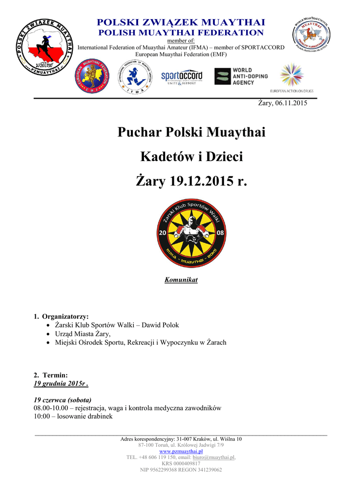 POLSKI ZWIĄZEK MUAYTHAI POLISH MUAYTHAI FEDERATION member of: International Federation of Muaythai Amateur (IFMA) – member of SPORTACCORD European Muaythai Federation (EMF) Żary, 06.11.2015 Puchar Polski Muaythai Kadetów i Dzieci Żary 19.12.2015 r. Komunikat 1. Organizatorzy: Żarski Klub Sportów Walki – Dawid Polok Urząd Miasta Żary, Miejski Ośrodek Sportu, Rekreacji i Wypoczynku w Żarach 2. Termin: 19 grudnia 2015r . 19 czerwca (sobota) 08.00-10.00 – rejestracja, waga i kontrola medyczna zawodników 10:00 – losowanie drabinek __________________________________________________________________________________ Adres korespondencyjny: 31-007 Kraków, ul. Wiślna 10 87-100 Toruń, ul. Królowej Jadwigi 7/9 www.pzmuaythai.pl TEL. +48 606 119 150, email: [email protected], KRS 0000409817 NIP 9562299368 REGON 341239062 11:00 – oficjalne otwarcie Pucharu Polski, rozpoczęcie walk 3. Miejsce: MOSRiW Hala Promień Żary Ul. Zwycięzców 38 68-200 Żary 4. Zgłoszenia: Zainteresowane startem kluby prosimy o zgłaszanie drogą mailową swoich zawodników, podając w mailu informacje według poniższego schematu: Imię i nazwisko - klub - kategoria wiekowa (oraz data urodzenia) -kategoria wagowa UWAGA ! Podanie daty urodzenia jest obowiązkowe Data zgłoszeń i opłata startowa: zgłoszenia otrzymane do 11 grudnia 2015 roku do godziny 24:00: zrzeszeni w PZMT posiadający licencję opłata 20zł, niezrzeszeni w PZMT opłata 50zł (w tym jednorazowa licencja PZMT). Zgłoszenia otrzymane do 16 grudnia do godziny 24:00: zrzeszeni w PZMT posiadający licencję opłata 40zł, niezrzeszeni w PZMT opłata 70zł (w tym jednorazowa licencja PZMT). Zgłoszenia prosimy przesyłać ostatecznie do 16 grudnia do godz. 24:00 na adres email: [email protected] Lista startowa będzie dostępna na stronie organizatora: www.sportywalki.zary.pl Kontakt organizator: Dawid Polok 888-767-877 5. Informacje: - sprzęt ochronny do walki zapewnia organizator. - zawodnik musi posiadać - spodenki, koszulkę na ramiączkach (niebieską i czerwoną), ochraniacz krocza (metalowy), ochraniacz szczęki, bandaże bokserskie (bawełniane, zakaz używania plastrów!). Koszulki tylko na ramiączkach! Ochraniacz krocza TYLKO METALOWE Obowiązkowy mongkom - WŁASNY (klubowy) - wiązane (zgodnie z przepisami IFMA) __________________________________________________________________________________ Adres korespondencyjny: 31-007 Kraków, ul. Wiślna 10 87-100 Toruń, ul. Królowej Jadwigi 7/9 www.pzmuaythai.pl TEL. +48 606 119 150, email: [email protected], KRS 0000409817 NIP 9562299368 REGON 341239062 Dzieci 10-11 lat bez uderzeń na głowę, Dzieci starsze 12-13 lat bez uderzeń na głowę, Kadeci 14-15 lat z uderzeniami i kopnięciami na głowę (bez kolan i łokci). 6. Warunki udziału w zawodach: a) posiadanie książeczki sportowo-lekarskiej lub zaświadczenia od lekarza sportowego z aktualnymi badaniami z wpisem „zdolny do treningów i startów w zawodach w dyscyplinie muaythai”, w przypadku kategorii dzieci i dzieci starszych gdzie nie występują uderzenia na głowę dopuszczalny jest wpis „zdolny do startów w zawodach muaythai bez uderzeń na głowę” b) ubezpieczenie NNW z datą ważności pokrywającą się z datą turnieju, c) podpisana zgoda rodziców do udziału w turnieju zezwalająca na udział niepełnoletniego w Pucharze Polski, d) wypełniony formularz zgłoszeniowy (posiadany przy rejestracji), Kategorie wiekowe i wagowe wg przepisów międzynarodowych IFMA: KADET 14-15 Lat: Chłopcy: -38 -40 -42 -45 -48 -51 -54 -57 -60 -63,5 -67 -71 -75 -81 +81 Kgs, Dziewczęta: -36 -38 -40 -42 -45 -48 -51 -54 -57 -60 -63,5 -67 -71 +71 Kgs, DZIECI STARSZE: 12-13 Lat: Chłopcy: -34 -36 -38 -40 -42 -44 -46 – 48 – 50 -52 -54 -56 -58 -60 -63,5 -67 -71 -+71 Kgs, Dziewczęta: -32 -34 -36 -38 -40 -42 -44 -46 – 48 – 50 -52 -54 -56 -58 -60 -63,5 +63,5 Kgs, DZIECI 10-11 Lat: Chłopcy: -30 -32 -34 -36 -38 -40 -42 -44 -46 – 48 – 50 -52 -54 -56 -58 -60 -63,5 -67 +67 Kgs, Dziewczęta: -30 -32 -34 -36 -38 -40 -42 -44 -46 – 48 – 50 -52 -54 -56 -58 -60 +60 Kgs, 7. Opłata startowa: Zgłoszeni do 11 grudnia do godz. 24:00: 20 zł dla zawodników z klubów zrzeszonych, 40 zł dla zawodników z klubów niezrzeszonych. Zgłoszeni do 16 grudnia do godz. 24:00: 40 zł dla zawodników z klubów zrzeszonych, 70 zł dla zawodników z klubów niezrzeszonych. Dodatkowo w przypadku braku sędziego powołanego na zawody klub uiszcza opłatę w wysokości 100 zł. Licencja dla zawodników z klubów zrzeszonych 30 zł/roczna (możliwość wykupienia na miejscu), dla zawodników z klubów niezrzeszonych 30 zł/na czas trwania Pucharu (jednorazowa). Za dopilnowanie wysokości opłat, odpowiedzialny w każdym wypadku jest ORGANIZATOR. Opłata startowa zasila budżet ORGANIZATORA, pomniejszona o różnicę dla członków niezrzeszonych, która zasila budżet PZMT. __________________________________________________________________________________ Adres korespondencyjny: 31-007 Kraków, ul. Wiślna 10 87-100 Toruń, ul. Królowej Jadwigi 7/9 www.pzmuaythai.pl TEL. +48 606 119 150, email: [email protected], KRS 0000409817 NIP 9562299368 REGON 341239062 8. Zakwaterowanie: Proponowany hotel 1. Hotel Kardamon - http://www.kardamon-zary.noclegiw.pl/ 2. Hotel Janków - http://www.jankow.pl/static_page/show/566 3. Glass Hotel - http://www.glas-hotel.pl/index.php?lang=pl __________________________________________________________________________________ Adres korespondencyjny: 31-007 Kraków, ul. Wiślna 10 87-100 Toruń, ul. Królowej Jadwigi 7/9 www.pzmuaythai.pl TEL. +48 606 119 150, email: [email protected], KRS 0000409817 NIP 9562299368 REGON 341239062