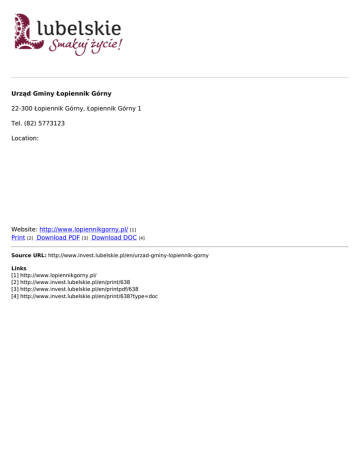 Urząd Gminy Łopiennik Górny 22-300 Łopiennik Górny, Łopiennik Górny 1 Tel. (82) 5773123 Location: Website: http://www.lopiennikgorny.pl/ [1] Print [2] Download PDF [3] Download DOC [4] Source URL: http://www.invest.lubelskie.pl/en/urzad-gminy-lopiennik-gorny Links [1] http://www.lopiennikgorny.pl/ [2] http://www.invest.lubelskie.pl/en/print/638 [3] http://www.invest.lubelskie.pl/en/printpdf/638 [4] http://www.invest.lubelskie.pl/en/print/638?type=doc
