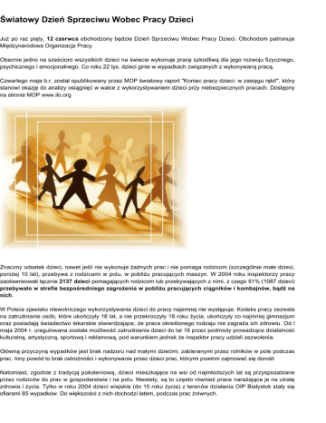 Światowy Dzień Sprzeciwu Wobec Pracy Dzieci Już po raz piąty, 12 czerwca obchodzony będzie Dzień Sprzeciwu Wobec Pracy Dzieci. Obchodom patronuje Międzynarodowa Organizacja Pracy. Obecnie jedno na sześcioro wszystkich dzieci na świecie wykonuje pracę szkodliwą dla jego rozwoju fizycznego, psychicznego i emocjonalnego. Co roku 22 tys. dzieci ginie w wypadkach związanych z wykonywaną pracą. Czwartego maja b.r. został opublikowany przez MOP światowy raport "Koniec pracy dzieci: w zasięgu ręki!", który stanowi okazję do analizy osiągnięć w walce z wykorzystywaniem dzieci przy niebezpiecznych pracach. Dostępny na stronie MOP www.ilo.org Znaczny odsetek dzieci, nawet jeśli nie wykonuje żadnych prac i nie pomaga rodzicom (szczególnie małe dzieci, poniżej 10 lat), przebywa z rodzicami w polu, w pobliżu pracujących maszyn. W 2004 roku inspektorzy pracy zaobserwowali łącznie 2137 dzieci pomagających rodzicom lub przebywających z nimi, z czego 51% (1087 dzieci) przebywało w strefie bezpośredniego zagrożenia w pobliżu pracujących ciągników i kombajnów, bądź na nich. W Polsce zjawisko niewolniczego wykorzystywania dzieci do pracy najemnej nie występuje. Kodeks pracy zezwala na zatrudnianie osób, które ukończyły 16 lat, a nie przekroczyły 18 roku życia, ukończyły co najmniej gimnazjum oraz posiadają świadectwo lekarskie stwierdzające, że praca określonego rodzaju nie zagraża ich zdrowiu. Od l maja 2004 r. uregulowana została możliwość zatrudniania dzieci do lat 16 przez podmioty prowadzące działalność kulturalną, artystyczną, sportową i reklamową, pod warunkiem jednak że inspektor pracy udzieli zezwolenia. Główną przyczyną wypadków jest brak nadzoru nad małymi dziećmi, zabieranymi przez rolników w pole podczas prac. Inny powód to brak ostrożności i wykonywanie przez dzieci prac, którymi powinni zajmować się dorośli Natomiast, zgodnie z tradycją pokoleniową, dzieci mieszkające na wsi od najmłodszych lat są przysposabiane przez rodziców do prac w gospodarstwie i na polu. Niestety, są to często również prace narażające je na utratę zdrowia i życia. Tylko w roku 2004 dzieci wiejskie (do 15 roku życia) z terenów działania OIP Białystok stały się ofiarami 85 wypadków. Do większości z nich dochodzi latem, podczas prac żniwnych. Dane statystyczne sporządzone przez Międzynarodowa Organizację Pracy ● ● ● ● ● ● ● ● ● ● ● ● 246 milionów dzieci na świecie pracuje 73 mln pracujących dzieci nie ma 10 lat każdego roku 22 tys. dzieci ginie w wypadkach związanych z wykonywaną pracą największa liczba dzieci – pracowników (127 mln dzieci) występuje w rejonie Azji południowo – wschodniej i Pacyfiku Afrykę Subsaharyjską cechuje najwyższy procent pracujących dzieci: niemal 1/3 dzieci w wieku 14 lat i poniżej (48 mln dzieci) większość dzieci – pracowników pracuje w sektorze nieformalnym, bez ochrony prawnej i regulacji ochronnych: 70% w rolnictwie, komercyjnym myślistwie, rybołówstwie lub leśnictwie; 8% w produkcji; 8% w handlu hurtowym i detalicznym, restauracjach i hotelach; 7% w służbach miejskich, społecznych, pracach w gospodarstwie domowym, np. jako pomoc domowa niewolnictwo, handel narkotykami, oddanie w niewolę za długi, prostytucja, pornografia i wiele innych nielegalnych poczynań – to rzeczywistość dla 8,4 mln dzieci ok. 1,2 mln z tych dzieci zostało sprzedanych MOP : WALKA PRZECIWKO PRACY DZIECI Wyeliminowanie zjawiska pracy dzieci jest kluczowym elementem realizacji postulatu MOP "Godziwa praca dla wszystkich". MOP nie traktuje pracy dzieci jako odosobnionego problemu, ale jako integralną cześć działań na rzecz ekonomicznego i społecznego rozwoju. 1919: I Międzynarodowa Konferencja Pracy: Konwencja dotycząca określenia najniższego wieku dopuszczania dzieci do pracy przemysłowej 1930: Konwencja dotycząca pracy przymusowej lub obowiązkowej. 1973: Konwencja dotycząca najniższego wieku dopuszczenia do zatrudnienia (nr 138) 1992: MOP rozpoczyna Międzynarodowy Program Zwalczania Pracy Dzieci (International Programme on the Elimination of Child Latour -IPEC). Działania podejmowane w ramach programu to m.in: badania oceniające, rozwój możliwości życiowych dzieci, reforma prawa, podnoszenie świadomości, mobilizacja społeczna, prewencja, przerywanie zatrudnienia dzieci i rehabilitacja dzieci, które wykonują prace niebezpieczne, tworzenie rozwiązań alternatywnych dla rodzin dzieci - pracowników. 1996: Deklaracja Sztokholmska i Agenda Działania: wypracowanie zasady, ze przestępstwo przeciwko dziecku w danym miejscu pozostaje przestępstwem na całym świecie. MOP wprowadziła tę zasadę do międzynarodowych standardów prawa w drodze uchwalonej trzy lata później konwencji, która podkreślała rolę egzekwowania prawa i karania. 1998: Deklaracja Podstawowych Praw i Zasad w Pracy: wolność zrzeszania się, zakaz pracy przymusowej, koniec dyskryminacji w miejscu pracy, eliminacja zjawiska pracy dzieci. Państwa członkowskie MOP złożyły przysięgę przestrzegania i promowania tych zasad. 1999: przyjęcie Konwencji dotyczącej natychmiastowego zniesienia najgorszych form pracy dzieci (nr 182). Konwencja skierowała uwagę całego świata na potrzebę bezzwłocznego podjęcia działań w celu eliminacji takich form zatrudnienia dzieci, które są niebezpieczne i szkodliwe dla ich fizycznego, psychicznego i moralnego rozwoju. Konwencja została ratyfikowana przez 3/4 państw członkowskich MOP 2002: MOP uznaje 12 czerwca za Ogólnoświatowy Dzień Sprzeciwu Wobec Pracy Dzieci. Ponad 80 państw uzyskało wsparcie MOP w tworzeniu ich własnych programów zwalczania pracy dzieci. 2004: Pierwsza globalna analiza ekonomiczna kosztów i korzyści eliminacji pracy dzieci szacuje, że przewidywane korzyści wynosiłyby 5,1 biliona dolarów amerykańskich.