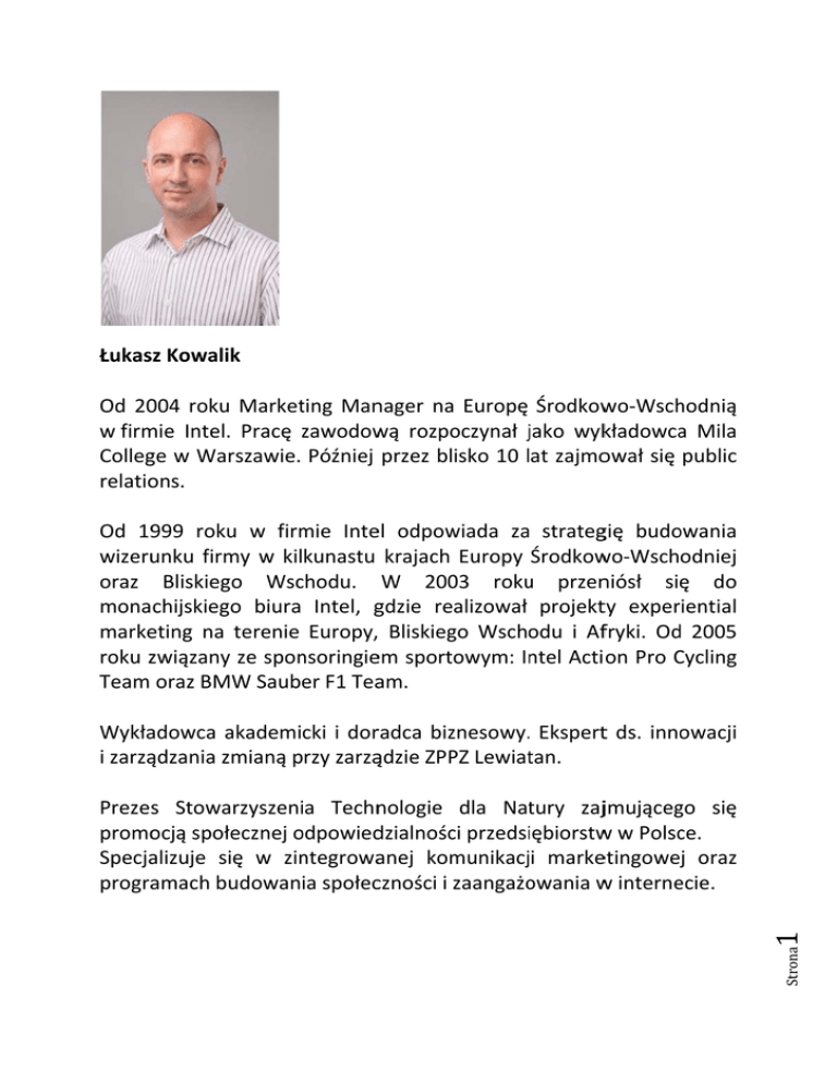 Łukassz Kowaliik Od 20004 roku u Marketting Mannager na Europę Środkow wo-Wsch hodnią w firm mie Intel. Pracę zawodow z wą rozpo oczynał jako j wykkładowcaa Mila Collegge w Warszawie. Później przez blisko 10 lat zajmoował się public relatio ons. mie Inteel odpow wiada za strateggię budo owania Od 19999 roku w firm wizeru unku firm my w kilkunastu krajach Europy Środkow wo-Wschodniej oraz Bliskieggo Wscchodu. W 200 03 roku u przenniósł się do monachijskieggo biura Intel, ggdzie realizował projektty experriential markeeting na terenie Europy,, Bliskieggo Wschodu i Affryki. Od d 2005 roku zzwiązanyy ze spon nsoringieem sportowym: In ntel Acti on Pro Cycling C Team oraz BM MW Sauber F1 Teaam. Wykłaadowca akademi a cki i dorradca bizznesowy.. Ekspertt ds. inno owacji i zarząądzania zmianą z przy p zarząądzie ZPP PZ Lewiattan. Strona 1 Prezes Stowaarzyszeniia Technnologie dla Nattury zajjmująceggo się promo ocją społłecznej odpowied o dzialnoścci przedsiiębiorstw w w Polscce. Specjaalizuje się w zin ntegrowaanej kom munikacji markeetingowej oraz prograamach budowania społecczności i zaangażo owania w interne ecie. Zbigniew Gaje ewski Z wykkształcen nia polito olog, abssolwent Uniwerssytetu W Warszawsskiego. Były pracown nik naukkowy UW W, dzien nnikarz, redaktoor i wyd dawca. ółtworzył m.in. dzienniik Nowa Europa orazz miesięcznik Wspó ne, był dyrektorrem wydawniczyym czassopism Busineessman Magazin Pani, Uroda, Kobieta i Życie, stworzyył pierwsszy kom ercyjny portal intern netowy dla d kobiett i towarzzyszący mu m progrram telew wizyjny. Od po oczątku 2006 2 współpracuuje z Kon nfederacjją Lewia tan, gdzie jest zastęp pcą dyrektora ge eneralneggo. Organizator kampanii k i społeczznych i promo otor CSSR orazz przeddsiębiorcczości, inicjatorr i dyyrektor Europ pejskiego o Forum Nowych N Idei w So opocie. Juror w konkkursach branży b PPR: Złote e Spinaccze i Prootony. Laaureat nagró ód branżo owych (zz zespołeem): Złotty Spinaccz, Złota EFFIE, Proton P i człon nek jury w tych i kilku k innyych konkkursach. dss. społecznej Specjaalizuje się w tem matyce sspołeczn nej odpowiedzial ności biznesu, wizeru unku po olskich przedsięb p biorców,, przedssiębiorczoości mło odych, cywilizacyjnych i politycznychh uwaru unkowań ń rozwojju gospodarki pejskiej, przyszłoś p ści integrracji euro opejskiej.. europ 2 RP Strona Członeek zespołu doradcze d go Pre emiera odpow wiedzialn ności przedsiębioorstw. Urszula Kwasiiborska wej Infovide-Matr ix SA. Od d 1998 Dyrekktor markketingu w spółce giełdow roku związana z branżą informaatyczną, odpow wiedzialn na za prowaadzenie projektó ów w obszarze marketing m gu strateegicznego o i PR zarów wno na rynku dużych przedssiębiorstw, jak i MSP P. Do najcieekawszycch doświaadczeń zddobytych h w okresie kilkunnastu latt pracy zaliczaa w szcczególności zarząądzanie strategicznym rrebrandingiem marki Infovide-Matrixx, komunnikację w procesie fuzji oraz de ebiutu owego sp półki. Prrzez wielle lat od dpowiada ała takżee za realizację giełdo działań o charakterze CSR. C ółpracowaała rów wnież jakko wykłładowczyyni z W Wyższą Szkołą Wspó Działaalności Gospodarczej w Waarszawie (obeccnie Ucczelnia Warszzawska im m. Marii Skłodow wskiej-Curie). Strona 3 Absolw wentka Szkoły Główneej Handlowej w Wars zawie (studia ( magissterskie zakończone uzyyskaniem m tytułu mgr ekkonomii)) oraz Wyższzej Szkkoły Przzedsiębio orczości i Zarrządzaniaa im. prof. Koźmińskiego w Warrszawie (studia podyplo omowe). Stypend dystka North humbria Universit U ty in New wcastle upon Tyne (Wielkaa Brytania). Ireneu usz Miski Ukońcczył Uniw wersytet Ekonomiczny we Wrocław wiu z tyttułem magistra ekono omii o speecjalizacji finanse i bankow wość. W 2003 2 r. uzzyskał cerrtyfikat ACCA, a w roku u 2010 ukończył IFL Executtive Courrse na Stoockholm School of Eco onomics oraz ottrzymał ttytuł FCC CA. Ma ponad kkilkunasto oletnie doświaadczenie zawodow we, zdobyyte podczzas pracy w firmacch audyto orskich, doradcczych i ITT zarówno o na rynkku polskim m oraz za a granicą, m.in. w Nowej Zeland dii oraz USA. W lataach 2001 1-2007 prracował jjako audyytor zewnętrzny w KPMG,, gdzie przeszzedł całąą ścieżkę ę karieryy, od stanowiska a asystennta działłu, po manad dżera działu d audytoweggo. Oprrócz ob bowiązków w związzanych z audyytem sprrawozdań ń finans owych odpowied o dzialny bbył za rozwój lokalnego biuraa KPMG we w Wrocłaawiu. Strona Jest ró ównież członkiem c m rady nadzorczej ZPPZ Lewiatan, L wicepre ezesem Stowaarzyszeniaa Technologie dla Natury, członkiem rady kkrajowej ACCA, wykład dowcą SEEL oraz ekkspertem CSR. 4 Pracę w Tieto o Poland d rozpocczął 2007 7 r., na stanow wisku dyrrektora finansowego odpowiedzzialnego za spółki z grupy w Polsce,, Czechacch oraz na Biaałorusi. Koordynow K wał szereeg projekktów zwią ązanych z reorganizacją wewnętrzną fin nansów korporacj k ji m.in. od dpowiedzzialny byłł za utwo orzenie centru um usług wspólnyych w Ryddze. Obeccnie do jego obow wiązków należy nadzór nad obsszarem fin nansów kkorporacji w rejonie CEE&RRussia oraz pełni ountry managera w Polsce.. rolę co Anna Kamińskaa – Glückk Strona Od 2000 roku przedsięb p biorczyni, prowadzzi własną działalnoość szkole eniową oraz d doradczą w temaacie pozyyskiwaniaa funduszzy unijnycch, zarząądzania oraz C CSR. Równolegle w latach 22000 – 20 009 pracowała w Wyższej Szkole Integracji Euro opejskiej. Była takkże dyrekktorką Grupy Eduukacyjnej InBIT. Kierow wała licznymi projektami w ram mach PAO OW, ZPO ORR, SPO O RZL. Interesuje się różnymi aspektami zarzządzania, w tym m zarządzzaniem kapitałem ludzkim. Obe ecnie kieruje proje ektem rea alizowanyym z parttnerem CSR – now woczesny wizerune ek przedsiębiorstw w”. hiszpaańskim „C 5 Germaanistka, stypendys s stka uniw wersytetów w Getyyndze