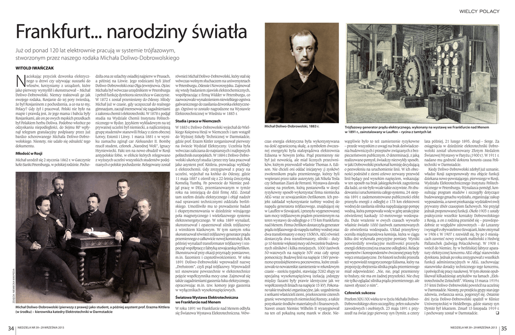 wielcy polacy Frankfurt... narodziny światła Już od ponad 120 lat elektrownie pracują w systemie trójfazowym, stworzonym przez naszego rodaka Michała Doliwo-Dobrowolskiego Witold Iwańczak N aciskając przycisk dzwonka elektrycznego u drzwi czy używając suszarki do włosów, korzystamy z urządzeń, które jako pierwszy wymyślił i skonstruował – Michał Doliwo-Dobrowolski. Niemcy traktowali go jak swojego rodaka, Rosjanie do tej pory twierdzą, że był Rosjaninem z pochodzenia, a co na to my, Polacy? Gdy żył i pracował, Polski nie było na mapie i prawdą jest, że jego mama i babcia były Rosjankami, ale on po swych męskich przodkach był Polakiem herbu Doliwa. Podobno wkrótce po odzyskaniu niepodległości, do Sejmu RP wpłynął telegram gratulacyjny podpisany przez już bardzo schorowanego Michała Doliwo-Dobrowolskiego. Niestety, nie udało się odnaleźć tego dokumentu. Młodość w Rosji zdjęcia: niemiecka wikipedia Michał urodził się 2 stycznia 1862 r. w Gatczynie koło Sankt Petersburga, w polskiej rodzinie. Pocho- dziła ona ze szlachty osiadłej najpierw w Prusach, a później na Litwie. Jego rodzicami byli Józef Doliwo-Dobrowolski oraz Olga Jewrejnowa. Ojciec Michała był wówczas urzędnikiem w Petersburgu i pełnił funkcję dyrektora sierocińca w Gatczynie. W 1872 r. został przeniesiony do Odessy. Młody Michał już w czasie, gdy uczęszczał do realnego gimnazjum, zaczął interesować się zagadnieniami z zakresu chemii i elektrotechniki. W 1878 r. podjął studia na Wydziale Chemii Instytutu Politechnicznego w Rydze. Językiem wykładowym na tej prywatnej uczelni był niemiecki, a najliczniejszą grupę studentów stanowili Polacy z ziem obecnej Łotwy, Estonii i Litwy. 1 marca 1881 r. w wyniku zamachu zginął car Aleksander II. Bombę rzucił student, członek „Narodnej Woli”, Ignacy Hryniewiecki. Fakt ten na nowo obudził w Rosji antypolskie fobie, w efekcie których relegowano z wyższych uczelni wszystkich studentów podejrzanych o polskie pochodzenie. Relegowany został Studia i praca w Niemczech W 1883 r. Doliwo-Dobrowolski wyjechał do Wielkiego Księstwa Hesji w Niemczech i tam wstąpił do Wyższej Szkoły Technicznej w Darmstadcie, gdzie prof. Erazm Kittler zorganizował pierwszy na świecie Wydział Elektryczny. Uczelnia była wówczas zaliczana do najstarszych i najlepszych politechnik europejskich. W 1884 r. Doliwo-Dobrowolski ukończył studia i przez trzy lata pracował jako asystent prof. Kittlera, prowadząc wykłady z elektrochemii. Gdy zrezygnował z pracy na uczelni, wyjechał na krótko do Odessy, gdzie 11 maja 1887 r. ożenił się z 22-letnią Greczynką Kornelią Tumbą. Po powrocie do Niemiec podjął pracę w DEG, przemianowanym w tymże roku na istniejącą do dziś firmę AEG. Został tam szefem działu elektrycznego i objął nadzór nad sprawami technicznymi oddziału berlińskiego. Umożliwiło mu to prowadzenie badań i eksperymentowania w dziedzinie wirującego pola magnetycznego i wielofazowego systemu elektroenergetycznego. W roku 1889 wynalazł, skonstruował i opatentował silnik trójfazowy z wirnikiem klatkowym. W tym samym roku skonstruował również trójfazowy generator prądu przemiennego o całkowicie nowej konstrukcji. Rok później wynalazł transformator trójfazowy i rozpoczął współpracę z fabryką szwajcarską Oerlikon. Skonstruował przy okazji przyrządy pomiarowe, m.in. fazomierz i częstotliwościomierz. W roku 1891 Doliwo-Dobrowolski wprowadził nazwę „Drehstrom”, czyli prąd trójfazowy. Wprowadził też stosowane powszechnie w elektrotechnice pojęcie współczynnika mocy cosø. Zajmował się także zagadnieniami gaszenia łuku elektrycznego, opracowując m.in. tzw. komory jego gaszenia w wyłącznikach wysokonapięciowych. Światowa Wystawa Elektrotechniczna we Frankfurcie nad Menem Michał Doliwo-Dobrowolski (pierwszy z prawej) jako student, a później asystent prof. Erazma Kittlera (w środku) – kierownika katedry Elektrotechniki w Darmstadcie 34 również Michał Doliwo-Dobrowolski, który stał się wówczas wolnym słuchaczem na uniwersytetach w Petersburgu, Odessie i Noworosyjsku. Zajmował się wtedy badaniem zjawisk elektrochemicznych, współpracując z firmą Widder w Petersburgu, co zaowocowało wynalezieniem niewielkiego ogniwa galwanicznego do zasilania dzwonka elektrycznego. Ogniwo to zostało nagrodzone na Wystawie Elektrotechnicznej w Wiedniu w 1883 r. NIEDZIELA NR 39 • 29 września 2013 W roku 1891 we Frankfurcie nad Menem odbyła się Światowa Wystawa Elektrotechniczna. Wów- Michał Doliwo-Dobrowolski, 1883 r. Trójfazowy generator prądu elektrycznego, wykonany na wystawę we Frankfurcie nad Menem w 1891 r., zainstalowany w Lauffen – rycina z tamtych lat czas energia elektryczna była wykorzystywana na dość ograniczoną skalę, a symbolem ówczesnej energetyki była stałoprądowa elektrownia Edisona w Nowym Jorku. Prąd przemienny nie był już nowością, ale miał licznych przeciwników, którym przewodził właśnie Thomas A. Edison. Nie chcieli oni oddać inicjatywy (i zysków) zwolennikom prądu przemiennego, którzy byli wspierani przez takie autorytety, jak Nikola Tesla czy Sebastian Ziani de Ferranti. Wystawa dawała szansę na przełom, którą postanowiła w dosyć ryzykowny sposób wykorzystać firma niemiecka AEG wraz ze szwajcarskim Oerlikonem. Ich projekt zakładał wykorzystanie turbiny wodnej do napędu generatora trójfazowego, znajdującej się w Lauffen w Szwajcarii, i przesyłu wygenerowanej tam mocy trójfazowym prądem przemiennym na teren wystawy do odległego o 175 km Frankfurtu nad Menem. Firma Oerlikon dostarczyła generator prądu trójfazowego do napędu turbiny wodnej oraz dwa transformatory o mocy 150kVA. AEG również dostarczyła dwa transformatory, silniki – duży (o 10-krotnie większej mocy od ówcześnie budowanych silników) i kilka mniejszych, 1000 żarówek 50-watowych na napięcie 50V oraz cały s