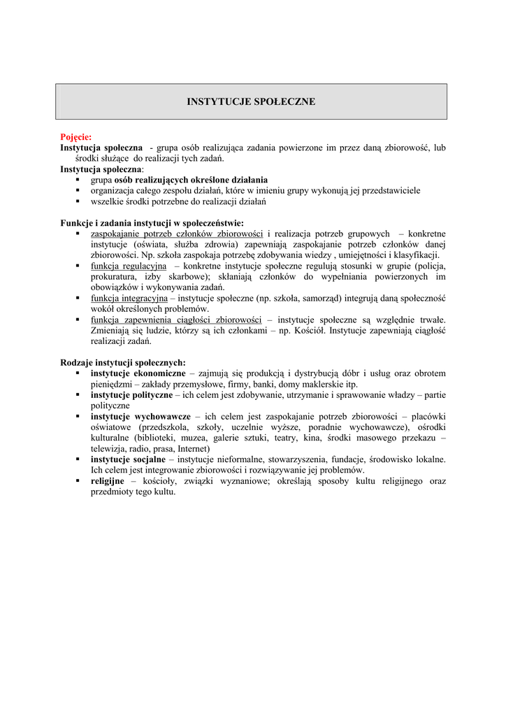INSTYTUCJE SPOŁECZNE Pojęcie: Instytucja społeczna - grupa osób realizująca zadania powierzone im przez daną zbiorowość, lub środki słuŜące do realizacji tych zadań. Instytucja społeczna: grupa osób realizujących określone działania organizacja całego zespołu działań, które w imieniu grupy wykonują jej przedstawiciele wszelkie środki potrzebne do realizacji działań Funkcje i zadania instytucji w społeczeństwie: zaspokajanie potrzeb członków zbiorowości i realizacja potrzeb grupowych – konkretne instytucje (oświata, słuŜba zdrowia) zapewniają zaspokajanie potrzeb członków danej zbiorowości. Np. szkoła zaspokaja potrzebę zdobywania wiedzy , umiejętności i klasyfikacji. funkcja regulacyjna – konkretne instytucje społeczne regulują stosunki w grupie (policja, prokuratura, izby skarbowe); skłaniają członków do wypełniania powierzonych im obowiązków i wykonywania zadań. funkcja integracyjna – instytucje społeczne (np. szkoła, samorząd) integrują daną społeczność wokół określonych problemów. funkcja zapewnienia ciągłości zbiorowości – instytucje społeczne są względnie trwałe. Zmieniają się ludzie, którzy są ich członkami – np. Kościół. Instytucje zapewniają ciągłość realizacji zadań. Rodzaje instytucji społecznych: instytucje ekonomiczne – zajmują się produkcją i dystrybucją dóbr i usług oraz obrotem pieniędzmi – zakłady przemysłowe, firmy, banki, domy maklerskie itp. instytucje polityczne – ich celem jest zdobywanie, utrzymanie i sprawowanie władzy – partie polityczne instytucje wychowawcze – ich celem jest zaspokajanie potrzeb zbiorowości – placówki oświatowe (przedszkola, szkoły, uczelnie wyŜsze, poradnie wychowawcze), ośrodki kulturalne (biblioteki, muzea, galerie sztuki, teatry, kina, środki masowego przekazu – telewizja, radio, prasa, Internet) instytucje socjalne – instytucje nieformalne, stowarzyszenia, fundacje, środowisko lokalne. Ich celem jest integrowanie zbiorowości i rozwiązywanie jej problemów. religijne – kościoły, związki wyznaniowe; określają sposoby kultu religijnego oraz przedmioty tego kultu.