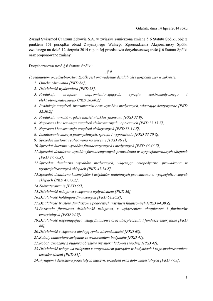 Gdańsk, dnia 14 lipca 2014 roku Zarząd Swissmed Centrum Zdrowia S.A. w związku zamierzoną zmianą § 6 Statutu Spółki, objętą punktem 15) porządku obrad Zwyczajnego Walnego Zgromadzenia Akcjonariuszy Spółki zwołanego na dzień 12 sierpnia 2014 r. poniżej przedstawia dotychczasową treść § 6 Statutu Spółki oraz proponowane zmiany. Dotychczasowa treść § 6 Statutu Spółki: „§ 6 Przedmiotem przedsiębiorstwa Spółki jest prowadzenie działalności gospodarczej w zakresie: 1. Opieka zdrowotna [PKD 86], 2. Działalność wydawnicza [PKD 58], 3. Produkcja urządzeń napromieniowujących, sprzętu elektromedycznego i elektroterapeutycznego [PKD 26.60.Z], 4. Produkcja urządzeń, instrumentów oraz wyrobów medycznych, włączając dentystyczne [PKD 32.50.Z], 5. Produkcja wyrobów, gdzie indziej niesklasyfikowana [PKD 32.9], 6. Naprawa i konserwacja urządzeń elektronicznych i optycznych [PKD 33.13.Z], 7. Naprawa i konserwacja urządzeń elektrycznych [PKD 33.14.Z], 8. Instalowanie maszyn przemysłowych, sprzętu i wyposażenia [PKD 33.20.Z], 9. Sprzedaż hurtowa realizowana na zlecenie [PKD 46.1], 10. Sprzedaż hurtowa wyrobów farmaceutycznych i medycznych [PKD 46.46.Z], 11. Sprzedaż detaliczna wyrobów farmaceutycznych prowadzona w wyspecjalizowanych sklepach [PKD 47.73.Z], 12. Sprzedaż detaliczna wyrobów medycznych, włączając ortopedyczne, prowadzona w wyspecjalizowanych sklepach [PKD 47.74.Z], 13. Sprzedaż detaliczna kosmetyków i artykułów toaletowych prowadzona w wyspecjalizowanych sklepach [PKD 47.75.Z], 14. Zakwaterowanie [PKD 55], 15. Działalność usługowa związana z wyżywieniem [PKD 56], 16. Działalność holdingów finansowych [PKD 64.20.Z], 17. Działalność trustów, funduszów i podobnych instytucji finansowych [PKD 64.30.Z], 18. Pozostała finansowa działalność usługowa, z wyłączeniem ubezpieczeń i funduszów emerytalnych [PKD 64.9], 19. Działalność wspomagająca usługi finansowe oraz ubezpieczenia i fundusze emerytalne [PKD 66], 20. Działalność związana z obsługą rynku nieruchomości [PKD 68], 21. Roboty budowlane związane ze wznoszeniem budynków [PKD 41], 22. Roboty związane z budową obiektów inżynierii lądowej i wodnej [PKD 42], 23. Działalność usługowa związana z utrzymaniem porządku w budynkach i zagospodarowaniem terenów zieleni [PKD 81], 24. Wynajem i dzierżawa pozostałych maszyn, urządzeń oraz dóbr materialnych [PKD 77.3], 1 25. Wynajem i dzierżawa pojazdów samochodowych, z wyłączeniem motocykli [PKD 77.1], 26. Badania naukowe i prace rozwojowe [PKD 72], 27. Działalność wspomagająca edukację [PKD 85.60.Z], 28. Pozaszkolne formy edukacji [PKD 85.5], 29. Gimnazja i szkoły ponadgimnazjalne, z wyłączeniem szkół policealnych [PKD 85.3], 30. Działalność rachunkowo-księgowa; doradztwo podatkowe [PKD 69.20.Z], 31. Działalność firm centralnych (head offices); doradztwo związane z zarządzaniem [PKD 70], 32. Badania i analizy techniczne [PKD 71.20], 33. Badania naukowe i prace rozwojowe [PKD 72].” Proponowana zmiana § 6 Statutu Spółki polega na: a) wprowadzeniu do tego paragrafu jednostki redakcyjnej w postaci ustępu, w ten sposób, że dotychczasowej treści § 6 Statutu nadaje się ustęp: „1.” b) dodaniu, po ustępie 1 w § 6 Statutu Spółki, ustęp 2 o następującej treści: „2. Istotna zmiana przedmiotu działalności Spółki następuje bez wykupu akcji akcjonariuszy, którzy nie zgadzają się na taką zmianę.” 2