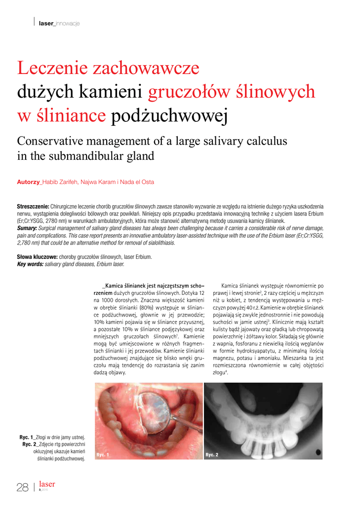 laser_innowacje Leczenie zachowawcze dużych kamieni gruczołów ślinowych w śliniance podżuchwowej Conservative management of a large salivary calculus in the submandibular gland Autorzy_Habib Zarifeh, Najwa Karam i Nada el Osta Streszczenie: Chirurgiczne leczenie chorób gruczołów ślinowych zawsze stanowiło wyzwanie ze względu na istnienie dużego ryzyka uszkodzenia nerwu, wystąpienia dolegliwości bólowych oraz powikłań. Niniejszy opis przypadku przedstawia innowacyjną technikę z użyciem lasera Erbium (Er;Cr:YSGG, 2780 nm) w warunkach ambulatoryjnych, która może stanowić alternatywną metodę usuwania kamicy ślinianek. Sumary: Surgical management of salivary gland diseases has always been challenging because it carries a considerable risk of nerve damage, pain and complications. This case report presents an innovative ambulatory laser-assisted technique with the use of the Erbium laser (Er;Cr:YSGG, 2,780 nm) that could be an alternative method for removal of sialolithiasis. Słowa kluczowe: choroby gruczołów ślinowych, laser Erbium. Key words: salivary gland diseases, Erbium laser. _Kamica ślinianek jest najczęstszym schorzeniem dużych gruczołów ślinowych. Dotyka 12 na 1000 dorosłych. Znaczna większość kamieni w obrębie ślinianki (80%) występuje w śliniance podżuchwowej, głownie w jej przewodzie; 10% kamieni pojawia się w śliniance przyusznej, a pozostałe 10% w śliniance podjęzykowej oraz mniejszych gruczołach ślinowych1. Kamienie mogą być umiejscowione w różnych fragmentach ślinianki i jej przewodów. Kamienie ślinianki podżuchwowej znajdujące się blisko wnęki gruczołu mają tendencję do rozrastania się zanim dadzą objawy. Ryc. 1_Złogi w dnie jamy ustnej. Ryc. 2_Zdjęcie rtg powierzchni okluzyjnej ukazuje kamień ślinianki podżuchwowej. 28 laser 3_2015 Ryc. 1 Kamica ślinianek występuje równomiernie po prawej i lewej stronie2, 2 razy częściej u mężczyzn niż u kobiet, z tendencją występowania u mężczyzn powyżej 40 r.ż. Kamienie w obrębie ślinianek pojawiają się zwykle jednostronnie i nie powodują suchości w jamie ustnej3. Klinicznie mają kształt kulisty bądź jajowaty oraz gładką lub chropowatą powierzchnię i żółtawy kolor. Składają się głównie z wapnia, fosforanu z niewielką ilością węglanów w formie hydroksyapatytu, z minimalną ilością magnezu, potasu i amoniaku. Mieszanka ta jest rozmieszczona równomiernie w całej objętości złogu4. Ryc. 2 laser_innowacje Ryc. 3a i b_Laserowe nacięcie dna jamy ustnej oraz usunięcie kamienia gruczołu ślinowego. Ryc. 4a i b_Bandaż laserowy oraz rana pooperacyjna. Ryc. 3a Ryc. 3b Ryc. 4a Ryc. 4b Kamica ślinianek powoduje zazwyczaj ból, dyskomfort i obrzęk gruczołów ślinowych poprzez ograniczanie wydzielania śliny związanego z jedzeniem. Obecność kamieni może powodować zastój śliny, co prowadzi do bakteryjnego zakażenia miąższu gruczołu, wywołując jego ból i obrzęk. Długotrwała blokada przewodu przy braku zapalenia może prowadzić do zaniku gruczołu, a w rezultacie do utraty jego funkcji wydzielniczej i ostatecznie do zwłóknienia4. Czasem proces ten przebiega bezobjawowo, aż do momentu, kiedy złogi przemieszczą się i staną się wyczuwalne w przewodzie ślinianki lub widoczne u jej ujścia. W tym przypadku leczenie zachowawcze polega na wprowadzeniu delikatnego masażu. Może się zdarzyć, że blokada utworzona przez duże złogi kamienia nie daje żadnych objawów, ponieważ pozostawia niewielkie światło w przewodzie, przez które przedostaje się ślina, przepływając wokół złogów kamienia lub przesączając się przez nie5. W przypadku większej kamicy może istnieć konieczność leczenia chirurgicznego poprzez usunięcie samego kamienia, jeśli jest to możliwe. Jeśli jednak wda się duże zakażenie, cały gruczoł musi być usunięty6. Chirurgiczne leczenie chorób gruczołów ślinowych zawsze stanowiło wyzwanie ze względu na istnienie dużego ryzyka uszkodzenia nerwu, wystąpienia dolegliwości bólowych oraz powikłań. Korzystnym byłoby odkrycie dodatkowej metody leczenia zachowawczego. Niniejszy opis przypadku przedstawia innowacyjną technikę z użyciem lasera Erbium (Er;Cr:YSGG, 2780 nm) w warunkach ambulatoryjnych, która może stanowić alternatywną metodę usuwania kamicy ślinianek7,8,9. _Opis przypadku 50-letni mężczyzna został skonsultowany w zakresie możliwości wszczepienia implantu w żuchwie po stronie lewej. Historia jego leczenia nie wyróżniała się, ciśnienie krwi oraz tętno pozostawały w granicach normy, rtg klatki piersiowej, EKG, morfologia krwi, osad moczu, badania czynności wątroby i nerek również były w normie. Badanie zewnątrzustne wykazało wyczuwalną z prawej strony śliniankę podżuchwową, a oburęczne badanie palpacyjne dna jamy ustnej w kierunku tylno-przednim wykazało duży, zwarty, niebolesny obrzęk w prawej części dna jamy ustnej w okolicy przewodu ślinianki podżuchwowej (Ryc. 1). Pacjent był nieświadomy obecności obrzęku do momentu wskazania go przez lekarza dentystę. Zdjęcie rtg żuchwy wykonane w projekcji zgryzowej oraz zdjęcie panoramiczne potwierdziło rozpoznanie, przedstawiając rzutującą na zdjęciu strukturę znajdującą się w okolicy prawych przedtrzonowców (Ryc. 2). Wzdłuż jej największej długości mierzyła ok. 1.5 cm. _Leczenie Jako rozpoznanie podano istnienie kamienia w przewodzie ślinianki podżuchwowej oraz zadecydowano o usunięciu go za pomocą la- laser 3_2015 29 laser_innowacje Ryc. 5_Kamień z zachowaniem skali (1,5 cm). Ryc. 6_Bandaż laserowy. Ryc. 7_Stan tydzień po zabiegu. Ryc. 5 Ryc. 6 sera Erbium (Er; CR:YSGG, 2780 nm)10. Laser Er;Cr:YSGG, 2780 nm ma zastosowanie w leczeniu tkanek twardych i miękkich za pomocą długości impulsu do 600 ms z odpowiednią ilością energii i zachowaniem odpowiedniej odległości pomiędzy wiązką lasera a powierzchnią tkanki. Tym samym, obecność c