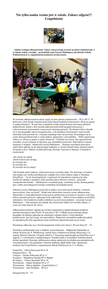 Nie tylko nauka wa na jest w szkole. Zobacz zdj cia!!! Uzupe nienie – Szko a wymaga odbr zowienia. Nale y wi cej uwagi zwraca na dzieci utalentowane. I te talenty nale y rozwija – powiedzia a nam Lucyna Ma olepsza, dyrektorka Szko y Podstawowej nr 6, organizatorka konkursu kreatywno ci. W czwartek odbr zawianiem szko y zaj y si dwie p ockie podstawówki – SP 6 i SP 17. W pierwszej z nich zosta a zorganizowana ósma edycja konkursu kreatywno ci „Wszyscy gramy w jednej orkiestrze”. W tym roku w projekcie wzi y udzia dru yny dziewi ciu p ockich podstawówek. Ka da z nich musia a zaprezentowa krótki program artystyczny z wykorzystaniem instrumentów muzycznych w asnego pomys u. Wyobra nia dzieci okaza a si w tym przypadku wprost nieograniczona. A do produkcji instrumentów u yte zosta y materia y, które pozornie nic z muzyk wspólnego mie nie powinny. Prezentuj ce si na scenie dzieci przebrane by y w stroje ptaków, pingwinów i tym podobne. – Motto tegorocznej zabawy to „Wszyscy gramy w jednej orkiestrze”. Chodzi o tym razem, aby zaprezentowa wszystko, co jest zwi zane ze piewem, gr , skrzyd ami twórczo ci. St d w nie te ptasie elementy w strojach – t umaczy a Lucyna Ma olepsza. – Dru yny wszystkich dziewi ciu szkó , które zg osi y si do tegorocznego konkursu, w swoich strojach mia y elementy ptasie. Zwi zane to jest z faktem, e ptaki piewaj i fruwaj . Fruwanie to fantazja. A fantazja to kreatywno . „Bo szko a, bo szko a, szko a twórcza jest od tego, by rozwija nas, by rozwija nas, by rozwija nas na ca ego”. Tak brzmia o motto imprezy, realizowane przez wszystkie ekipy. Nic dziwnego, e ka da z nich mog a czu wielk satysfakcj bez wzgl du na to, które miejsce zaj a w oficjalnej klasyfikacji. – Tu nie ma przegranych i wygranych, bo najwi ksz wygran jest sama mo liwo udzia u w projekcie, który promuje dzieci aktywne, twórcze – przyzna a wicedyrektorka Szóstki. – Opiekunowie wszystkich grup, wychodz c od nas, dostan pakiety gier i zabaw pozwalaj cych rozwija wyobra ni ich podopiecznych. Zdaniem Lucyny Ma olepszej twórczo to jedna z tych nielicznych dziedzin, w których nauczycielom „chce si chcie ”. Dzi ki nim szko a mo e wreszcie zosta odbr zowiona. Wprawdzie w wielu placówkach wci jeszcze preferowani s uczniowie wzorowi, czyli tacy, którzy s bardzo grzeczni i zg aszaj si do odpowiedzi. – Dzieci twórcze dalekie s od takich schematów. Ich wiadectwa rzadko ozdobione s czerwonym paskiem – przyznaje Lucyna Ma olepsza. – Najwa niejsze jest jednak, aby mo na by o odkry ich rozmaite talenty. A oceny nie maj tutaj nic do rzeczy. Odkrywaniem talentów zajmuj si równie organizatorzy mi dzyszkolnego konkursu piosenki dzieci cej Canto Picolo. W tym roku w SP 17 odby a si ju dziesi ta edycja przegl du, do którego zg aszaj si uzdolnione wokalnie dzieci z wielu p ockich podstawówek. Jury jest srogie, ale sprawiedliwe. Wi kszo uczestników podkre la jednak, e najwi ksz dla nich nagrod jest sama mo liwo zaprezentowania si na scenie. Prezentacje odbywa y si w dwóch kategoriach wiekowych, klasy I- III oraz klasy IV – VI. Ocenia o je profesjonalne jury w sk adzie: przewodnicz ca – Ma gorzata Szpota ska ze Szko y Wy szej im. P. W odkowica, Joanna Nycz z Pa stwowej Szko y Muzycznej I i II stopnia, Bo ena Tyburska z Zespo u Szkó nr 5. Przyznano nagrod g ówn Grand Prix oraz 3 nagrody i 3 wyró nienia w ka dej kategorii. Ponadto ka dy z uczestników konkursu dosta drobny upominek. Dziesi ta, jubileuszowa edycja zako czy a si s odkim pocz stunkiem dla wszystkich dzieci i ich opiekunów. Patronat medialny obj o Radio Eska. Sponsorem konkursu by Urz d Miasta a organizatorem Szko a Podstawowa nr 17 w P ocku. Grand Prix – Oliwia Krawczyk SP nr 18 Kategoria klas I – III I miejsce – Natalia towska SP nr 17 II miejsce – Magdalena Dojniak SP w S upnie III miejsce – Tomasz Kami ski SP nr 16 Wyró nienie – Sandra widerek SP nr 17 Wyró nienie – Wiktor Zgli ski - Zespó Szkó nr 2 Wyró nienie – Julia Woli ska – SP nr 6 Kategoria klas IV – VI I miejsce – Barbara Cendrowska – SP nr 23 II miejsce – Patrycja Kopyci ska – SP nr 6 III miejsce – Aleksandra Cichocka – SP nr18 Wyró nienie – Klaudia Trzci ska – SP w wi cie cu Wyró nienie – Adrianna Lewandowska - SP nr 23 Wyró nienie – Julia Soplak – SP nr 1 Tomasz Paszkiewicz 25-11-2010r. Autor: Tomasz Paszkiewicz ród o: www.plocek.pl