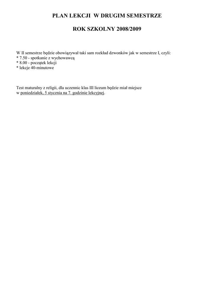 PLAN LEKCJI W DRUGIM SEMESTRZE ROK SZKOLNY 2008/2009 W II semestrze będzie obowiązywał taki sam rozkład dzwonków jak w semestrze I, czyli: * 7.50 - spotkanie z wychowawcą * 8.00 - początek lekcji * lekcje 40-minutowe Test maturalny z religii, dla uczennic klas III liceum będzie miał miejsce w poniedziałek, 5 stycznia na 7. godzinie lekcyjnej. PONIEDZIAŁEK 1 2 3 4 5 6 7 8 Ia pol muz fiz KG mat rel geo tech Ib chem wf KG ang pol hist biol muz IIa ang fiz mat mat pol pdŜ muz IIb muz pol fiz mat mat chem ang IIIa rel pol pol wf wf mat IIIb wf hist pol pol pdŜ mat mat IIIc hist ang pol mat muz wf ang fiz ang ang fiz ang ang fiz ang chem r rel gw wf rel ang rel geo pol pol pol pol - pol pol ang ang ang ang ang ang ang ang mat r - mat r chem ang pol pol wf pre IB mat mat ang ang biol rel wf I IB chem bus chem bus biol niem biol niem hist fiz hist fiz geo fr geo fr II IB biol H biol H chem niem niem bus chem bus ang ang ang ang hist fiz H hist fiz H I II III mat mat mat ang ang gw chemr1 fiz r gw geo r pol pol wf pol 10 pdŜ pol - 9 pdŜ pdŜ gw wf wf wf - hist p wf PRÓBNE MATURY geo H hist geo H WTOREK 1 Ia rel 2 niem 3 4 5 6 7 hist plast wf biol ang ang inf pol pol inf wos rel ang inf pol ang wf niem niem fr fr biol ang inf rel filoz plast niem Ib mat fr niem niem fr IIb - geo IIIa pol pol IIa chem niem rel ang 9 10 biol ang niem IIIb mat 8 biol geo ang plast geo fiz wf filoz mat ang mat ang mat ang fiz r niem hist r ros niem fr fr wł ros mat fr IIIc ang ang fr wf geo mat r rel wf łac mat chemr1 wok fr chemp1 fr chemr2 wł wok chemp2 I mat r II łac mat mat hist r niem fr fr wł niem fr filoz rel wf rel - geo geo pol r hist p ang ang ang ang hist ang ang chem chem - - wf mat mat fiz hist rel niem fr niem fr I IB ang ang ang ang bus bus pol pol pol hist fiz fiz II IB hist hist TOK TOK geo bus geo bus ang ang ang ang CAS fiz fiz hist pre IB III CAS ŚRODA 1 2 3 4 5 6 7 8 9 Ia gw pol chem wf fiz wos mat Ib gw mat wf fiz chem ang pol tech IIa gw mat pol wf TANIEC fiz hist IIb gw wos pol ang ang IIIa gw wf mat mat hist pdŜ IIIb gw pol pol wf wf hist IIIc gw wf mat mat pol chem pdŜ mat ang mat ang hist r rel wf pol pol mat ang hist p wf geo pol pol inf - ang ang ang ang ang ang ang ang filoz pol r fiz r pol mat r I łac hist r II wf chemr2 mat r - wos r ang ang - - - - pre IB gw ang I IB biol niem II IB chem fiz III łac pol 10 pol inf geop1 pol wosp2 biol p pol mat mat mat pol pol chem fr fr pol mat biol wf geo chem biol niem biol biol mat mat mat mat ang ang ang ang rel chem fiz pol H chem mat F niem chem mat F niem pol pol pol mat mat mat mat wos p gw CZWARTEK 1 Ia wos 2 niem 3 4 mat mat 5 6 7 pol ang ang ang ang niem Ib hist fr mat mat wf ang pol IIa rel geo pol pol mat tech IIb geo mat niem niem fr fr ang rel pol pol ang ang niem niem wf mat ang ang niem niem IIIb ang ang pol wf hist biol niem fr fr wł niem fr fr wł IIIa IIIc mat pol I mat II mat pol mat mat mat rel geo mat pol pol pol ang ang ang ang fr fr fr fr ang ang ang biol r biol p pol pol biol r biol r pol pol hist r rel 8 biol r niem fr fr wł ros filoz pol wf biol biol wf pol wos r wos r ang geo geo pre IB ang ang pol pol przed niem fr niem fr geo I IB chem bus chem bus chem hist chem hist TOK rel ang B - ang B - II IB biol mat F biol mat F biol fiz biol fiz pol pol hist mat H mat H III ang 10 tech mat ang 9 niem fr wł ros fiz mat H mat H PIĄTEK 1 2 3 4 5 6 Ia pol pol wf hist ang ang chem Ib rel fiz geo ang ang wos ang ang geo rel ang pol mat fiz fiz rel hist IIa hist 8 9 wf IIb IIIa chem 7 geo ang ang IIIb filoz chem geo fiz rel ang IIIc ang ang rel geo pol wf geo biol r biol r - fiz I II fiz hist r fiz hist p - chemr1 hist p chemr2 wf wos r wf rel chem r chemr inf chemp chemp inf wf - wf fiz geo r wf fiz inf hist p fiz geop2 biol biol biol r filoz gw III rel wf pre IB pol pol I IB mat mat mat mat TOK II IB ang ang ang ang mat mat ang wos p1 inf hist wos r wos r chem hist fiz pol pol geo fr pol H mat mat geo geo bus bus geo H niem H niem H geo fr fiz geo H fiz 10