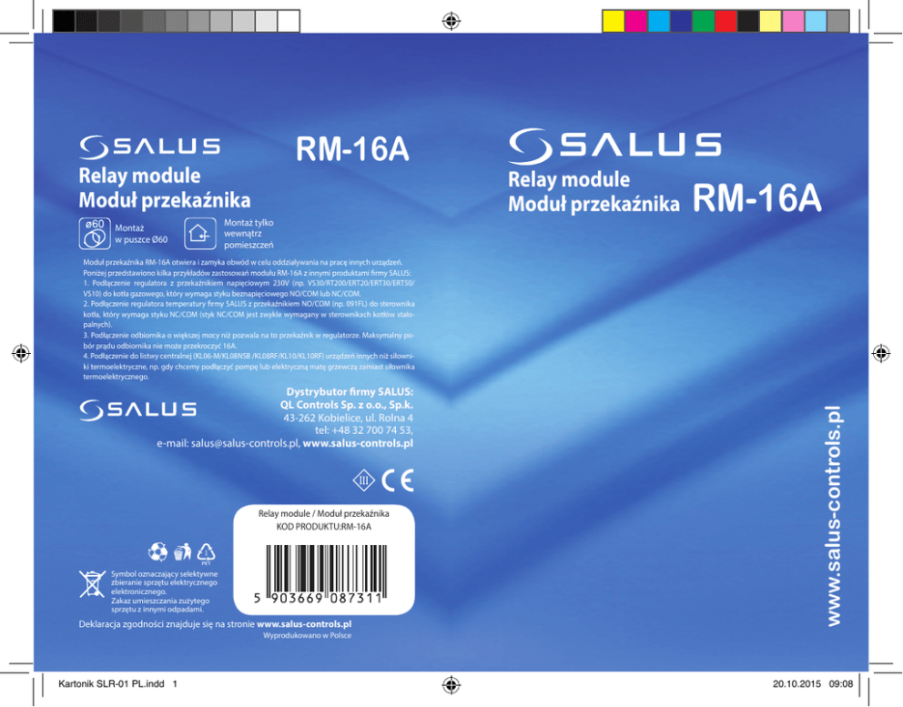 RM-16A Relay module Moduł przekaźnika Montaż w puszce Ø60 Montaż tylko wewnątrz pomieszczeń Relay module Moduł przekaźnika RM-16A Dystrybutor firmy SALUS: QL Controls Sp. z o.o., Sp.k. 43-262 Kobielice, ul. Rolna 4 tel: +48 32 700 74 53, e-mail: [email protected], www.salus-controls.pl Relay module / Moduł przekaźnika KOD PRODUKTU:RM-16A Symbol oznaczający selektywne zbieranie sprzętu elektrycznego elektronicznego. Zakaz umieszczania zużytego sprzętu z innymi odpadami. Deklaracja zgodności znajduje się na stronie www.salus-controls.pl www.salus-controls.pl Moduł przekaźnika RM-16A otwiera i zamyka obwód w celu oddziaływania na pracę innych urządzeń. Poniżej przedstawiono kilka przykładów zastosowań modułu RM-16A z innymi produktami firmy SALUS: 1. Podłączenie regulatora z przekaźnikiem napięciowym 230V (np. VS30/RT200/ERT20/ERT30/ERT50/ VS10) do kotła gazowego, który wymaga styku beznapięciowego NO/COM lub NC/COM. 2. Podłączenie regulatora temperatury firmy SALUS z przekaźnikiem NO/COM (np. 091FL) do sterownika kotła, który wymaga styku NC/COM (styk NC/COM jest zwykle wymagany w sterownikach kotłów stałopalnych). 3. Podłączenie odbiornika o większej mocy niż pozwala na to przekaźnik w regulatorze. Maksymalny pobór prądu odbiornika nie może przekroczyć 16A. 4. Podłączenie do listwy centralnej (KL06-M/KL08NSB /KL08RF/KL10/KL10RF) urządzeń innych niż siłowniki termoelektryczne, np. gdy chcemy podłączyć pompę lub elektryczną matę grzewczą zamiast siłownika termoelektrycznego. Wyprodukowano w Polsce Kartonik SLR-01 PL.indd 1 20.10.2015 09:08 BEZPIECZEŃSTWO WYGLĄD Przed podłączeniem modułu przekaźnika do innego urządzenia upewnij się, że jego parametry są zgodne ze specyfikacją modułu RM-16A. Nieprawidłowe podłączenie może spowodować złe działanie, nadmierne przegrzewanie oraz ryzyko powstania ognia. Aby zapobiec zagrożeniu, upewnij się, że moduł przekaźnika RM-16A został prawidłowo podłączony. Podłączenie urządzenia może zostać wykonane tylko przez wykwalifikowanego instalatora, posiadającego aktualne uprawnienia. Wyjście przekaźnika (NO, COM, NC) Wejście sterownika ze stykiem beznapięciowym Dioda LED sygnalizująca zwarcie styków przekaźnika WPROWADZENIE Moduł przekaźnika RM-16A otwiera i zamyka obwód w celu oddziaływania na pracę innych urządzeń. Poniżej przedstawiono kilka przykładów zastosowań modułu RM-16A z innymi produktami firmy SALUS: 1. Podłączenie regulatora z przekaźnikiem napięciowym 230V (np. VS30/RT200/ERT20/ ERT30/ERT50/VS10) do kotła gazowego, który wymaga styku beznapięciowego NO/ COM lub NC/COM. 2. Podłączenie regulatora temperatury firmy SALUS z przekaźnikiem NO/COM (np. 091FL) do sterownika kotła, który wymaga styku NC/COM (styk NC/COM jest zwykle wymagany w sterownikach kotłów stałopalnych). 3. Podłączenie odbiornika o większej mocy niż pozwala na to przekaźnik w regulatorze. Maksymalny pobór prądu odbiornika nie może przekroczyć 16A. 4. Podłączenie do listwy centralnej (KL06-M/KL08NSB /KL08RF/KL10/KL10RF) urządzeń innych niż siłowniki termoelektryczne, np. gdy chcemy podłączyć pompę lub elektryczną matę grzewczą zamiast siłownika termoelektrycznego. VOLTAGE FREE INPUT NO COM COM NO NC SL N L INPUT 230 V AC μ RM- 16A 16 A / 250 V AC 4000 VA POWER SUPPLY 230 V AC / 50 Hz PARAMETRY TECHNICZNE Zasilanie: INPUT NO/COM: OUTPUT NC/COM/NO: INPUT SL: POWER SUPPLY N/L: Wymiary: Kartonik SLR-01 PL.indd 2 16A / 250V AC, 4000VA Podłączenie regulatora z przekaźnikiem beznapięciowym NO/COM Wyjście do odbiornika Podłączenie regulatora z przekaźnikiem napięciowym 230V Zasilanie 230V AC / 50Hz 47x47x21 Zasilanie modułu RM-16A-230V AC Wejście sterownika ze stykiem napięciowym 230V 20.10.2015 09:08 SCHEMATY PODŁĄCZEŃ 1. Podłączenie regulatora z przekaźnikiem napięciowym 230V (np. VS30/RT200/ERT20/ ERT30/ERT50/VS10) do kotła gazowego, który wymaga styku beznapięciowego NO/COM. Kartonik SLR-01 PL.indd 3 SCHEMATY PODŁĄCZEŃ 2. Podłączenie regulatora temperatury firmy SALUS z przekaźnikiem NO/COM (np. 091FL) do sterownika kotła, który wymaga styku NC/COM (styk NC/COM jest zwykle wymagany w sterownikach kotłów stałopalnych). 20.10.2015 09:08 SCHEMATY PODŁĄCZEŃ 3. Podłączenie odbiornika o większej mocy niż pozwala na to przekaźnik w regulatorze. Maksymalny pobór prądu odbiornika nie może przekroczyć 16A. Kartonik SLR-01 PL.indd 4 SCHEMATY PODŁĄCZEŃ 4. Podłączenie do listwy centralnej KL06-M / KL08NSB / KL08RF / KL10 / KL10RF urządzeń innych niż siłowniki termoelektryczne, np, gdy chcemy podłączyć pompę lub elektryczną matę grzewczą zamiast siłownika termoelektrycznego. 20.10.2015 09:08