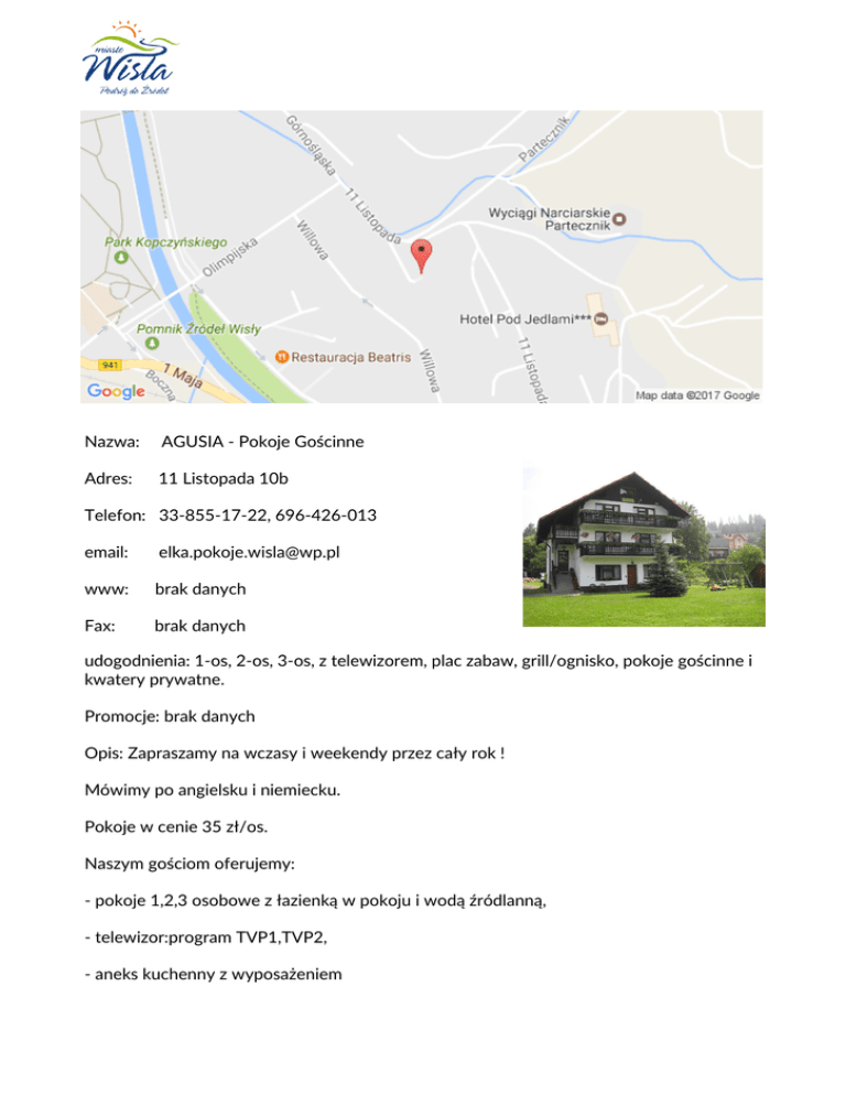 Nazwa: AGUSIA - Pokoje Gościnne Adres: 11 Listopada 10b Telefon: 33-855-17-22, 696-426-013 email: [email protected] www: brak danych Fax: brak danych udogodnienia: 1-os, 2-os, 3-os, z telewizorem, plac zabaw, grill/ognisko, pokoje gościnne i kwatery prywatne. Promocje: brak danych Opis: Zapraszamy na wczasy i weekendy przez cały rok ! Mówimy po angielsku i niemiecku. Pokoje w cenie 35 zł/os. Naszym gościom oferujemy: - pokoje 1,2,3 osobowe z łazienką w pokoju i wodą źródlanną, - telewizor:program TVP1,TVP2, - aneks kuchenny z wyposażeniem - duży ogród z regionalną chatą i grillem -bezpłatny , niestrzeżony parking, -namiot ogrodowy, krzesła i stoliki ogrodowe, - dużo miejsca dla dzieci do zabawy - piaskownica,huśtawki, Dla zainteresowanych organizujemy bezpłatne szkolenia ekonomiczne-wzory Szwecja,Szwajcaria. ekologiczne- słoneczne ogrzewanie,bufory ciepła. PIESZO: ~ Centrum - 5 min ~ sklep spożywczy - 100mb ~ gabinet kosmetyczny - 5 min ~ wyciąg narciarski oświetlony) – 200mb z możliwością zjazdu na nartach do domu, - żółty szlak turystyczny z którego możemy podziwiać panoramę Wisły, - blisko do H.Gołębiewski, w którym można skorzystać z basenów tropikalnych. - w pobliżu ośrodek sportowy Start,w którym są sale gimnastyczne, kryty basen - w sąsiedztwie parking całodobowy strzeżony z automyjnią.