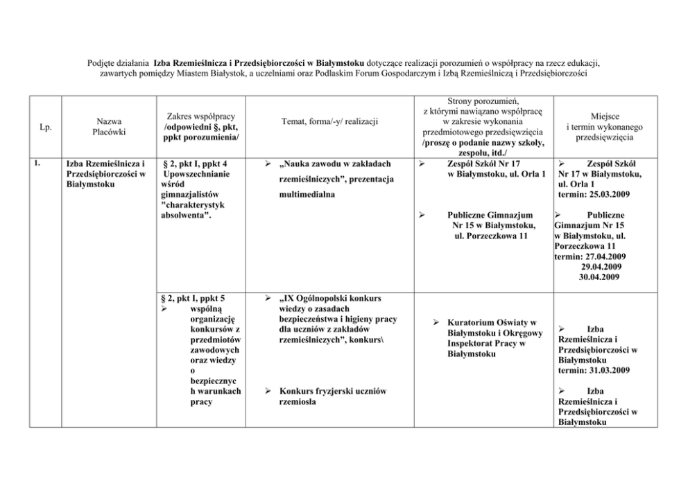 Podjęte działania Izba Rzemieślnicza i Przedsiębiorczości w Białymstoku dotyczące realizacji porozumień o współpracy na rzecz edukacji, zawartych pomiędzy Miastem Białystok, a uczelniami oraz Podlaskim Forum Gospodarczym i Izbą Rzemieślniczą i Przedsiębiorczości Lp. 1. Nazwa Placówki Izba Rzemieślnicza i Przedsiębiorczości w Białymstoku Zakres współpracy /odpowiedni §, pkt, ppkt porozumienia/ Temat, forma/-y/ realizacji § 2, pkt I, ppkt 4 Upowszechnianie wśród gimnazjalistów "charakterystyk absolwenta". „Nauka zawodu w zakładach § 2, pkt I, ppkt 5 wspólną organizację konkursów z przedmiotów zawodowych oraz wiedzy o bezpiecznyc h warunkach pracy „IX Ogólnopolski konkurs wiedzy o zasadach bezpieczeństwa i higieny pracy dla uczniów z zakładów rzemieślniczych”, konkurs\ rzemieślniczych”, prezentacja Strony porozumień, z którymi nawiązano współpracę w zakresie wykonania przedmiotowego przedsięwzięcia /proszę o podanie nazwy szkoły, zespołu, itd./ Zespół Szkół Nr 17 w Białymstoku, ul. Orla 1 multimedialna Konkurs fryzjerski uczniów rzemiosła Publiczne Gimnazjum Nr 15 w Białymstoku, ul. Porzeczkowa 11 Kuratorium Oświaty w Białymstoku i Okręgowy Inspektorat Pracy w Białymstoku Miejsce i termin wykonanego przedsięwzięcia Zespół Szkół Nr 17 w Białymstoku, ul. Orla 1 termin: 25.03.2009 Publiczne Gimnazjum Nr 15 w Białymstoku, ul. Porzeczkowa 11 termin: 27.04.2009 29.04.2009 30.04.2009 Izba Rzemieślnicza i Przedsiębiorczości w Białymstoku termin: 31.03.2009 Izba Rzemieślnicza i Przedsiębiorczości w Białymstoku termin: 22.02.2009 § 2, pkt II, ppkt 6 Inspirowanie pracodawców do aktywnego włączania się w proces kształcenia w zawodzie, w szczególności kształcenia praktycznego, jako szansy na poprawę jakości przygotowania zawodowego przyszłych kadr pracowniczych i wzrost moŜliwości zatrudnienia itd. uwaga: proszę o wypełnienie tabeli w punktach, czcionką Times New Roman 11 „Perspektywy rozwoju szkolnictwa zawodowego i kształcenia zawodowego dorosłych” - Konferencja WUP, Komenda Podlaska OHP, zespół doradczy przy MEN, przedstawiciel Departamentu Edukacji, Kultury i Sportu UM w Białymstoku. Izba Rzemieślnicza i Przedsiębiorczości w Białymstoku termin: 20.04.2009r.