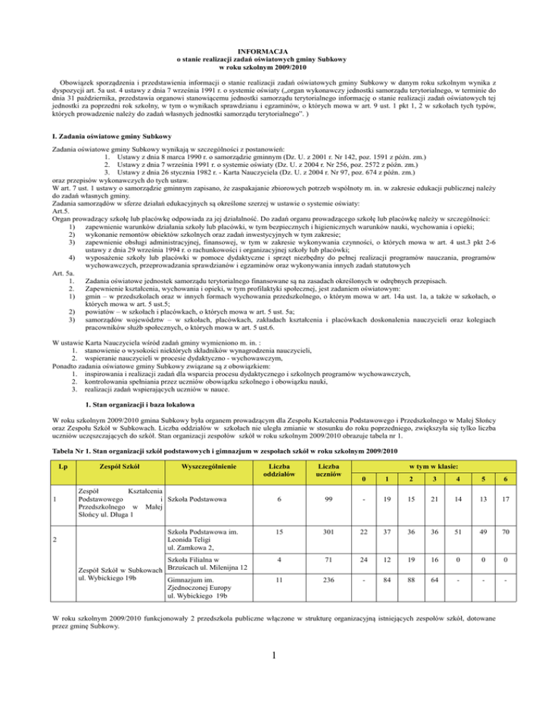 INFORMACJA o stanie realizacji zadań oświatowych gminy Subkowy w roku szkolnym 2009/2010 Obowiązek sporządzenia i przedstawienia informacji o stanie realizacji zadań oświatowych gminy Subkowy w danym roku szkolnym wynika z dyspozycji art. 5a ust. 4 ustawy z dnia 7 września 1991 r. o systemie oświaty („organ wykonawczy jednostki samorządu terytorialnego, w terminie do dnia 31 października, przedstawia organowi stanowiącemu jednostki samorządu terytorialnego informację o stanie realizacji zadań oświatowych tej jednostki za poprzedni rok szkolny, w tym o wynikach sprawdzianu i egzaminów, o których mowa w art. 9 ust. 1 pkt 1, 2 w szkołach tych typów, których prowadzenie należy do zadań własnych jednostki samorządu terytorialnego”. ) I. Zadania oświatowe gminy Subkowy Zadania oświatowe gminy Subkowy wynikają w szczególności z postanowień: 1. Ustawy z dnia 8 marca 1990 r. o samorządzie gminnym (Dz. U. z 2001 r. Nr 142, poz. 1591 z późn. zm.) 2. Ustawy z dnia 7 września 1991 r. o systemie oświaty (Dz. U. z 2004 r. Nr 256, poz. 2572 z późn. zm.) 3. Ustawy z dnia 26 stycznia 1982 r. - Karta Nauczyciela (Dz. U. z 2004 r. Nr 97, poz. 674 z późn. zm.) oraz przepisów wykonawczych do tych ustaw. W art. 7 ust. 1 ustawy o samorządzie gminnym zapisano, że zaspakajanie zbiorowych potrzeb wspólnoty m. in. w zakresie edukacji publicznej należy do zadań własnych gminy. Zadania samorządów w sferze działań edukacyjnych są określone szerzej w ustawie o systemie oświaty: Art.5. Organ prowadzący szkołę lub placówkę odpowiada za jej działalność. Do zadań organu prowadzącego szkołę lub placówkę należy w szczególności: 1) zapewnienie warunków działania szkoły lub placówki, w tym bezpiecznych i higienicznych warunków nauki, wychowania i opieki; 2) wykonanie remontów obiektów szkolnych oraz zadań inwestycyjnych w tym zakresie; 3) zapewnienie obsługi administracyjnej, finansowej, w tym w zakresie wykonywania czynności, o których mowa w art. 4 ust.3 pkt 2-6 ustawy z dnia 29 września 1994 r. o rachunkowości i organizacyjnej szkoły lub placówki; 4) wyposażenie szkoły lub placówki w pomoce dydaktyczne i sprzęt niezbędny do pełnej realizacji programów nauczania, programów wychowawczych, przeprowadzania sprawdzianów i egzaminów oraz wykonywania innych zadań statutowych Art. 5a. 1. Zadania oświatowe jednostek samorządu terytorialnego finansowane są na zasadach określonych w odrębnych przepisach. 2. Zapewnienie kształcenia, wychowania i opieki, w tym profilaktyki społecznej, jest zadaniem oświatowym: 1) gmin – w przedszkolach oraz w innych formach wychowania przedszkolnego, o którym mowa w art. 14a ust. 1a, a także w szkołach, o których mowa w art. 5 ust.5; 2) powiatów – w szkołach i placówkach, o których mowa w art. 5 ust. 5a; 3) samorządów województw – w szkołach, placówkach, zakładach kształcenia i placówkach doskonalenia nauczycieli oraz kolegiach pracowników służb społecznych, o których mowa w art. 5 ust.6. W ustawie Karta Nauczyciela wśród zadań gminy wymieniono m. in. : 1. stanowienie o wysokości niektórych składników wynagrodzenia nauczycieli, 2. wspieranie nauczycieli w procesie dydaktyczno - wychowawczym, Ponadto zadania oświatowe gminy Subkowy związane są z obowiązkiem: 1. inspirowania i realizacji zadań dla wsparcia procesu dydaktycznego i szkolnych programów wychowawczych, 2. kontrolowania spełniania przez uczniów obowiązku szkolnego i obowiązku nauki, 3. realizacji zadań wspierających uczniów w nauce. 1. Stan organizacji i baza lokalowa W roku szkolnym 2009/2010 gmina Subkowy była organem prowadzącym dla Zespołu Kształcenia Podstawowego i Przedszkolnego w Małej Słońcy oraz Zespołu Szkół w Subkowach. Liczba oddziałów w szkołach nie uległa zmianie w stosunku do roku poprzedniego, zwiększyła się tylko liczba uczniów uczęszczających do szkół. Stan organizacji zespołów szkół w roku szkolnym 2009/2010 obrazuje tabela nr 1. Tabela Nr 1. Stan organizacji szkół podstawowych i gimnazjum w zespołach szkół w roku szkolnym 2009/2010 Lp 1 2 Zespół Szkół Wyszczególnienie Liczba oddziałów Liczba uczniów 6 1 2 3 4 5 6 99 - 19 15 21 14 13 17 15 301 22 37 36 36 51 49 70 4 71 24 12 19 16 0 0 0 11 236 - 84 88 64 - - - Zespół Kształcenia Podstawowego i Szkoła Podstawowa Przedszkolnego w Małej Słońcy ul. Długa 1 Szkoła Podstawowa im. Leonida Teligi ul. Zamkowa 2, Szkoła Filialna w Zespół Szkół w Subkowach Brzuścach ul. Milenijna 12 ul. Wybickiego 19b Gimnazjum im. Zjednoczonej Europy ul. Wybickiego 19b w tym w klasie: 0 W roku szkolnym 2009/2010 funkcjonowały 2 przedszkola publiczne włączone w strukturę organizacyjną istniejących zespołów szkół, dotowane przez gminę Subkowy. 1 Tabela Nr 2. Stan organizacji przedszkoli publicznych Lp Zespół Szkół Wyszczególnienie Liczba uczniów Liczba oddziałów 1 Zespół Kształcenia Podstawowego i Przedszkolnego w Małej Słońcy ul. Długa 1 Przedszkole Samorządowe 38 „0”-14 „M”-24 2 2 Zespół Szkół w Subkowach ul. Wybickiego 19b Przedszkole Samorządowe 44 2 Gmina Subkowy podpisała 4 kwietnia 2009 r. porozumienie z Gminą miejską Tczew w sprawie refundacji kosztów dotacji udzielonej przez Gminę Miejską Tczew przedszkolom publicznym oraz niepublicznym prowadzonym przez inne osoby prawne lub osoby fizyczne na terenie Gminy Miejskiej Tczew na uczniów będącymi mieszkańcami gminy Subkowy. Refundacja kosztów dotacji udzielonej w okresie od września do grudnia 2009 r. wyniosła 6.892,00 zł. W dniu 7 kwietnia 2010 r. również Gmina Subkowy podpisała porozumienie z Gminą miejską Tczew i refundacja kosztów dotacji udzielonej w okresie od stycznia do sierpnia 2010 r. wyniosła 15.670,40 zł. Obowiązek rocznego przygotowania przedszkolnego na terenie gminy Subkowy przedstawiał się następująco: Tabela Nr 3. Obowiązek przygotowania przedszkolnego Lp Plac