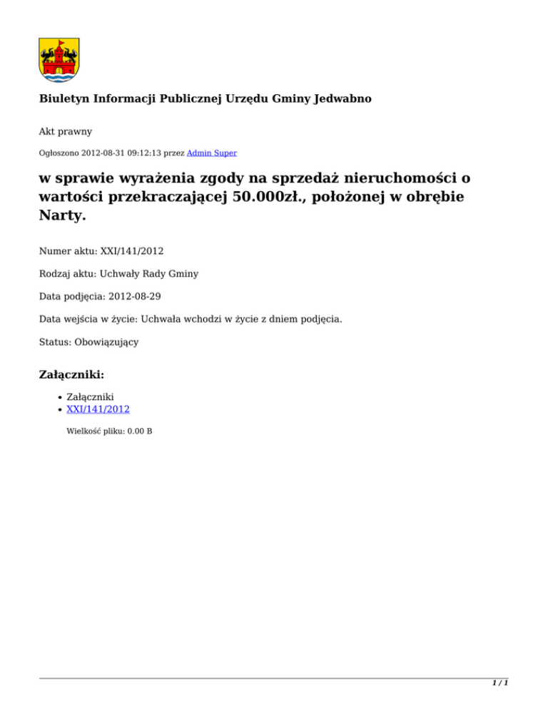 Biuletyn Informacji Publicznej Urzędu Gminy Jedwabno Akt prawny Ogłoszono 2012-08-31 09:12:13 przez Admin Super w sprawie wyrażenia zgody na sprzedaż nieruchomości o wartości przekraczającej 50.000zł., położonej w obrębie Narty. Numer aktu: XXI/141/2012 Rodzaj aktu: Uchwały Rady Gminy Data podjęcia: 2012-08-29 Data wejścia w życie: Uchwała wchodzi w życie z dniem podjęcia. Status: Obowiązujący Załączniki: Załączniki XXI/141/2012 Wielkość pliku: 0.00 B 1/1