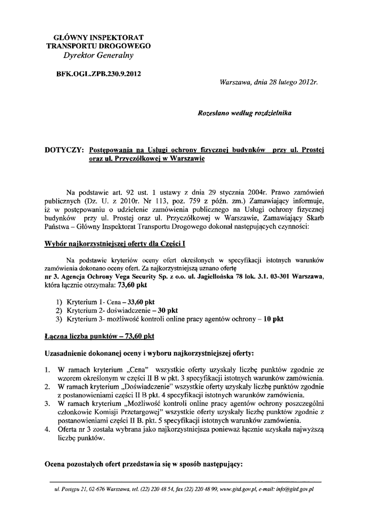 GLOWNYINSPEKTORAT TRANSPORTU DROGOWEGO Dyrektor Generalny BFK.OGL.ZPB.230.9.2012 Warszawa, dnia 28 lutego 2012r. Rozestano wedlug rozdzielnika DOTYCZY: Postepowania na Uslugi ochrony fizycznei budynkow przy ul. Prostej oraz ul. Przyczolkowei w Warszawie Na podstawie art. 92 ust. 1 ustawy z dnia 29 stycznia 2004r. Prawo zamowien publicznych (Dz. U. z 2010r. Nr 113, poz. 759 z pozn. zm.) Zamawiajacy informuje, iz w postepowaniu o udzielenie zamowienia publicznego na Ushigi ochrony fizycznej budynkow przy ul. Prostej oraz ul. Przyczolkowej w Warszawie, Zamawiajacy Skarb Panstwa - Glowny Inspektorat Transportu Drogowego dokonal nastepujacych czynnosci: Wvbor naikorzvstnieiszei ofertv dla Czesci I Na podstawie kryteriow oceny ofert okreslonych w specyfikacji istotnych warunkow zamowienia dokonano oceny ofert. Za najkorzystniejsza uznano oferte nr 3. Agencja Ochrony Vega Security Sp. z o.o. ul. Jagiellonska 78 lok. 3.1. 03-301 Warszawa, ktora t^cznie otrzymala: 73,60 pkt 1) Kryterium 1- Cena - 33,60 pkt 2) Kryterium 2- doswiadczenie - 30 pkt 3) Kryterium 3- mozliwosc kontroli online pracy agentow ochrony - 10 pkt Laczna liczba punktow - 73.60 pkt Uzasadnienie dokonanej oceny i wyboru najkorzystniejszej oferty: 1. 2. 3. 4. W ramach kryterium „Cena" wszystkie oferty uzyskaly liczbe punktow zgodnie ze wzorem okreslonym w czesci II B w pkt. 3 specyfikacji istotnych warunkow zamowienia. W ramach kryterium „Doswiadczeme" wszystkie oferty uzyskaly liczbe punktow zgodnie z postanowieniami czesci II B pkt. 4 specyfikacji istotnych warunkow zamowienia. W ramach kryterium „Mozliwosc kontroli online pracy agentow ochrony poszczegolni czlonkowie Komisji Przetargowej" wszystkie oferty uzyskaly liczbe punktow zgodnie z postanowieniami czesci II B. pkt. 5 specyfikacji istotnych warunkow zamowienia. Oferta nr 3 zostala wybrana jako najkorzystniejsza poniewaz lacznie uzyskala najwyzsz^ liczbe punktow. Ocena pozostalych ofert przedstawia si$ w sposob nastejmjacy: ul Postt>pu 21, 02-676 Warszawa, tel. (22) 220 48 54, fax (22) 220 48 99, www.gitd.gov.pl, e-mail: [email protected] Oferta nr 1: Biuro ochrony mienia i osob Albatros ul. Powstancow Warszawskich 9, 06-400 Ciechanow 1) Kryterium 1-Cena-28,80 pkt 2) Kryterium 2- doswiadczenie - 30 pkt 3) Kryterium 3- mozliwosc kontroli online pracy agentow ochrony - 0 pkt Laczna liczba punktow - Oferta nr 2: 58.80 pkt Konsorcjum Agencja Ochrony ARGUS Sp. z o.o. i Argus Groupl Sp. z o.o. ul. Pilsudskiego 16B/5, 96-500 Sochaczew 4) Kryterium 1- Cena - 40,80 pkt 5) Kryterium 2- doswiadczenie - 30 pkt 6) Kryterium 3- mozliwosc kontroli online pracy agentow ochrony - 0 pkt Laczna liczba punktow - 70.80 pkt Oferta nr 4: Agencja Ochrony osob i mienia Reflex Sp. z o.o. ul. Waiowa 45, 26-600 Radom 1) Kryterium 1- Cena -19,20 pkt 2) Kryterium 2- doswiadczenie - 30 pkt 3) Kryterium 3- mozliwosc kontroli online pracy agentow ochrony - 10 pkt Laczna liczba punktow - 59.20 pkt Oferta nr 5: Pol- patrol Security ul. Wolska 75, 01-229 Warszawa 1) Kryterium 1- Cena - 31,80 pkt 2) Kryterium 2- doswiadczenie - 30 pkt 3) Kryterium 3- mozliwosc kontroli online pracy agentow ochrony - 0 pkt Laczna liczba punktow - 61.80 pkt Oferta nr 6: G4S Secure Solutions (Polska) Sp. z o.o. ul. Prosta 69 , 00-838 Warszawa 4) Kryterium 1- Cena - 0 pkt 5) Kryterium 2- doswiadczenie —30 pkt 6) Kryterium 3- mozliwosc kontroli online pracy agentow ochrony - 10 pkt Laczna liczba punktow - 40 pkt ul. Postepu 21, 02-676 Warszawa, tel. (22) 220 48 88, fax (22) 220 48 98, www.gitd.gov.pl, e-mail: [email protected] Oferta nr 7: Impuls sp. z o.o. 00-532 Warszawa ul .Wilcza 18/12 1) Kryterium 1- Cena - 30,60 pkt 2) Kryterium 2- doswiadczenie - 30 pkt 3) Kryterium 3- mozliwosc kontroli online pracy agentow ochrony - 10 pkt Laczna liczba punktow - 70.60 pkt Oferta nr 8: Agencja Ochrony mienia „Aromig" Sp. z o.o. 02-255 Warszawa 1) Kryterium 1- Cena - 20,40 pkt 2) Kryterium 2- doswiadczenie - 30 pkt 3) Kryterium 3- mozliwosc kontroli online pracy agentow ochrony - 10 pkt Laczna liczba punktow - 60.40 pkt Oferta nr 9: Pleban Sp. z o.o. ul. Bernardynska 14 A, 02-904 Warszawa 1) Kryterium 1- Cena -14,40 pkt 2) Kryterium 2- doswiadczenie - 20 pkt 3) Kryterium 3- mozliwosc kontroli online pracy agentow ochrony - 10 pkt Laczna liczba punktow - 44.40 pkt Oferta nr 10: Agencja Ochrony GLOK Miroslaw Malczynski ul. Gorczewska 62/64 01-401 Warszawa 1) Kryterium 1- Cena - 24,00 pkt 2) Kryterium 2- doswiadczenie - 20 pkt 3) Kryterium 3- mozliwosc kontroli online pracy agentow ochrony - 0 pkt Laczna liczba punktow - 44.00 pkt Oferta nr 11: Konsalnet Holding S.A. 01-756 Warszawa ul. Przasnyska 6a 1) Kryterium 1- Cena -19,20 pkt 2) Kryterium 2- doswiadczenie - 30 pkt 3) Kryterium 3- mozliwosc kontroli online pracy agentow ochrony - 10 pkt Laczna liczba punktow - 59.20 pkt Oferta nr 12: Agencja ochrony Juwentus PUH Sp. j Kalinska M.B., Kalinski R., Michalski J. ul. Poloneza 91 Warszawa 1) Kryterium 1- Cena -18,00 pkt 2) Kryterium 2- doswiadczenie - 30 pkt 3) Kryterium 3- mozliwosc kontroli online pracy agentow ochrony - 0 pkt Laczna liczba punktow - 48.00 pkt ul. Postepu 21, 02-676 Warszawa, tel. (22) 220 48 88, fax (22) 220 48 98, www.gitd.gov.pl, e-mail: [email protected] Oferta nr 13: Solid Sp. z o.o. ul. Tyniecka 18, 30-323 Krakow 1) Kryterium 1- Cena - 38,40 pkt 2) Kryterium 2- doswiadczenie - 20 pkt 3) Kryterium 3- mozliwosc kontroli online pracy agentow ochrony - 10 pkt Laczna liczba punktow - 68.40 pkt Wvbor naikorzystnieiszei oferty dla Czesci II Na podstawie kryteriow oceny ofert okreslonych w specyfikacji istotnych warunkow zamowienia dokonano oceny ofert. Za najkorzystniejsza uznano oferty nr 2. Konsorcjum Agencja Ochrony ARGUS Sp. z o.o. i Argus Groupl Sp. z o.o. ul. Pilsudskiego 16B/5, 96-500 Sochaczew, ktora lacznie otrzymala: 90,00 pkt 1) Kryterium 1- Cena - 60,00 pkt 2) Kryterium 2- doswiadczenie - 30 pkt 3) Kryterium 3- mozliwosc kontroli online pracy agentow ochrony - 0 pkt Laczna liczba punktow - 90.00 pkt Uzas