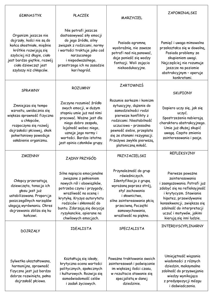 GIMNASTYK PŁACZEK Organizm jeszcze nie dojrzały, kości nie są do końca skostniałe, mięśnie krótkie rozwijają się szybciej niż długie, ciało jest bardzo giętkie, rozwój ciała dziewcząt jest szybszy niż chłopców. Nie potrafi jeszcze dostosowywać siły emocji do jego źródła, silny związek z rodzicami, normy i wartości traktuje jako coś narzucanego i niepodważalnego, przestrzega ich na zasadzie kar/nagród. SPRAWNY Zmniejsza się tempo wzrostu, uwidacznia się większa sprawność fizyczna u chłopców, rozpoczyna się rozwój dojrzałości płciowej, skok pokwitaniowy powoduje osłabienie organizmu. ZMIENNY Chłopcy przerastają dziewczęta, tonacja ich głosu jest już ustabilizowana. Proporcje poszczególnych narządów ulegają wyrównaniu. Okres dojrzewania zbliża się ku końcowi. DOJRZAŁY Sylwetka ukształtowana, harmonijna, sprawność fizyczna jest już bardzo dobrze rozwinięta, pełna dojrzałość płciowa. ROZUMNY ZAPOMINALSKI MARZYCIEL Posiada ogromną wyobraźnię, nie zawsze potrafi nad nią panować, daje ponieść się wodzy fantazji. Woli zajęcia niekoedukacyjne. Pamięć i uwaga mimowolna przekształca się w dowolną, Posiada problemy ze skupieniem uwagi. Najczęściej nie rozumuje jeszcze na poziomie abstrakcyjnym – operuje konkretami. ŻARTOWNIŚ SKUPIONY Zaczyna rozumieć źródło swych emocji, w dużym stopniu umie już nad nimi pracować. Ważne jest dla niego dobro zespołu, lojalność wobec niego, uznaje jego normy i wartości. Bardzo istotna jest opinia członków grupy. ŻĄDNY PRZYGÓD Silne napięcia emocjonalne związane z pełnieniem nowych ról i obowiązków, potrzeba czynu i przygody, wrażliwość na ocenę i krytykę. Kryzys autorytetu rodziców i skłonność do buntu. Zdarzają się decyzje ryzykanckie, opierane na chwilowych emocjach. Rozumie sarkazm i komizm sytuacyjny, dążenie do samodzielności rodzi pierwsze konflikty z rodzicami. Niestabilność uczuciowa – przesadna pewność siebie, przeplata się ze stanami rezygnacji. Przeżywa zwykle pierwszą, platoniczną miłość. PRZYJACIELSKI Przynależność do grup rówieśniczych. Identyfikacja z grupą wyrażaną poprzez strój, styl zachowania i słownictwo, silne zainteresowanie płcią przeciwną. Początki samowychowania, wrażliwość na piękno. IDEALISTA SPECJALISTA Kształtują się ideały, krytyczna ocena wartości politycznych, społecznych i kulturowych. Rozwija się samoświadomość celów i zadań życiowych. Poważne traktowanie swoich zainteresowań i poświęcanie im większej ilości czasu, w rezultacie stawanie się specjalistą w danej dziedzinie. Dopiero uczy się, jak się uczyć. Spostrzeżenia nabierają charakteru abstrakcyjnego. Umie już dłużej skupić uwagę. Często zmienia zainteresowania i pasje. REFLEKSYJNY Pierwsze poważne zainteresowania i zaangażowania. Potrafi już zdobyć się na refleksyjność i krytycyzm. Stawianie hipotez, przewidywanie konsekwencji, zwiększa się zdolność do interpretacji uczuć i motywów, jakimi kierują się inni ludzie. INTERDYSCYPLINARNY Umiejętność wiązania wiadomości z różnych dziedzin, maksymalna zdolność do przyswajania wiedzy wynikająca z predyspozycji mózgu i doświadczenia. ZŁODZIEJ ZŁODZIEJ ZŁODZIEJ ZŁODZIEJ W dowolnym momencie możesz zabrać jedną z cech od postaci innego gracza. Karta jednorazowego użytku. W dowolnym momencie możesz zabrać jedną z cech od postaci innego gracza. Karta jednorazowego użytku. W dowolnym momencie możesz zabrać jedną z cech od postaci innego gracza. Karta jednorazowego użytku. W dowolnym momencie możesz zabrać jedną z cech od postaci innego gracza. Karta jednorazowego użytku. INTROWERTYK INTROWERTYK INTROWERTYK INTROWERTYK Użyj tej karty względem jednej ze swoich postaci, aby zyskała cechę, której jeszcze nie posiada. Możesz użyć tej karty tylko w momencie, kiedy potrafisz nazwać brakującą cechę. Użyj tej karty względem jednej ze swoich postaci, aby zyskała cechę, której jeszcze nie posiada. Możesz użyć tej karty tylko w momencie, kiedy potrafisz nazwać brakującą cechę. Użyj tej karty względem jednej ze swoich postaci, aby zyskała cechę, której jeszcze nie posiada. Możesz użyć tej karty tylko w momencie, kiedy potrafisz nazwać brakującą cechę. Użyj tej karty względem jednej ze swoich postaci, aby zyskała cechę, której jeszcze nie posiada. Możesz użyć tej karty tylko w momencie, kiedy potrafisz nazwać brakującą cechę. ZŁODZIEJ ZŁODZIEJ PODMIENIACZ Użyj tej karty względem jednej ze swoich postaci, aby zyskała cechę, której jeszcze nie posiada. Możesz użyć tej karty tylko w momencie, kiedy potrafisz nazwać brakującą cechę. W dowolnym momencie możesz zabrać jedną z cech od postaci innego gracza. Karta jednorazowego użytku. W dowolnym momencie możesz zabrać jedną z cech od postaci innego gracza. Karta jednorazowego użytku. W dowolnym momencie możesz zamienić jedną ze swoich postaci z postacią innego gracza. Karta jednorazowego użytku. PODMIENIACZ PODMIENIACZ PODMIENIACZ PODMIENIACZ W dowolnym momencie możesz zamienić jedną ze swoich postaci z postacią innego gracza. Karta jednorazowego użytku. W dowolnym momencie możesz zamienić jedną ze swoich postaci z postacią innego gracza. Karta jednorazowego użytku. W dowolnym momencie możesz zamienić jedną ze swoich postaci z postacią innego gracza. Karta jednorazowego użytku. W dowolnym momencie możesz zamienić jedną ze swoich postaci z postacią innego gracza. Karta jednorazowego użytku. INTROWERTYK ZUCH ZUCH ZUCH ZUCH ZUCH ZUCH ZUCH ZUCH ZUCH ZUCH ZUCH HARCERZ ZUCH ZUCH HARCERZ HARCERZ ZUCH HARCERZ HARCERZ HARCERZ HARCERZ HARCERZ HARCERZ HARCERZ HARCERZ HARCERZ HARCERZ HARCERZ HARCERZ HARCERZ HARCERZ HARCERZ STARSZY HARCERZ HARCERZ HARCERZ STARSZY HARCERZ STARSZY HARCERZ HARCERZ STARSZY HARCERZ STARSZY HARCERZ STARSZY HARCERZ STARSZY HARCERZ STARSZY HARCERZ STARSZY HARCERZ STARSZY HARCERZ S