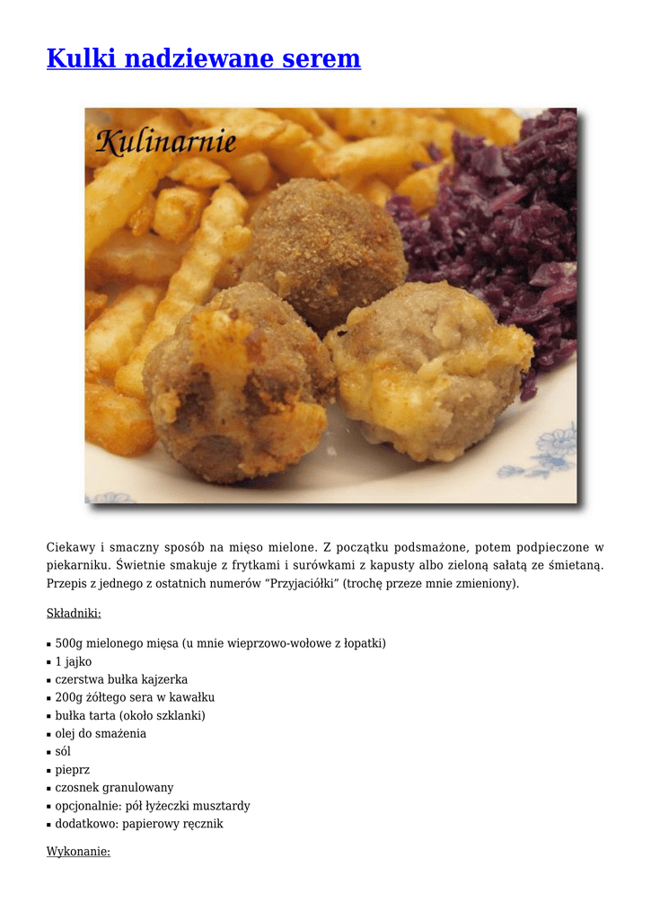 Kulki nadziewane serem Ciekawy i smaczny sposób na mięso mielone. Z początku podsmażone, potem podpieczone w piekarniku. Świetnie smakuje z frytkami i surówkami z kapusty albo zieloną sałatą ze śmietaną. Przepis z jednego z ostatnich numerów “Przyjaciółki” (trochę przeze mnie zmieniony). Składniki: ■ ■ ■ ■ ■ ■ ■ ■ ■ ■ ■ 500g mielonego mięsa (u mnie wieprzowo-wołowe z łopatki) 1 jajko czerstwa bułka kajzerka 200g żółtego sera w kawałku bułka tarta (około szklanki) olej do smażenia sól pieprz czosnek granulowany opcjonalnie: pół łyżeczki musztardy dodatkowo: papierowy ręcznik Wykonanie: 1. Kajzerkę namaczamy w wodzie. Ser kroimy w grubą kostkę. 2. Mięso wyrabiamy z musztardą, jajem i dwiema łyżkami bułki tartej. Dodajemy odciśniętą bułkę, wyrabiamy. Doprawiamy solą (niedużo), pieprzem i czosnkiem. 3. Formujemy klopsiki, do każdego wkładamy kostkę sera i oblepiamy mięsem. 4. Klopsy obtaczamy w bułce tartej i smażymy na złoto z każdej strony na mocno rozgrzanym (głębszym) oleju. 5. Klopsy osączamy z tłuszczu na papierowych ręcznikach, po czym przekładamy do formy żaroodpornej i zapiekamy w piekarniku przez około 10-15 minut. Podajemy gorące. Kotleciki w pomidorach Kotleciki mielone, które po usmażeniu podduszam jeszcze dodatkowo w pomidorach. Są bardzo aromatyczne i tak samo smaczne z ziemniakami, jak i z makaronami. Składniki: ■ ■ ■ ■ ■ ■ ■ ■ ■ ■ ■ ok. 400g mięsa mielonego (najlepiej mieszanego) 1 całe jajko czerstwa kajzerka lub inna bułka (u mnie z ziarnami) 1 łyżka oregano 2 łyżki musztardy 2 łyżki sosu czosnkowego bułka tarta 2-3 łyżki kaszy manny ok. 400g pomidorów w puszce (pokrojonych) pieprz czarny (najlepiej świeżo utarty) opcjonalnie Ziarenka Smaku Winiary (lub inna przyprawa uniwersalna) Wykonanie: 1. Bułkę namaczamy w wodzie lub w mleku. 2. Mięso wrzucamy do miski, dodajemy jajko, kaszę mannę, sos czosnkowy, musztardę, oregano oraz odciśniętą bułkę. Wyrabiamy wszystko razem. Dodajemy trochę tartej bułki, tyle, by masa się nie rozpadała, doprawiamy pieprzem i Ziarenkami i dokładnie mieszamy. 3. Wilgotnymi dłońmi formujemy kotleciki, obtaczamy je w bułce tartej i smażymy na złoto z obu stron. 4. Do garnka wlewamy pomidory z puszki wraz z zalewą, zagotowujemy. 5. Do pomidorów wkładamy usmażone kotleciki i zalewamy wodą tak, by w całości były przykryte. 6. Przykrywamy i dusimy na małym ogniu przez 10 minut. Mielone z grzankami Drobiowe kotlety mielone z dodatkiem chrupiących grzanek i musztardy, dzięki czemu nie są mdłe, ale wyraziste w smaku i bardzo smaczne. U nas z ziemniaczanym puree i sałatką z pomidorów. Składniki: ■ ■ 400g mięsa mielonego z drobiu (może być mielonka indycza) 3 duże kromki chleba pszennego ■ ■ ■ ■ ■ ■ ■ ■ ■ 3 łyżki mleka 2 lekko czubate łyżeczki musztardy (delikatesowej, bądź sarepskiej) 3 łyżki bułki tartej całe jajo 1 łyżka masła sól czarny pieprz (najlepiej świeżo mielony) papryka w proszku masło i oliwa z oliwek do smażenia Wykonanie: 1. Kromki chleba kroimy w kostkę i zrumieniamy na suchej, teflonowej patelni na średnim ogniu. Kiedy wyschną i się zrumienią, dodajemy płaską łyżkę masła i mieszamy. Zdejmujemy z ognia i odstawiamy. 2. Mięso wrzucamy do miski, dodajemy jajo, bułkę tartą, mleko, musztardę i wyrabiamy. Dodajemy grzanki, mieszamy, doprawiamy odrobiną soli oraz pieprzem i papryką. 3. Smażymy bez panierki na oliwie wymieszanej z masłem (mniej więcej w proporcji 1:1) na małym ogniu, do zrumienienia z obu stron. Pulpety w sosie pomidorowym Smaczna odmiana dla lubiących mięso mielone w każdej postaci. Do tych lubiących mielone zalicza się choćby mój mąż ;) Dla niego otoczka nie ma większego znaczenia, jeśli w tej otoczce będzie cokolwiek z mielonego mięsa. Tak więc dzisiaj serwuję pulpety z pomidorowym sosem i surówkę. Składniki: ■ ■ ■ ■ ■ ■ ■ ■ 400-450g mięsa mielonego (wieprzowo-wołowego bądź mieszanego) czerstwa bułka kajzerka lub grahamka pół szklanki bułki tartej jajko gruby szczypior sól pieprz olej do smażenia Składniki na sos: ■ ■ ■ ■ ■ ■ ■ puszka pomidorów w sosie własnym (ok. 400g) 2 średnie cebule 1 średnia marchew płaska łyżeczka oregano 3 łyżki koncentratu pomidorowego świeżo utarty czarny pieprz czosnek granulowany ■ sól Wykonanie: 1. Bułkę namaczamy w wodzie. 2. Marchew obieramy, kroimy w kostkę i gotujemy w niewielkiej ilości wody do miękkości. 3. Mięso wkładamy do miski. Wbijamy jajko, wsypujemy 3-4 łyżki bułki tartej, grubo posiekany szczypior oraz odciśniętą bułkę. Wyrabiamy masę mięsną, doprawiamy lekko solą i pieprzem. 4. Cebule siekamy na drobno, podsmażamy na oleju. Obsypujemy ją leciutko granulowanym czosnkiem i smażymy na wolnym ogniu przez około kwadrans. 5. Z masy mięsnej formujemy małe kotleciki, obtaczamy je w bułce tartej i smażymy na małym ogniu na oleju, z każdej strony na rumiano. 6. Do cebuli wlewamy pomidory z puszki i dodajemy koncentrat pomidorowy. Mieszamy. Dodajemy ugotowaną, miękką marchew, doprawiamy oregano, czarnym, świeżo utartym pieprzem oraz w miarę potrzeby – solą. Jeśli sos jest zbyt gęsty, można dolać kilka łyżek wody. Dusimy kilkanaście minut na małym ogniu. 7. Usmażone kotlety przekładamy do garnka, zalewamy sosem, przykrywamy, żeby się lekko “przegryzły”. Podajemy z ziemniakami i surówkami lub zieloną sałatą. Frykadelki z serem Taka nasza domowa wariacja (kolejna) na rzecz mielonego mięsa, żeby nie było za nudno. Kotleciki z dodatkiem żółtego sera zyskują na ostrzejszym smaku i bardziej jedwabistej konsystencji. Są trochę cięższe od tradycyjnych, ale naprawdę warto ich posmakować. Składniki: ■ ■ ■ ■ ■ ■ ■ ■ ■ 400g mięsa mielonego z drobiu lub mieszanego z przewagą drobiowego 200g tartego żółtego sera 