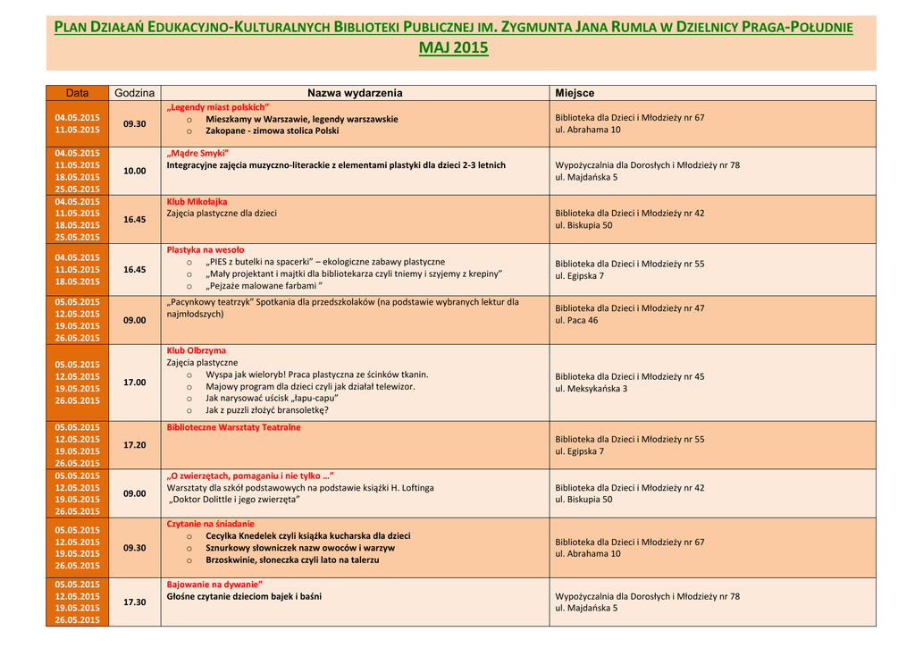 PLAN DZIAŁAŃ EDUKACYJNO-KULTURALNYCH BIBLIOTEKI PUBLICZNEJ IM. ZYGMUNTA JANA RUMLA W DZIELNICY PRAGA-POŁUDNIE MAJ 2015 Data 04.05.2015 11.05.2015 04.05.2015 11.05.2015 18.05.2015 25.05.2015 04.05.2015 11.05.2015 18.05.2015 25.05.2015 04.05.2015 11.05.2015 18.05.2015 05.05.2015 12.05.2015 19.05.2015 26.05.2015 05.05.2015 12.05.2015 19.05.2015 26.05.2015 05.05.2015 12.05.2015 19.05.2015 26.05.2015 05.05.2015 12.05.2015 19.05.2015 26.05.2015 05.05.2015 12.05.2015 19.05.2015 26.05.2015 05.05.2015 12.05.2015 19.05.2015 26.05.2015 Nazwa wydarzenia Godzina 09.30 10.00 16.45 16.45 09.00 17.00 „Legendy miast polskich” o Mieszkamy w Warszawie, legendy warszawskie o Zakopane - zimowa stolica Polski „Mądre Smyki” Integracyjne zajęcia muzyczno-literackie z elementami plastyki dla dzieci 2-3 letnich Klub Mikołajka Zajęcia plastyczne dla dzieci Plastyka na wesoło o „PIES z butelki na spacerki” – ekologiczne zabawy plastyczne o „Mały projektant i majtki dla bibliotekarza czyli tniemy i szyjemy z krepiny” o „Pejzaże malowane farbami ” „Pacynkowy teatrzyk” Spotkania dla przedszkolaków (na podstawie wybranych lektur dla najmłodszych) Klub Olbrzyma Zajęcia plastyczne o Wyspa jak wieloryb! Praca plastyczna ze ścinków tkanin. o Majowy program dla dzieci czyli jak działał telewizor. o Jak narysować uścisk „łapu-capu” o Jak z puzzli złożyć bransoletkę? Miejsce Biblioteka dla Dzieci i Młodzieży nr 67 ul. Abrahama 10 Wypożyczalnia dla Dorosłych i Młodzieży nr 78 ul. Majdańska 5 Biblioteka dla Dzieci i Młodzieży nr 42 ul. Biskupia 50 Biblioteka dla Dzieci i Młodzieży nr 55 ul. Egipska 7 Biblioteka dla Dzieci i Młodzieży nr 47 ul. Paca 46 Biblioteka dla Dzieci i Młodzieży nr 45 ul. Meksykańska 3 Biblioteczne Warsztaty Teatralne Biblioteka dla Dzieci i Młodzieży nr 55 ul. Egipska 7 17.20 09.00 09.30 17.30 „O zwierzętach, pomaganiu i nie tylko …” Warsztaty dla szkół podstawowych na podstawie książki H. Loftinga „Doktor Dolittle i jego zwierzęta” Czytanie na śniadanie o Cecylka Knedelek czyli książka kucharska dla dzieci o Sznurkowy słowniczek nazw owoców i warzyw o Brzoskwinie, słoneczka czyli lato na talerzu Bajowanie na dywanie” Głośne czytanie dzieciom bajek i baśni Biblioteka dla Dzieci i Młodzieży nr 42 ul. Biskupia 50 Biblioteka dla Dzieci i Młodzieży nr 67 ul. Abrahama 10 Wypożyczalnia dla Dorosłych i Młodzieży nr 78 ul. Majdańska 5 06.05.2015 13.05.2015 20.05.2015 27.05.2015 06.05.2015 13.05.2015 20.05.2015 27.05.2015 07.05.2015 14.05.2015 21.05.2015 28.05.2015 10.00 12.00 10.00 Zajęcia Fundacji Edukacji Międzykulturowej Kręć się Kołowrotku! Dżinsowe ubranie dla żyrafy. „Latarnik” Pomoc komputerowa dla seniorów Zajęcia literacko-plastyczne o „Biuro detektywistyczne Lassego i Mai „Tajemnica szkoły”. Co to jest proszek daktyloskopijny? czyli spotkanie z książką. o Spotkanie z książką „ Magiczne drzewo” A. Maleszki. Uwaga! Puszcza Amazońska czyli odwiedzamy Brazylię Salonik literacki. o Spotkanie z prozą Mirosława Kossakowskiego. o Oprawa muzyczna- Mirosława Krajewska i Juliusz Rogulski 05.05.2015 17.30 06.05.2015 17.00 Dyskusyjny Klub Książki Dyskusja nad książką Żanny Słoniowskiej „Dom z witrażem” 16.30 Wyprawa do krainy bajek o Zajęcia edukacyjno-literackie dla dzieci w wieku 2- 5 lat 06.05.2015 13.05.2015 20.05.2015 07.05.2015 14.05.2015 21.05.2015 28.05.2015 09.30 07.05.2015 14.05.2015 21.05.2015 28.05.2015 17.00 07.05.2015 11.05.2015 14.05.2015 15.05.2015 21.05.2015 10.00 07.05.2015 10.00 07.05.2015 10.00 12.05.2015 17.00 13.05.2015 15.00 Poranki z książką o Zajęcia dla grup przedszkolnych Klub Gier Planszowych o „Twister” – pokaż jak się poruszasz! o „Blokada” czyli jak szybko zablokujesz przeciwnika o „Dzień i Noc” czy jesteś w tym dobry aby ułożyć puzzle o „Rysujemy odgadujemy” – gry plastyczne Warsztaty Biblioteczne o Zabawy matematyczne czyli jak radzimy sobie z liczeniem! o Zabawy matematyczne czyli jak radzimy sobie z liczeniem! o Ewa Szelburg-Zarembina – warsztaty biograficzne o Bałaganiak i Porządeczek czyli niesforne duszki opowiadają o bałaganie. Biblioteka dla Dzieci i Młodzieży nr 45 ul. Meksykańska 3 Biblioteka dla Dorosłych i Młodzieży nr 3 Al. Waszyngtona 2b Biblioteka dla Dzieci i Młodzieży nr 45 ul. Meksykańska 3 Biblioteka Publiczna im. Zygmunta Jana Rumla w Dzielnicy Praga-Południe m.st. Warszawy ul. Meissnera 5 Biblioteka Publiczna im. Zygmunta Jana Rumla w Dzielnicy Praga-Południe m.st. Warszawy Czytelnia Naukowa ul. Meissnera 5 Biblioteka dla Dzieci i Młodzieży nr 42 ul. Biskupia 50 Biblioteka dla Dzieci i Młodzieży nr 42 ul. Biskupia 50 Biblioteka dla Dzieci i Młodzieży nr 55 ul. Egipska 7 Biblioteka dla Dzieci i Młodzieży nr 55 ul. Egipska 7 Warsztaty biblioteczne o Bajki znane i nieznane Lekcja biblioteczna o Biblioteka - poznajmy się Spotkanie z Panią Hanną Wachmowską, redaktorką w Państwowym Instytucie Wydawniczym. Promocja książki „Modrzejewska/Listy” Biblioteka dla Dzieci i Młodzieży nr 16 ul. Walewska 7 a Biblioteka dla Dzieci i Młodzieży nr 67 ul. Abrahama 10 Spotkanie Klubu Miłośników Książki Mówionej Dyskusja nad książką Daniela Olbrychskiego „Anioły wokół głowy” Biblioteka Publiczna im. Zygmunta Jana Rumla w Dzielnicy Praga-Południe m.st. Warszawy Wypożyczalnia Książek Mówionych i Multimediów ul. Meissnera 5 Wypożyczalnia dla Dorosłych i Młodzieży nr 94 ul. Meksykańska 3 13.05.2015 20.05.2015 27.05.2015 17.00 14.05.2015 10.00 15.05.2015 10 - 19 16.05.2015 12 - 20 13.05.2015 27.05.2015 18.00 19.05.2015 10.00 19.05.2015 17.00 20.05.2015 17.00 Klub Zająca Zabawy edukacyjne „ Mam oko na…” o „Mam oko na Mamoko” o „Dawno temu w Mamoko” o „Mam oko na miasteczko” Zabawy paluszkowe dla najmłodszych przedszkolaków Międzynarodowy Dzień Rodziny – Wspólne gry i zabawy VI PRAGnienie czytaniA Historia odczyta