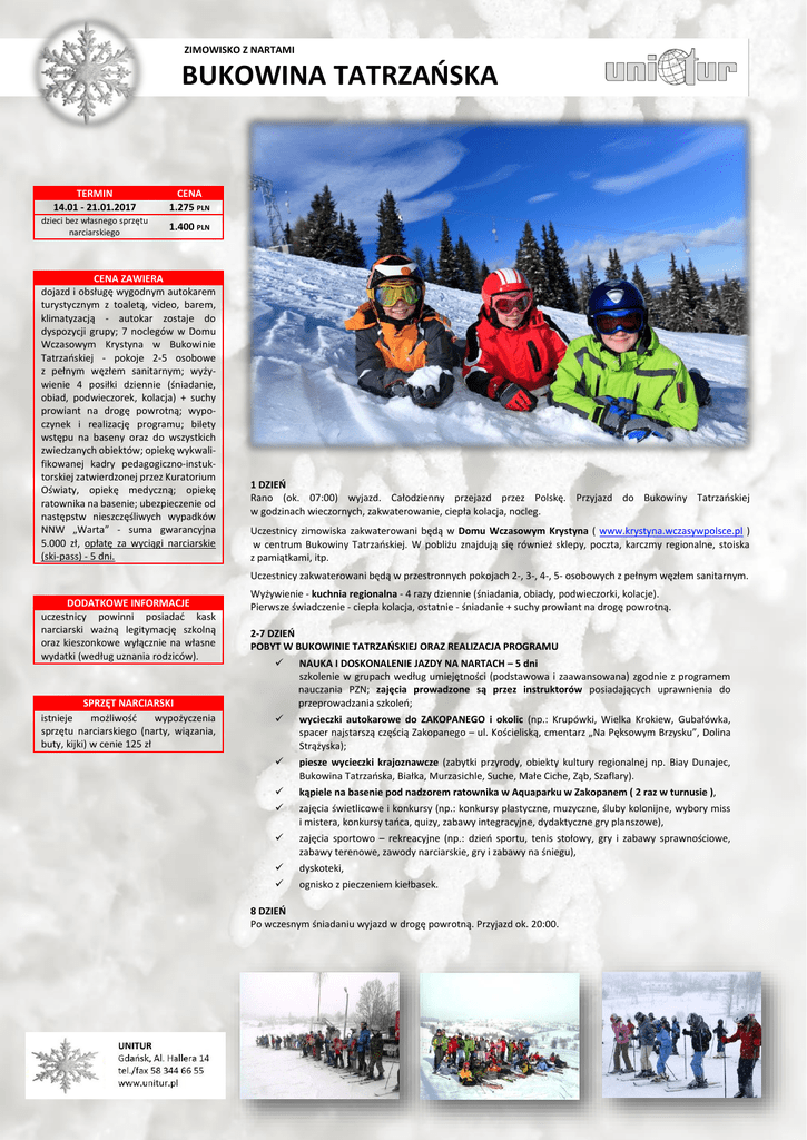 ZIMOWISKO Z NARTAMI BUKOWINA TATRZAŃSKA TERMIN 14.01 - 21.01.2017 CENA 1.275 PLN dzieci bez własnego sprzętu narciarskiego 1.400 PLN CENA ZAWIERA dojazd i obsługę wygodnym autokarem turystycznym z toaletą, video, barem, klimatyzacją - autokar zostaje do dyspozycji grupy; 7 noclegów w Domu Wczasowym Krystyna w Bukowinie Tatrzańskiej - pokoje 2-5 osobowe z pełnym węzłem sanitarnym; wyżywienie 4 posiłki dziennie (śniadanie, obiad, podwieczorek, kolacja) + suchy prowiant na drogę powrotną; wypoczynek i realizację programu; bilety wstępu na baseny oraz do wszystkich zwiedzanych obiektów; opiekę wykwalifikowanej kadry pedagogiczno-instuktorskiej zatwierdzonej przez Kuratorium Oświaty, opiekę medyczną; opiekę ratownika na basenie; ubezpieczenie od następstw nieszczęśliwych wypadków NNW „Warta” - suma gwarancyjna 5.000 zł, opłatę za wyciągi narciarskie (ski-pass) - 5 dni. 1 DZIEŃ Rano (ok. 07:00) wyjazd. Całodzienny przejazd przez Polskę. Przyjazd do Bukowiny Tatrzańskiej w godzinach wieczornych, zakwaterowanie, ciepła kolacja, nocleg. Uczestnicy zimowiska zakwaterowani będą w Domu Wczasowym Krystyna ( www.krystyna.wczasywpolsce.pl ) w centrum Bukowiny Tatrzańskiej. W pobliżu znajdują się również sklepy, poczta, karczmy regionalne, stoiska z pamiątkami, itp. Uczestnicy zakwaterowani będą w przestronnych pokojach 2-, 3-, 4-, 5- osobowych z pełnym węzłem sanitarnym. DODATKOWE INFORMACJE uczestnicy powinni posiadać kask narciarski ważną legitymację szkolną oraz kieszonkowe wyłącznie na własne wydatki (według uznania rodziców). SPRZĘT NARCIARSKI istnieje możliwość wypożyczenia sprzętu narciarskiego (narty, wiązania, buty, kijki) w cenie 125 zł Wyżywienie - kuchnia regionalna - 4 razy dziennie (śniadania, obiady, podwieczorki, kolacje). Pierwsze świadczenie - ciepła kolacja, ostatnie - śniadanie + suchy prowiant na drogę powrotną. 2-7 DZIEŃ POBYT W BUKOWINIE TATRZAŃSKIEJ ORAZ REALIZACJA PROGRAMU NAUKA I DOSKONALENIE JAZDY NA NARTACH – 5 dni szkolenie w grupach według umiejętności (podstawowa i zaawansowana) zgodnie z programem nauczania PZN; zajęcia prowadzone są przez instruktorów posiadających uprawnienia do przeprowadzania szkoleń; wycieczki autokarowe do ZAKOPANEGO i okolic (np.: Krupówki, Wielka Krokiew, Gubałówka, spacer najstarszą częścią Zakopanego – ul. Kościeliską, cmentarz „Na Pęksowym Brzysku”, Dolina Strążyska); piesze wycieczki krajoznawcze (zabytki przyrody, obiekty kultury regionalnej np. Biay Dunajec, Bukowina Tatrzańska, Białka, Murzasichle, Suche, Małe Ciche, Ząb, Szaflary). kąpiele na basenie pod nadzorem ratownika w Aquaparku w Zakopanem ( 2 raz w turnusie ), zajęcia świetlicowe i konkursy (np.: konkursy plastyczne, muzyczne, śluby kolonijne, wybory miss i mistera, konkursy tańca, quizy, zabawy integracyjne, dydaktyczne gry planszowe), zajęcia sportowo – rekreacyjne (np.: dzień sportu, tenis stołowy, gry i zabawy sprawnościowe, zabawy terenowe, zawody narciarskie, gry i zabawy na śniegu), dyskoteki, ognisko z pieczeniem kiełbasek. 8 DZIEŃ Po wczesnym śniadaniu wyjazd w drogę powrotną. Przyjazd ok. 20:00.