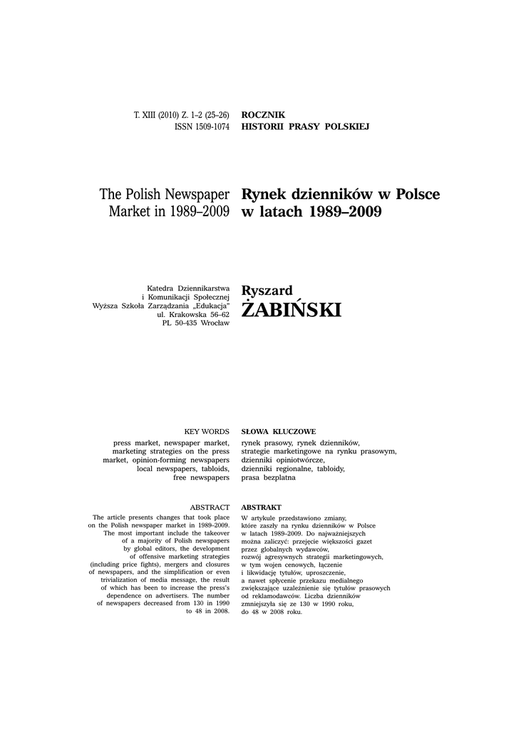 Ryszard ¯abiñski W POLSCE W LATACH 1989–2009 T. XIIIRYNEK (2010)DZIENNIKÓW Z. 1–2 (25–26) ROCZNIK ISSN 1509-1074 361 HISTORII PRASY POLSKIEJ The Polish Newspaper Rynek dzienników w Polsce Market in 1989–2009 w latach 1989–2009 Katedra Dziennikarstwa i Komunikacji Społecznej Wyższa Szkoła Zarządzania „Edukacja” ul. Krakowska 56–62 PL 50-435 Wrocław KEY WORDS press market, newspaper market, marketing strategies on the press market, opinion-forming newspapers local newspapers, tabloids, free newspapers ABSTRACT The article presents changes that took place on the Polish newspaper market in 1989–2009. The most important include the takeover of a majority of Polish newspapers by global editors, the development of offensive marketing strategies (including price fights), mergers and closures of newspapers, and the simplification or even trivialization of media message, the result of which has been to increase the press’s dependence on advertisers. The number of newspapers decreased from 130 in 1990 48 in 2008. TOM XIII (2010), ZESZYT 1–2 to (25–26) Ryszard ŻABIŃSKI SŁOWA KLUCZOWE rynek prasowy, rynek dzienników, strategie marketingowe na rynku prasowym, dzienniki opiniotwórcze, dzienniki regionalne, tabloidy, prasa bezplatna ABSTRAKT W artykule przedstawiono zmiany, które zaszły na rynku dzienników w Polsce w latach 1989–2009. Do najważniejszych można zaliczyć: przejęcie większości gazet przez globalnych wydawców, rozwój agresywnych strategii marketingowych, w tym wojen cenowych, łączenie i likwidację tytułów, uproszczenie, a nawet spłycenie przekazu medialnego zwiększające uzależnienie się tytułów prasowych od reklamodawców. Liczba dzienników zmniejszyła się ze 130 w 1990 roku, do 48 w 2008 roku. ARTYKU£Y I ROZPRAWY 362 Streszczenie Od rokuprzedstawia Artykuł 1895 nastąpił zmiany w Galicji jakie gwałtowny zaszły na rynku rozwój dzienników pism codziennych. w Polsce, Było w latach to związane 1989–2009. z zelżeniem Od końca lat 90. na polski przepisów dotyczących rynek prasowy opłat zazaczęły wydawanie silnieprasy. oddziaływać Jedną zniekorzystne gazet, któraczynniki powstałamakroekonomiczne w tym czasie był „Dziennik w postaci malejącego Poranny”, wydawany tempa przyrostu w Krakowie Produktu od 3 Krajowego XII 1895 doBrutto, 22 VIIstagnacji 1897. Z początkiem gospodarczej, lutego szybkiego 1896 roku wzrostu zmieniono bezrobocia nazwę i na pauperyzacji „Dziennik Krakowski”. społeczeństwa. Wtedy Spowodowało też redakcjętoprzejął, drastyczne znany obniżenie później dziennikarz, się poziomu redaktor czytelnictwa. „Krytyki” Wilhelm Przełom Feldman. na rynku O ile „Dziennik dziennikówPoranny” i w ogóleadresowany na rynku prasowym był do szerokich dokonałmas, się dopiero o tyle adresatami w październiku „Dziennika 2003, gdy Krakowskiego” pojawił się była dziennik wąska „Fakt”, grupaktórego radykalnej wydawcą inteligencji. był Axel Stąd Springer wywodzą Polska. się zmiany, Czytelnictwo jakie dzienników zaszły w owej poszerzyło gazecie po się lutym w obszarze 1896 roku. tabloidów Zlikwidowano i prasy bezpłatnej. część działów, Możnaktóre mówić przeznaczone o udanym dotarciu były dlaprzez masowego tych wydawców odbiorcy, do znacznie ogromnego rozwijając segmentu dział polityczny konsumentów, i literacki. dotychczas Do grona nie redakcji czytających zaliczali prasy się drukowanej m.in.: dr Henryk lub robiących Biegeleisen, to sporadycznie. dr Zofia Daszyńska, Jan Kasprowicz, Józef Kotarbiński, Andrzej Niemojewski. Główną treścią artykułów były sprawy Przedstawiono polityczne, poruszano również zmiany kwestiena wyborów rynku dzienników do parlamentu, w okresie bądź sejmu spowolnienia krajowego. gospodarczego Często wypowiadano w Polsce, w sięlatach na tematy 2008–2009. związane Dokonano z polityką także państw analizy zaborczych: przestrzennego Rosji, Niemiec, zróżnicowania no i oczywiście czytelnictwa Austrii. dzienników Redakcja w Polsstała ce na istanowisku zmian w tym demokratyzacji zakresie. nie tylko życia politycznego, ale również społecznego. Stąd z jednej strony poparcie, Do najważniejszych jakie udzielała inicjatywom trendów na reformy rynku dzienników wyborczej,wa latach z drugiej 1989-2009 zezwoleniu zaliczono: na swobodne rozwój agresywnych studiowanie strategii kobietom. marketingowych, głęboki spadek czytelnictwa dzienników regionalnych oraz radykalne zmniejszenie się liczby Dziennik dzienników. nieustannie borykał się z trudnościami finansowymi, nie potrafił zdobyć dla siebie odpowiedniej ilości W artykule prenumeratorów, podkreślono, co ostatecznie że wraz doprowadziło z transformacją do jego ustrojową upadku.zmieniła Nie powiodła się struktura się próba właścicielska odsprzedaży dzienników tytułu Polskiej i czasopism. Partii Socjaldemokratycznej. Segmenty te zostały Mimo opanowane usilnych przez starań,zagranicznych, Ignacemu Daszyńskiemu globalnych nie i nielicznych udało się wielkich znaleźć funduszy polskich wydawców. na odkupienie Stosowane pisma. przez nich strategie były spójne, dostosowane do szybko zmieniających się warunków makrootoczenia i w pełni uzasadnione z marketingowego punktu widzenia. Z drugiej jednak strony, rodziły wiele negatywnych zjawisk w sferze społecznej (monopolizacja sektorów, ujednolicanie i upraszczanie przekazu medialnego, upadek prasy regionalnej, marginalizacja zawodu dziennikarza). ROCZNIK HISTORII PRASY POLSKIEJ Ryszard ¯abiñski RYNEK DZIENNIKÓW W POLSCE W LATACH 1989–2009 363 Wprowadzenie W latach 1989–2009 na rynku dzienników w Polsce dokonały się zmiany o fundamentalnym znaczeniu. Zdecydowana większość gazet została przejęta przez globalnych wydawców. Na rynek ten oddziaływały też niekorzystne zmiany w otoczeniu makroekonomicznym i konkurencyjnym (sektorowym). Polegały one m.in. na 