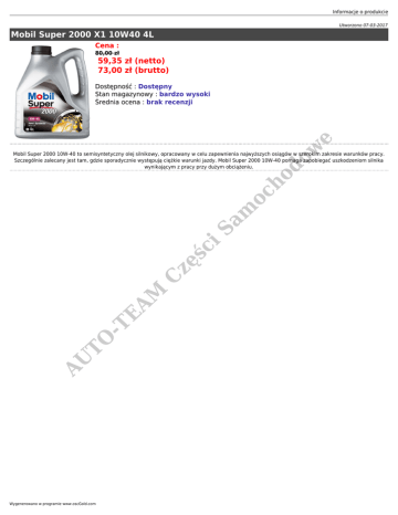 Informacje o produkcie Utworzono 07-03-2017 Mobil Super 2000 X1 10W40 4L Cena : 80,00 zł 59,35 zł (netto) 73,00 zł (brutto) do w e Dostępność : Dostępny Stan magazynowy : bardzo wysoki Średnia ocena : brak recenzji AU TO -T E AM C zę ś ci Sa m oc ho Mobil Super 2000 10W-40 to semisyntetyczny olej silnikowy, opracowany w celu zapewnienia najwyższych osiągów w szerokim zakresie warunków pracy. Szczególnie zalecany jest tam, gdzie sporadycznie występują ciężkie warunki jazdy. Mobil Super 2000 10W-40 pomaga zapobiegać uszkodzeniom silnika wynikającym z pracy przy dużym obciążeniu. Wygenerowano w programie www.oscGold.com