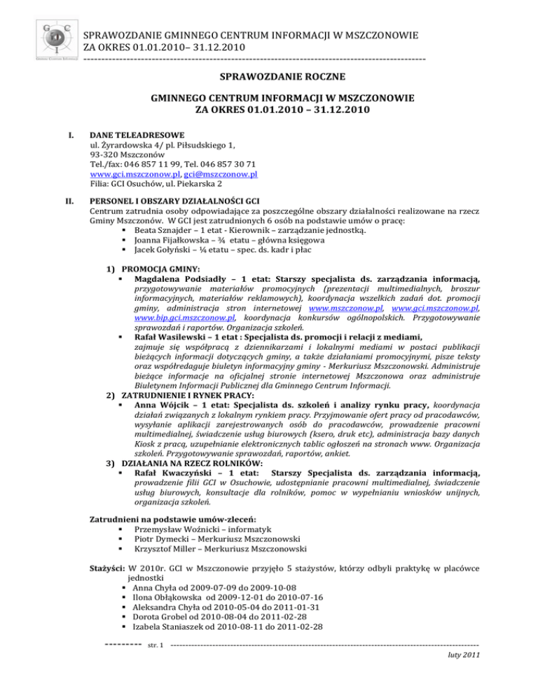 SPRAWOZDANIE GMINNEGO CENTRUM INFORMACJI W MSZCZONOWIE ZA OKRES 01.01.2010– 31.12.2010 ----------------------------------------------------------------------------------------------SPRAWOZDANIE ROCZNE GMINNEGO CENTRUM INFORMACJI W MSZCZONOWIE ZA OKRES 01.01.2010 – 31.12.2010 I. II. DANE TELEADRESOWE ul. Żyrardowska 4/ pl. Piłsudskiego 1, 93-320 Mszczonów Tel./fax: 046 857 11 99, Tel. 046 857 30 71 www.gci.mszczonow.pl, [email protected] Filia: GCI Osuchów, ul. Piekarska 2 PERSONEL I OBSZARY DZIAŁALNOŚCI GCI Centrum zatrudnia osoby odpowiadające za poszczególne obszary działalności realizowane na rzecz Gminy Mszczonów. W GCI jest zatrudnionych 6 osób na podstawie umów o pracę: Beata Sznajder – 1 etat - Kierownik – zarządzanie jednostką. Joanna Fijałkowska – ¾ etatu – główna księgowa Jacek Gołyński – ¼ etatu – spec. ds. kadr i płac 1) PROMOCJA GMINY: Magdalena Podsiadły – 1 etat: Starszy specjalista ds. zarządzania informacją, przygotowywanie materiałów promocyjnych (prezentacji multimedialnych, broszur informacyjnych, materiałów reklamowych), koordynacja wszelkich zadań dot. promocji gminy, administracja stron internetowej www.mszczonow.pl, www.gci.mszczonow.pl, www.bip.gci.mszczonow.pl, koordynacja konkursów ogólnopolskich. Przygotowywanie sprawozdań i raportów. Organizacja szkoleń. Rafał Wasilewski – 1 etat : Specjalista ds. promocji i relacji z mediami, zajmuje się współpracą z dziennikarzami i lokalnymi mediami w postaci publikacji bieżących informacji dotyczących gminy, a także działaniami promocyjnymi, pisze teksty oraz współredaguje biuletyn informacyjny gminy - Merkuriusz Mszczonowski. Administruje bieżące informacje na oficjalnej stronie internetowej Mszczonowa oraz administruje Biuletynem Informacji Publicznej dla Gminnego Centrum Informacji. 2) ZATRUDNIENIE I RYNEK PRACY: Anna Wójcik – 1 etat: Specjalista ds. szkoleń i analizy rynku pracy, koordynacja działań związanych z lokalnym rynkiem pracy. Przyjmowanie ofert pracy od pracodawców, wysyłanie aplikacji zarejestrowanych osób do pracodawców, prowadzenie pracowni multimedialnej, świadczenie usług biurowych (ksero, druk etc), administracja bazy danych Kiosk z pracą, uzupełnianie elektronicznych tablic ogłoszeń na stronach www. Organizacja szkoleń. Przygotowywanie sprawozdań, raportów, ankiet. 3) DZIAŁANIA NA RZECZ ROLNIKÓW: Rafał Kwaczyński – 1 etat: Starszy Specjalista ds. zarządzania informacją, prowadzenie filii GCI w Osuchowie, udostępnianie pracowni multimedialnej, świadczenie usług biurowych, konsultacje dla rolników, pomoc w wypełnianiu wniosków unijnych, organizacja szkoleń. Zatrudnieni na podstawie umów-zleceń: Przemysław Woźnicki – informatyk Piotr Dymecki – Merkuriusz Mszczonowski Krzysztof Miller – Merkuriusz Mszczonowski Stażyści: W 2010r. GCI w Mszczonowie przyjęło 5 stażystów, którzy odbyli praktykę w placówce jednostki Anna Chyła od 2009-07-09 do 2009-10-08 Ilona Obłąkowska od 2009-12-01 do 2010-07-16 Aleksandra Chyła od 2010-05-04 do 2011-01-31 Dorota Grobel od 2010-08-04 do 2011-02-28 Izabela Staniaszek od 2010-08-11 do 2011-02-28 --------- str. 1 ------------------------------------------------------------------------------------------------------luty 2011 SPRAWOZDANIE GMINNEGO CENTRUM INFORMACJI W MSZCZONOWIE ZA OKRES 01.01.2010– 31.12.2010 ---------------------------------------------------------------------------------------------- W GCI w Osuchowie przyjęto 2 stażystów: Natalia Siniarska od 2009-02-10 do 2010-09-30 Anna Wieczorkiewicz od 2010-10-07 do 2011-04-06 III. ZAPOBIEGANIE BEZROBOCIU, INFORMACJA ZAWODOWA, RYNEK PRACY 1. Struktura osób bezrobotnych. Sytuacja na rynku pracy ulega ciągłym zmianom, w 2010r. w bazie danych „Kiosk z pracą” zostało zarejestrowanych 103 osoby. Pod względem struktury pod względem płci, wieku i wykształcenia osób bezrobotnych jest ona tendencyjna. Wśród osób bezrobotnych większość stanowią kobiety (56%), osoby w przedziale wiekowym 18–30 lat (54%) oraz osoby z wykształceniem zawodowym (45%). Wykres nr 1: Struktura osób bezrobotnych z podziałem ze względu na płeć OSOBY BEZROBOTNE / PŁEĆ 48; 44% 55 56% KOBIETY MĘŻCZYŹNI Wykres nr 2: Struktura osób bezrobotnych z podziałem ze względu na wiek OSOBY BEZROBOTNE / WIEK 15; 15% 54; 52% WIEK 18-30 LAT 34; 33% WIEK 31-45 LAT WIEK 46 LAT I POWYŻEJ Wykres nr 3: Struktura osób bezrobotnych z podziałem ze względu na wykształcenie Sytuacja kobiet na rynku pracy ulega z roku na rok poprawie. Jednak kobiety nadal stanowią większą część osób bezrobotnych. Pomimo tego, że chęć podnoszenia swoich kwalifikacji jest nieporównywalnie większa u kobiet niż u mężczyzn, to wciąż kobiety znajdują się w gorszym położeniu na rynku pracy. Osoby w wieku 18-30 lat stanowią największą grupę osób bezrobotnych. Pomimo tego, iż jest to grupa, która ze względu na umiejętności (znajomość obsługi komputera, jęz. obcych), uprawnienia (np. prawo jazdy) najszybciej znajduje zatrudnienie to jest to jednocześnie grupa najliczniejsza, często niezbyt dyspozycyjna (macierzyństwo), poszukująca nowych wyzwań i lepszego wynagrodzenia, nie bojąca się zmian miejsca pracy. Te ostatnie cechy powodują dużą fluktuację na rynku pracy ww. grupy wiekowej. OSOBY BEZROBOTNE / WYKSZTAŁCENIE 3; 3% 3; 3% 14; 14% 1; 1% 15; 15% PODSTAWOWE ZAWODOWE ŚREDNIE ŚREDNIE TECHNICZNE POMATURALNE LICENCJAT 19; 18% Największą grupę bezrobotnych stanowią osoby z wykształceniem zawodowym. Tendencja ta zmieniła się w porównaniu do roku ubiegłego, kiedy to znaczną częścią osób bezrobotnych były osoby z wykształceniem średnim. WYŻSZE INŻYNIER 32; 31% 15; 15% --------- str. 2 ------------------------------------------------------------------------------------------------------luty 2011 SPRAWOZDANIE GMINNEGO CENTRUM INFORMACJI W MSZCZONOWIE ZA OKRES 01.01.2010– 31.12.