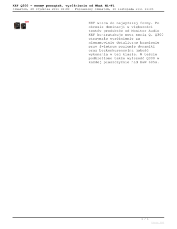 KEF Q300 - mocny początek, wyróżnienie od What Hi-Fi czwartek, 20 stycznia 2011 02:00 - Poprawiony czwartek, 10 listopada 2011 11:05 KEF wraca do najwyższej formy. Po okresie dominacji w większości testów produktów od Monitor Audio KEF kontratakuje nową serią Q. Q300 otrzymało wyróżnienie za niesamowicie detaliczne brzmienie przy świetnym poziomie dynamiki oraz bezkonkurencyjną jakość wykonania w tej klasie. W teście podkreślono także wyższość Q300 w każdej płaszczyźnie nad B&W 685s. 1 / 1 Phoca PDF