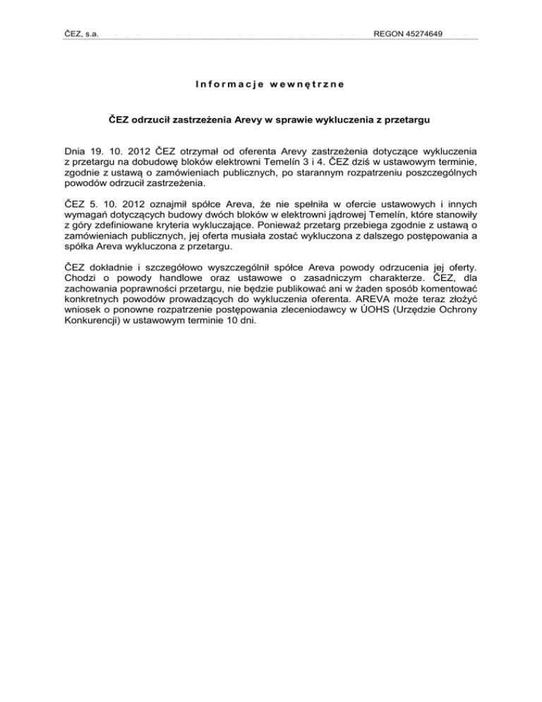 ČEZ, s.a. REGON 45274649 Informacje wewnętrzne ČEZ odrzucił zastrzeżenia Arevy w sprawie wykluczenia z przetargu Dnia 19. 10. 2012 ČEZ otrzymał od oferenta Arevy zastrzeżenia dotyczące wykluczenia z przetargu na dobudowę bloków elektrowni Temelín 3 i 4. ČEZ dziś w ustawowym terminie, zgodnie z ustawą o zamówieniach publicznych, po starannym rozpatrzeniu poszczególnych powodów odrzucił zastrzeżenia. ČEZ 5. 10. 2012 oznajmił spółce Areva, że nie spełniła w ofercie ustawowych i innych wymagań dotyczących budowy dwóch bloków w elektrowni jądrowej Temelín, które stanowiły z góry zdefiniowane kryteria wykluczające. Ponieważ przetarg przebiega zgodnie z ustawą o zamówieniach publicznych, jej oferta musiała zostać wykluczona z dalszego postępowania a spółka Areva wykluczona z przetargu. ČEZ dokładnie i szczegółowo wyszczególnił spółce Areva powody odrzucenia jej oferty. Chodzi o powody handlowe oraz ustawowe o zasadniczym charakterze. ČEZ, dla zachowania poprawności przetargu, nie będzie publikować ani w żaden sposób komentować konkretnych powodów prowadzących do wykluczenia oferenta. AREVA może teraz złożyć wniosek o ponowne rozpatrzenie postępowania zleceniodawcy w ÚOHS (Urzędzie Ochrony Konkurencji) w ustawowym terminie 10 dni.