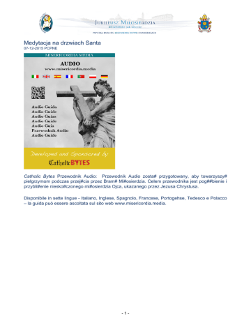 Medytacja na drzwiach Santa 07-12-2015 PCPNE Catholic Bytes Przewodnik Audio: Przewodnik Audio zosta# przygotowany, aby towarzyszy# pielgrzymom podczas przej#cia przez Bram# Mi#osierdzia. Celem przewodnika jest pog##bienie i przybli#enie niesko#czonego mi#osierdzia Ojca, ukazanego przez Jezusa Chrystusa. Disponibile in sette lingue - Italiano, Inglese, Spagnolo, Francese, Portogehse, Tedesco e Polacco – la guida può essere ascoltata sul sito web www.misericordia.media. -1-