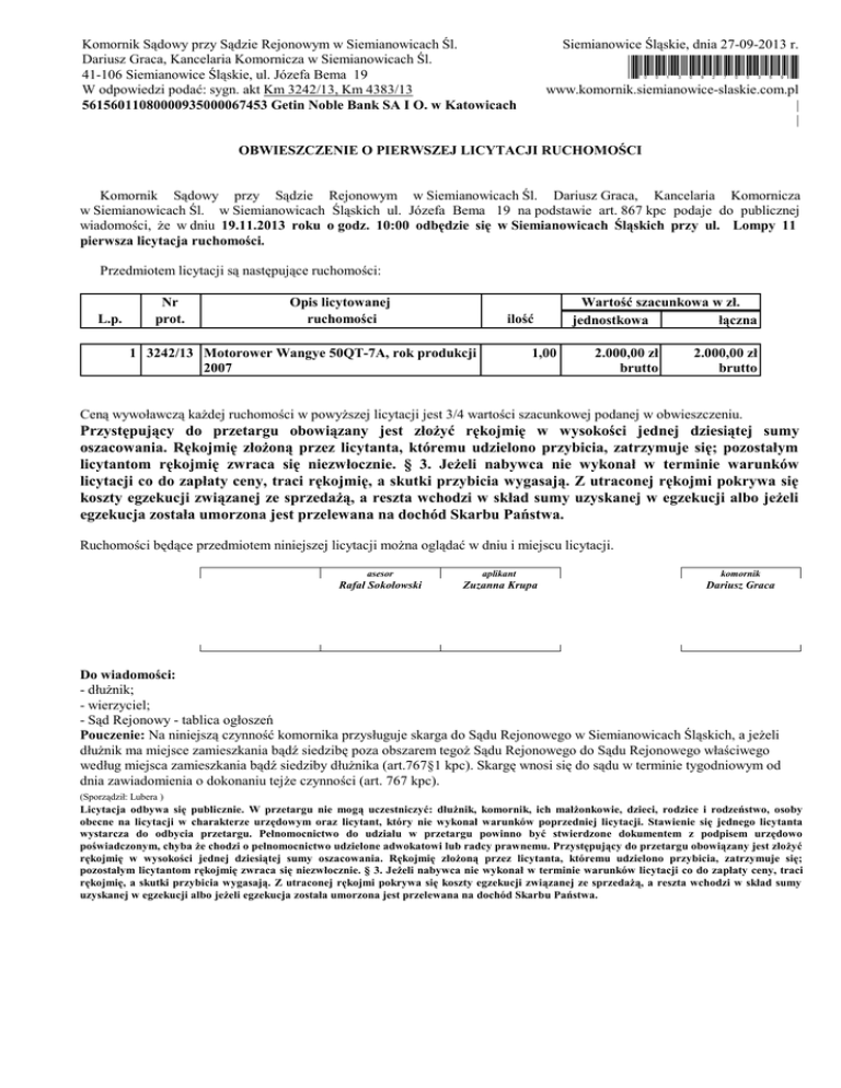 Komornik Sądowy przy Sądzie Rejonowym w Siemianowicach Śl. Dariusz Graca, Kancelaria Komornicza w Siemianowicach Śl. 41-106 Siemianowice Śląskie, ul. Józefa Bema 19 W odpowiedzi podać: sygn. akt Km 3242/13, Km 4383/13 56156011080000935000067453 Getin Noble Bank SA I O. w Katowicach Siemianowice Śląskie, dnia 27-09-2013 r. *0013092700359* www.komornik.siemianowice-slaskie.com.pl | | OBWIESZCZENIE O PIERWSZEJ LICYTACJI RUCHOMOŚCI Komornik Sądowy przy Sądzie Rejonowym w Siemianowicach Śl. Dariusz Graca, Kancelaria Komornicza w Siemianowicach Śl. w Siemianowicach Śląskich ul. Józefa Bema 19 na podstawie art. 867 kpc podaje do publicznej wiadomości, że w dniu 19.11.2013 roku o godz. 10:00 odbędzie się w Siemianowicach Śląskich przy ul. Lompy 11 pierwsza licytacja ruchomości. Przedmiotem licytacji są następujące ruchomości: L.p. Nr prot. Opis licytowanej ruchomości ilość 1 3242/13 Motorower Wangye 50QT-7A, rok produkcji 2007 1,00 Wartość szacunkowa w zł. jednostkowa łączna 2.000,00 zł brutto 2.000,00 zł brutto Ceną wywoławczą każdej ruchomości w powyższej licytacji jest 3/4 wartości szacunkowej podanej w obwieszczeniu. Przystępujący do przetargu obowiązany jest złożyć rękojmię w wysokości jednej dziesiątej sumy oszacowania. Rękojmię złożoną przez licytanta, któremu udzielono przybicia, zatrzymuje się; pozostałym licytantom rękojmię zwraca się niezwłocznie. § 3. Jeżeli nabywca nie wykonał w terminie warunków licytacji co do zapłaty ceny, traci rękojmię, a skutki przybicia wygasają. Z utraconej rękojmi pokrywa się koszty egzekucji związanej ze sprzedażą, a reszta wchodzi w skład sumy uzyskanej w egzekucji albo jeżeli egzekucja została umorzona jest przelewana na dochód Skarbu Państwa. Ruchomości będące przedmiotem niniejszej licytacji można oglądać w dniu i miejscu licytacji. asesor aplikant komornik Rafał Sokołowski Zuzanna Krupa Dariusz Graca Do wiadomości: - dłużnik; - wierzyciel; - Sąd Rejonowy - tablica ogłoszeń Pouczenie: Na niniejszą czynność komornika przysługuje skarga do Sądu Rejonowego w Siemianowicach Śląskich, a jeżeli dłużnik ma miejsce zamieszkania bądź siedzibę poza obszarem tegoż Sądu Rejonowego do Sądu Rejonowego właściwego według miejsca zamieszkania bądź siedziby dłużnika (art.767§1 kpc). Skargę wnosi się do sądu w terminie tygodniowym od dnia zawiadomienia o dokonaniu tejże czynności (art. 767 kpc). (Sporządził: Lubera ) Licytacja odbywa się publicznie. W przetargu nie mogą uczestniczyć: dłużnik, komornik, ich małżonkowie, dzieci, rodzice i rodzeństwo, osoby obecne na licytacji w charakterze urzędowym oraz licytant, który nie wykonał warunków poprzedniej licytacji. Stawienie się jednego licytanta wystarcza do odbycia przetargu. Pełnomocnictwo do udziału w przetargu powinno być stwierdzone dokumentem z podpisem urzędowo poświadczonym, chyba że chodzi o pełnomocnictwo udzielone adwokatowi lub radcy prawnemu. Przystępujący do przetargu obowiązany jest złożyć rękojmię w wysokości jednej dziesiątej sumy oszacowania. Rękojmię złożoną przez licytanta, któremu udzielono przybicia, zatrzymuje się; pozostałym licytantom rękojmię zwraca się niezwłocznie. § 3. Jeżeli nabywca nie wykonał w terminie warunków licytacji co do zapłaty ceny, traci rękojmię, a skutki przybicia wygasają. Z utraconej rękojmi pokrywa się koszty egzekucji związanej ze sprzedażą, a reszta wchodzi w skład sumy uzyskanej w egzekucji albo jeżeli egzekucja została umorzona jest przelewana na dochód Skarbu Państwa.