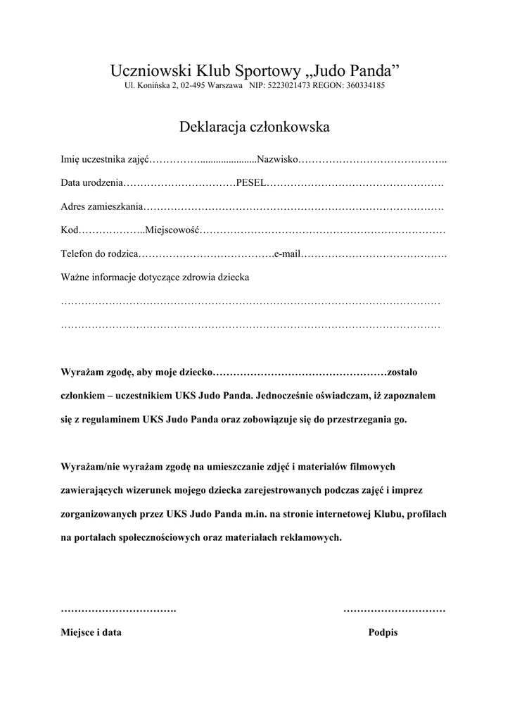 Uczniowski Klub Sportowy „Judo Panda” Ul. Konińska 2, 02-495 Warszawa NIP: 5223021473 REGON: 360334185 Deklaracja członkowska Imię uczestnika zajęć……………......................Nazwisko…………………………………….. Data urodzenia……………………………PESEL……………………………………………. Adres zamieszkania……………………………………………………………………………. Kod………………..Miejscowość……………………………………………………………… Telefon do rodzica………………………………….e-mail……………………………………. Ważne informacje dotyczące zdrowia dziecka ………………………………………………………………………………………………… ………………………………………………………………………………………………… Wyrażam zgodę, aby moje dziecko……………………………………………zostało członkiem – uczestnikiem UKS Judo Panda. Jednocześnie oświadczam, iż zapoznałem się z regulaminem UKS Judo Panda oraz zobowiązuje się do przestrzegania go. Wyrażam/nie wyrażam zgodę na umieszczanie zdjęć i materiałów filmowych zawierających wizerunek mojego dziecka zarejestrowanych podczas zajęć i imprez zorganizowanych przez UKS Judo Panda m.in. na stronie internetowej Klubu, profilach na portalach społecznościowych oraz materiałach reklamowych. ……………………………. Miejsce i data ………………………… Podpis