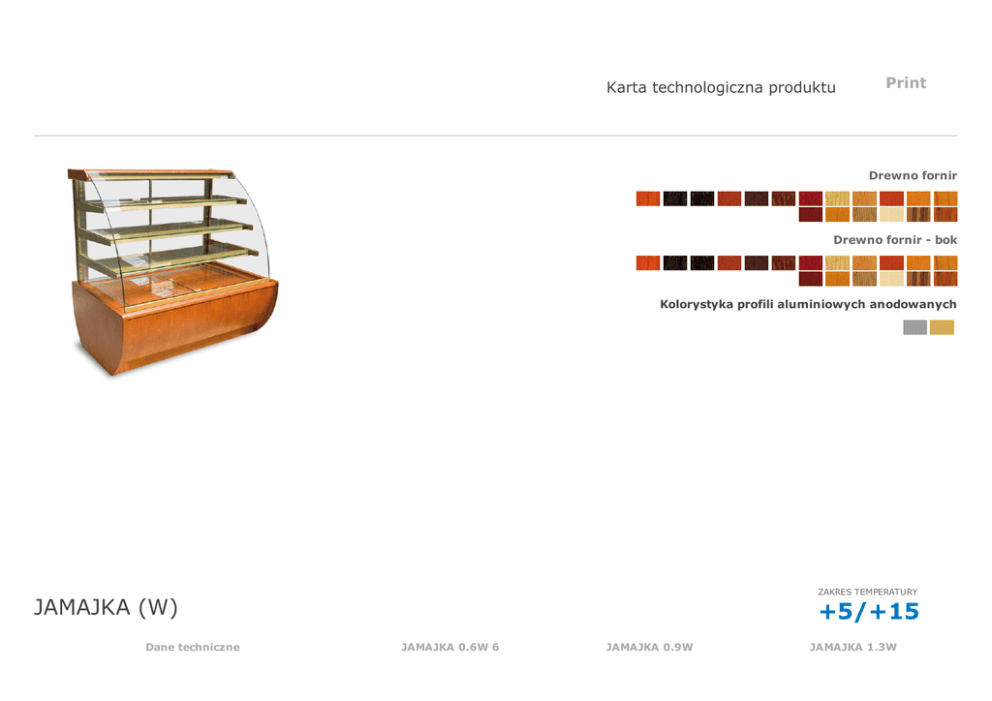 Print Karta technologiczna produktu Drewno fornir Drewno fornir bok Kolorystyka profili aluminiowych anodowanych ZAKRES TEMPERATURY JAMAJKA (W) Dane techniczne +5/+15 JAMAJKA 0.6W 6 JAMAJKA 0.9W JAMAJKA 1.3W KOD JA103 JA102 JA101 Długość [mm] 700 1000 1400 Długość z bokami [mm] 700 1000 1400 Pojemność użytkowa [dm 3 ] 203 305 440 Pojemność użytkowa komory [dm 3 ] 203 305 440 Powierzchnia półek [m 2 ] 0,96 1,5 2,1 Powierzchnia chłodzona półek [m 2 ] 0,96 1,5 2,1 Grubość boku [mm] 38 38 38 Głębokość [mm] 865 865 865 Głębokość (drewno/h17/pod zabudowę) [mm] 865/810/850 865/810/850 865/810/850 Wysokość [mm] 1370+/10 1370+/10 1370+/10 Waga urządzenia [kg] 100 150 200 Wymiary półek [mm] 570x380 3szt, 290x525 2szt 870x380 3szt, 440x525 2szt 1280x380 3szt, 640x525 2szt Czynnik chłodniczy R134a R134a R134a Temperatura odparowania To [°C] 10 10 10 Zapotrzebowanie mocy chłodniczej [W/mb] 800 800 800 Napięcie znamionowe [V] 230/50Hz 230/50Hz 230/50Hz Moc znamionowa oświetlenia [W] 28,8 34 68 Całkowita moc znamionowa [W] 316 551 732 Moc chłodnicza [W] 461 727 1025 Moc znamionowa grzałek parownika [W] 160 160 200 Zużycie energii elektrycznej [kWh/24h] 4,7 8 10,6 Obciążenie półki [kg/m] 10 10 10 Standard agregat chłodniczy wewnętrzny chłodzenie dynamiczne obudowa drewnianamożliwość wyboru koloru (wzornik IGLOO) boki drewnianemożliwość wyboru koloru (wzornik IGLOO) izolacja z ekologicznej pianki poliuretanowej stelaż wewnętrzny malowany na kolor srebrny lub złoty (wzornik IGLOO) półki ekspozycyjne szklane z regulacją wysokości oraz kąta zawieszenia półka dolna drewnianamożliwość wyboru koloru (wzornik IGLOO) tylne drzwi przesuwne z szybą zespoloną 2 szyba frontowa gięta uchylna nawiew ciepłego powietrza na szybę frontową oświetlenie każdej półkiświetlówka LED (cukiernicza) nóżki służące do wypoziomowania urządzenia odszranianie automatyczne automatyczne odparowanie kondensatu elektroniczny regulator temperatury z cyfrowym wyświetlaczem alarm dźwiękowy informujący o zanieczyszczeniu skraplacza lub zablokowaniu pracy wentylatora 2 JAMAJKA 0.6drzwi rozwierne z możliwością wyboru kierunku otwierania ID Opcje 408 boki drewnianemożliwość wyboru koloru (wzornik IGLOO) 3 3004 urządzenie przystosowane pod zabudowę indywidualną (bez obudowy drewnianej) 613 obudowa zewnętrzna z blachy nierdzewnej (patrz fot. 1) 1702 stelaż wewnętrzny z blachy nierdzewnej do modułu 0.6 1703 stelaż wewnętrzny z blachy nierdzewnej do modułu 0.9 1704 stelaż wewnętrzny z blachy nierdzewnej do modułu 1.3 510 elektroniczny rejestrator temperatury + oprogramowanie 1 1138 półka dolna z blachy nierdzewnej 515 przewód rejestratora temperatury (RS232USB) 505 system kontroli wilgotności 822 światłowodowe zmiennobarwne podświetlenie panelu frontowego 4 1135 taca dolna (szer. 400mm x gł. 520mm) 1132 taca mała (szer.400mm x gł. 375mm) 1 tylko przy zastosowaniu termostatu IGLOO 3 dotyczy JAMAJKA MOD/A i MOD/C 4 możliwe wyłącznie w wersji TREND Korespondencja: ul. Kazimierza Wielkiego 13, 32700 Bochnia, Poland tel.: +48 14/ 662 19 10 Produkcja: Stary Wiśnicz 289, 32720 Nowy Wiśnicz, Poland fax: +48 14/ 662 19 12