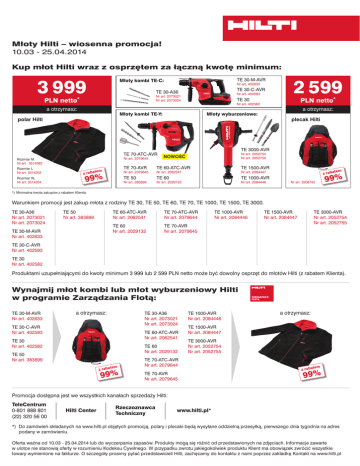 M∏oty Hilti – wiosenna promocja! 10.03 - 25.04.2014 Kup młot Hilti wraz z osprz´tem za łàcznà kwot´ minimum: 3 999 PLN TE 30-C-AVR Nr art. 402593 Nr art. 2073021 Nr art. 2073024 netto* TE 70-ATC-AVR Rozmiar M Nr art. 3514082 tem z raba Nr art. 402582 99% a otrzymasz: M∏oty wyburzeniowe: plecak Hilti TE 3000-AVR Nr art. 2052754 Nr art. 2052755 Nr art. 2079644 NOWOÂå TE 70-AVR TE 60-ATC-AVR TE 1500-AVR TE 50 TE 60 TE 1000-AVR Nr art. 2079645 Nr art. 383899 2 599 PLN netto* TE 30 M∏oty kombi TE-Y: polar Hilti Rozmiar XL Nr art. 3514204 Nr art. 402633 TE 30-A36 a otrzymasz: Rozmiar L Nr art. 3514203 TE 30-M-AVR M∏oty kombi TE-C: Nr art. 2062541 tem z raba Nr art. 2084447 Nr art. 2029132 Nr art. 2084446 Nr art. 3508742 99% *) Minimalna kwota zakupów z rabatem Klienta. Warunkiem promocji jest zakup młota z rodziny TE 30, TE 50, TE 60, TE 70, TE 1000, TE 1500, TE 3000. TE 30-A36 Nr art. 2073021 Nr art. 2073024 TE 50 Nr art. 383899 TE 30-M-AVR Nr art. 402633 TE 60-ATC-AVR Nr art. 2062541 TE 70-ATC-AVR Nr art. 2079644 TE 60 Nr art. 2029132 TE 70-AVR Nr art. 2079645 TE 1000-AVR Nr art. 2084446 TE 1500-AVR Nr art. 2084447 TE 3000-AVR Nr art. 2052754 Nr art. 2052755 TE 30-C-AVR Nr art. 402593 TE 30 Nr art. 402582 Produktami uzupełniajàcymi do kwoty minimum 3 999 lub 2 599 PLN netto mo˝e byç dowolny osprz´t do młotów Hilti (z rabatem Klienta). Wynajmij młot kombi lub m∏ot wyburzeniowy Hilti w programie Zarzàdzania Flotà: TE 30-M-AVR Nr art. 402633 a otrzymasz: TE 30-A36 Nr art. 2073021 Nr art. 2073024 TE 30-C-AVR Nr art. 402593 TE 60-ATC-AVR Nr art. 2062541 TE 30 Nr art. 402582 TE 60 Nr art. 2029132 TE 50 Nr art. 383899 tem z raba 99% TE 1000-AVR Nr art. 2084446 a otrzymasz: TE 1500-AVR Nr art. 2084447 TE 3000-AVR Nr art. 2052754 Nr art. 2052755 TE 70-ATC-AVR Nr art. 2079644 TE 70-AVR Nr art. 2079645 tem z raba 99% Promocja dost´pna jest we wszystkich kanałach sprzeda˝y Hilti: TeleCentrum 0-801 888 801 (22) 320 56 00 Hilti Center Rzeczoznawca Techniczny www.hilti.pl* *) Do zamówieƒ składanych na www.hilti.pl obj´tych promocjà, polary i plecaki b´dà wysyłane oddzielnà przesyłkà, pierwszego dnia tygodnia na adres podany w zamówieniu. Oferta wa˝na od 10.03 - 25.04.2014 lub do wyczerpania zapasów. Produkty mogà si´ ró˝niç od przedstawionych na zdj´ciach. Informacje zawarte w ulotce nie stanowià oferty w rozumieniu Kodeksu Cywilnego. W przypadku zwrotu jakiegokolwiek produktu Klient ma obowiàzek zwróciç wszystkie towary wymienione na fakturze. O szczegóły prosimy pytaç przedstawicieli Hilti, zach´camy do kontaktu z nami poprzez zakładk´ Kontakt na www.hilti.pl