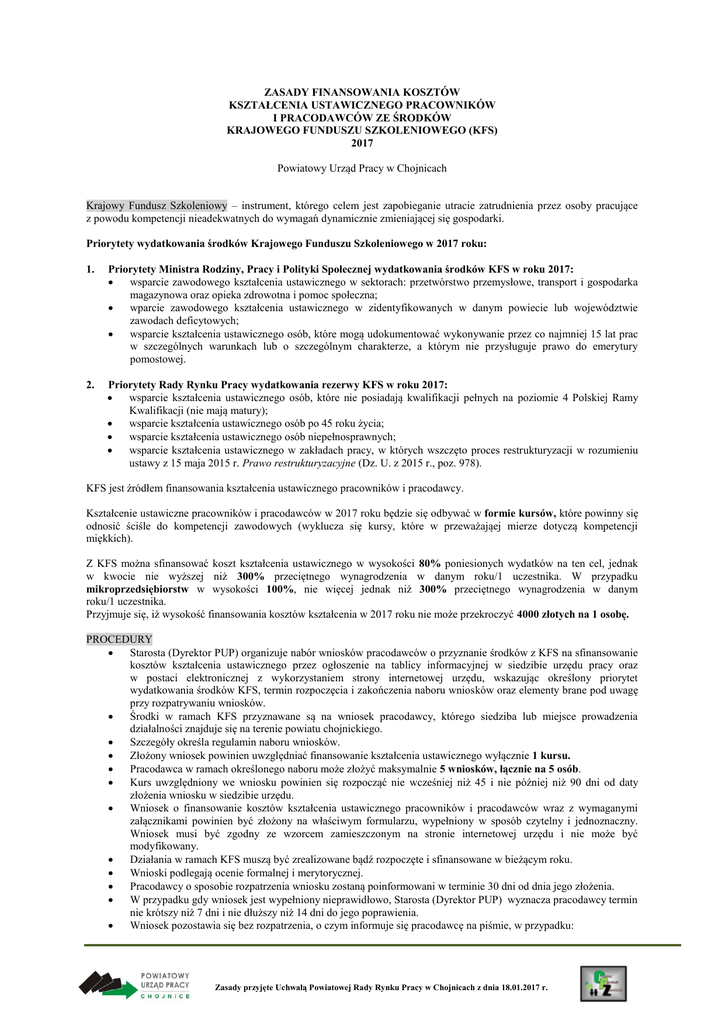 ZASADY FINANSOWANIA KOSZTÓW KSZTAŁCENIA USTAWICZNEGO PRACOWNIKÓW I PRACODAWCÓW ZE ŚRODKÓW KRAJOWEGO FUNDUSZU SZKOLENIOWEGO (KFS) 2017 Powiatowy Urząd Pracy w Chojnicach Krajowy Fundusz Szkoleniowy – instrument, którego celem jest zapobieganie utracie zatrudnienia przez osoby pracujące z powodu kompetencji nieadekwatnych do wymagań dynamicznie zmieniającej się gospodarki. Priorytety wydatkowania środków Krajowego Funduszu Szkoleniowego w 2017 roku: 1. Priorytety Ministra Rodziny, Pracy i Polityki Społecznej wydatkowania środków KFS w roku 2017: wsparcie zawodowego kształcenia ustawicznego w sektorach: przetwórstwo przemysłowe, transport i gospodarka magazynowa oraz opieka zdrowotna i pomoc społeczna; wparcie zawodowego kształcenia ustawicznego w zidentyfikowanych w danym powiecie lub województwie zawodach deficytowych; wsparcie kształcenia ustawicznego osób, które mogą udokumentować wykonywanie przez co najmniej 15 lat prac w szczególnych warunkach lub o szczególnym charakterze, a którym nie przysługuje prawo do emerytury pomostowej. 2. Priorytety Rady Rynku Pracy wydatkowania rezerwy KFS w roku 2017: wsparcie kształcenia ustawicznego osób, które nie posiadają kwalifikacji pełnych na poziomie 4 Polskiej Ramy Kwalifikacji (nie mają matury); wsparcie kształcenia ustawicznego osób po 45 roku życia; wsparcie kształcenia ustawicznego osób niepełnosprawnych; wsparcie kształcenia ustawicznego w zakładach pracy, w których wszczęto proces restrukturyzacji w rozumieniu ustawy z 15 maja 2015 r. Prawo restrukturyzacyjne (Dz. U. z 2015 r., poz. 978). KFS jest źródłem finansowania kształcenia ustawicznego pracowników i pracodawcy. Kształcenie ustawiczne pracowników i pracodawców w 2017 roku będzie się odbywać w formie kursów, które powinny się odnosić ściśle do kompetencji zawodowych (wyklucza się kursy, które w przeważająej mierze dotyczą kompetencji miękkich). Z KFS można sfinansować koszt kształcenia ustawicznego w wysokości 80% poniesionych wydatków na ten cel, jednak w kwocie nie wyższej niż 300% przeciętnego wynagrodzenia w danym roku/1 uczestnika. W przypadku mikroprzedsiębiorstw w wysokości 100%, nie więcej jednak niż 300% przeciętnego wynagrodzenia w danym roku/1 uczestnika. Przyjmuje się, iż wysokość finansowania kosztów kształcenia w 2017 roku nie może przekroczyć 4000 złotych na 1 osobę. PROCEDURY Starosta (Dyrektor PUP) organizuje nabór wniosków pracodawców o przyznanie środków z KFS na sfinansowanie kosztów kształcenia ustawicznego przez ogłoszenie na tablicy informacyjnej w siedzibie urzędu pracy oraz w postaci elektronicznej z wykorzystaniem strony internetowej urzędu, wskazując określony priorytet wydatkowania środków KFS, termin rozpoczęcia i zakończenia naboru wniosków oraz elementy brane pod uwagę przy rozpatrywaniu wniosków. Środki w ramach KFS przyznawane są na wniosek pracodawcy, którego siedziba lub miejsce prowadzenia działalności znajduje się na terenie powiatu chojnickiego. Szczegóły określa regulamin naboru wniosków. Złożony wniosek powinien uwzględniać finansowanie kształcenia ustawicznego wyłącznie 1 kursu. Pracodawca w ramach określonego naboru może złożyć maksymalnie 5 wniosków, łącznie na 5 osób. Kurs uwzględniony we wniosku powinien się rozpocząć nie wcześniej niż 45 i nie później niż 90 dni od daty złożenia wniosku w siedzibie urzędu. Wniosek o finansowanie kosztów kształcenia ustawicznego pracowników i pracodawców wraz z wymaganymi załącznikami powinien być złożony na właściwym formularzu, wypełniony w sposób czytelny i jednoznaczny. Wniosek musi być zgodny ze wzorcem zamieszczonym na stronie internetowej urzędu i nie może być modyfikowany. Działania w ramach KFS muszą być zrealizowane bądź rozpoczęte i sfinansowane w bieżącym roku. Wnioski podlegają ocenie formalnej i merytorycznej. Pracodawcy o sposobie rozpatrzenia wniosku zostaną poinformowani w terminie 30 dni od dnia jego złożenia. W przypadku gdy wniosek jest wypełniony nieprawidłowo, Starosta (Dyrektor PUP) wyznacza pracodawcy termin nie krótszy niż 7 dni i nie dłuższy niż 14 dni do jego poprawienia. Wniosek pozostawia się bez rozpatrzenia, o czym informuje się pracodawcę na piśmie, w przypadku: Zasady przyjęte Uchwałą Powiatowej Rady Rynku Pracy w Chojnicach z dnia 18.01.2017 r. - niepoprawienia wniosku we wskazanym terminie lub - niedołączenia wymaganych załączników. Wnioski, które pozytywnie przejdą ocenę formalną podlegają ocenie merytorycznej według karty ocen (załącznik nr 1). Oceny merytorycznej dokonuje Komisja ds. oceny wniosków (załącznik nr 2). Przy rozpatrywaniu wniosku Starosta (Dyrekor PUP) uwzględnia: - zgodność dofinansowanych działań z ustalonymi priorytetami wydatkownaia środków KFS na dany rok, - zgodność kompetencji nabywanych przez uczestników kształcenia ustawicznego z potrzebami lokalnego lub regionalnego rynku pracy, - koszty usługi kształcenia ustawicznego wskazanej do sfinansowania ze środków KFS w porównaniu z kosztami podobnych usług dostępnych na rynku, - posiadanie przez realizatora usługi certyfikatów jakości oferowanych usług kształcenia ustawicznego, a w przypadku kursów – posiadanie dokumentu, na podstawie którego prowadzi on pozaszkolne formy kształcenia ustawicznego, - plany dotyczące dalszego zatrudnienia osób, które będą objete kształceniem ustawicznym finansowanym ze środków KFS, - możliwość sfinansowania ze środków KFS działań określonych we wniosku, z uwzględnieniem posiadanych limitów. Dopuszcza się negocjacje pomiędzy Starostą (Dyrektorem PUP) a pracodawcą w zakresie: ceny usługi kształcenia ustawicznego, liczby osób objętych kształceniem ustawicznym, realizatora usługi, programu kształcenia ustawicznego lub zakresu egzaminu, z uwzględnieniem zasady zapewnienia najwyższej jakości usługi oraz zachowa