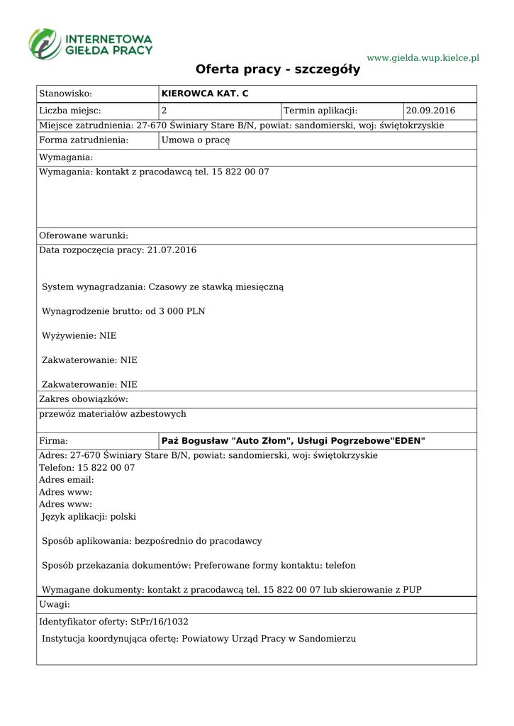 Oferta pracy - szczegóły Stanowisko: KIEROWCA KAT. C Liczba miejsc: 2 www.gielda.wup.kielce.pl Termin aplikacji: 20.09.2016 Miejsce zatrudnienia: 27-670 Świniary Stare B/N, powiat: sandomierski, woj: świętokrzyskie Forma zatrudnienia: Umowa o pracę Wymagania: Wymagania: kontakt z pracodawcą tel. 15 822 00 07 Oferowane warunki: Data rozpoczęcia pracy: 21.07.2016 System wynagradzania: Czasowy ze stawką miesięczną Wynagrodzenie brutto: od 3 000 PLN Wyżywienie: NIE Zakwaterowanie: NIE Zakwaterowanie: NIE Zakres obowiązków: przewóz materiałów azbestowych Firma: Paź Bogusław "Auto Złom", Usługi Pogrzebowe"EDEN" Adres: 27-670 Świniary Stare B/N, powiat: sandomierski, woj: świętokrzyskie Telefon: 15 822 00 07 Adres email: Adres www: Adres www: Język aplikacji: polski Sposób aplikowania: bezpośrednio do pracodawcy Sposób przekazania dokumentów: Preferowane formy kontaktu: telefon Wymagane dokumenty: kontakt z pracodawcą tel. 15 822 00 07 lub skierowanie z PUP Uwagi: Identyfikator oferty: StPr/16/1032 Instytucja koordynująca ofertę: Powiatowy Urząd Pracy w Sandomierzu Urząd Pracy dokłada wszelkich starań, aby oferty pracy będące w zasobach urzędu, były rzetelne i wiarygodne. Ponieważ wszystkie oferty pracy pochodzą od osób trzecich Urząd Pracy zastrzega, że odpowiedzialność za ewentualne rozbieżności pomiędzy warunkami pracy zaprezentowanymi w niniejszej ofercie a warunkami zaproponowanymi przez potencjalnego pracodawcę ponosi pracodawca.