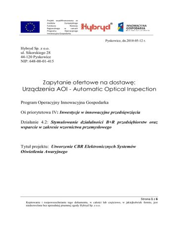 Projekt współfinansowany ze środków Europejskiego Funduszu Rozwoju Regionalnego w ramach Programu Operacyjnego Innowacyjna Gospodarka Pyskowice, dn.2010-05-12 r. Hybryd Sp. z o.o. ul. Sikorskiego 28 44-120 Pyskowice NIP: 648-00-01-415 Zapytanie ofertowe na dostawę: Urządzenia AOI - Automatic Optical Inspection Program Operacyjny Innowacyjna Gospodarka Oś priorytetowa IV: Inwestycje w innowacyjne przedsięwzięcia Działanie 4.2: Stymulowanie działalności B+R przedsiębiorstw oraz wsparcie w zakresie wzornictwa przemysłowego Tytuł projektu: Utworzenie CBR Elektronicznych Systemów Oświetlenia Awaryjnego Strona 1 z 6 Kopiowanie i rozpowszechnianie tego dokumentu, w całości lub częściowo, w jakiejkolwiek formie, jest niedozwolone bez uprzedniej pisemnej zgody Hybryd Sp. z o.o. Projekt współfinansowany ze środków Europejskiego Funduszu Rozwoju Regionalnego w ramach Programu Operacyjnego Innowacyjna Gospodarka 1. Charakterystyka zamawiającego Firma HYBRYD została założona w 1986 roku pod nazwą: Przedsiębiorstwo Projektowania i Produkcji Urządzeń Elektronicznych Hybryd sp. z o.o. z siedzibą w Zabrzu. Produkowano wówczas układy hybrydowe grubowarstwowe dla potrzeb urządzeń medycznych, później ofertę rozszerzono o zastosowania w urządzeniach sygnalizacyjnych dla kolejnictwa, a następnie dla motoryzacji. W roku 1996 siedziba firmy została przeniesiona do Pyskowic koło Gliwic. Rozbudowie uległ park maszynowy. Technologię produkcji rozszerzono o montaż układów na płytkach PCB. Od 1997 roku poszerzono asortyment produkowanych wyrobów o układy elektroniczne do zasilania świetlówek elektroluminescencyjnych tzn. stateczniki elektroniczne i moduły awaryjne. W trakcie ciągłego doskonalenia wyrobów wprowadzono do produkcji układy zasilania oświetlenia awaryjnego wyposażone w interfejs cyfrowy Większość produkcji oparta jest o własne konstrukcje, opracowane w dziale konstrukcyjnym. Wysoką jakość produktów i usług potwierdza Certyfikat zintegrowanego systemu zarządzania jakością zgodny z normą ISO 9001:2008. 2. Przedmiot dostawy Przedmiotem dostawy jest Urządzenie AOI - Automatic Optical Inspection. Wymagania techniczne: - Urządzenie stanowiskowe stand – alone, pracujące off - line - Możliwość testowania elementów o o rozmiarze 0402 oraz odstępów między wyprowadzeniami 0,4 mm o w obudowach TQFP (pitch 0,5 mm) o w obudowach QFN o w obudowach SMB (DO214AA) - Możliwość programowania testów dla samych PCB (nie zmontowanych) - Możliwość programowania testów dla PCB zmontowanych - Możliwość testowania elementów SMD oraz THT - Wyposażenie urządzenia w wysokiej jakości tor wizyjny gwarantujący wysoką niezawodność testowania - Możliwość zainstalowania oprogramowania stanowiska naprawczego będącego w dostawie wraz z urządzeniem AOI na oddzielnym komputerze PC - Możliwość współpracy urządzenia z dodatkowymi stanowiskami naprawczymi wraz z możliwością automatycznej wymiany danych pomiędzy stanowiskami naprawczymi i urządzeniem AOI poprzez sieć internetową - Możliwość współpracy osobnego stanowiska naprawczego z zewnętrznym czytnikiem kodów kreskowych 1D lub 2D w celu identyfikacji naprawianego układu. Strona 2 z 6 Kopiowanie i rozpowszechnianie tego dokumentu, w całości lub częściowo, w jakiejkolwiek formie, jest niedozwolone bez uprzedniej pisemnej zgody Hybryd Sp. z o.o. Projekt współfinansowany ze środków Europejskiego Funduszu Rozwoju Regionalnego w ramach Programu Operacyjnego Innowacyjna Gospodarka - Możliwość programowania testów na komputerze PC innym niż urządzenie AOI podczas równoległego wykonywania testów na urządzeniu AOI Możliwość odczytywania przez kamerę główną urządzenia kodów kreskowych 1D lub 2D identyfikujących testowany układ Możliwość dołączenia zewnętrznego czytnika kodów kreskowych 1D lub 2D poprzez złącze USB do urządzenia AOI Wysokość robocza tzn. maksymalna wysokość testowanych układów (Pass through height: above and bellow) – 45 mm / 45 mm Wyposażenie oprogramowania w funkcje statystyczne raportujące o błędach Możliwość zdalnego połączenia z urządzeniem AOI w celach debuggowania lub serwisowych poprzez sieć internetową Dokumentacja techniczna urządzenia (manual) Opcje dodatkowe, które ma spełniać urządzenie: - Samodzielne stanowiska naprawcze – 3 szt. dodatkowe - Cztery kamery boczne (side view cameras) 3. Cele zapytania ofertowego Celem zapytania ofertowego jest wybór dostawcy urządzenia, który w sposób kompleksowy dostarczy wymagane urządzenie o parametrach technicznych najbardziej odpowiadających zamawiającemu wraz z: instalacją odbiorem technicznym szkoleniem personelu zaoferuje najkorzystniejsze warunki gwarancji zaoferuje korzystny serwis i obsługę pogwarancyjną 4. Miejsce składania oferty Oferty należy składać w siedzibie firmy: Hybryd Sp. z o.o. ul. Sikorskiego 28 44-120 Pyskowice Strona 3 z 6 Kopiowanie i rozpowszechnianie tego dokumentu, w całości lub częściowo, w jakiejkolwiek formie, jest niedozwolone bez uprzedniej pisemnej zgody Hybryd Sp. z o.o. Projekt współfinansowany ze środków Europejskiego Funduszu Rozwoju Regionalnego w ramach Programu Operacyjnego Innowacyjna Gospodarka lub wysłać na adres: [email protected] (następnie w terminie 3 dni dostarczyć do zamawiającego pełną papierową dokumentację ofertową wraz z wymaganymi załącznikami podpisaną przez osoby uprawnione). 5. Terminy związane z zapytaniem ofertowym Zdarzenie Ostateczny termin składania ofert Termin oceny ofert Ostateczny termin realizacji Data 21.05.2010 r. 28.05.2010 r. 20.08.2010 r. 6. Osoba do kontaktu Andrzej Krzesiński Prezes Zarządu Tel. +48 (32)233 98 83 Fax. +48 (32)233 98 84 E-mail: [email protected] 7. Kryteria oceny Kryterium Cena netto Doświadczenie, kwalifikacje i wiarygodność (referencje) Termin realizacji Okres gwarancji Dobry kontakt z dostawcą i serwis pogwaran