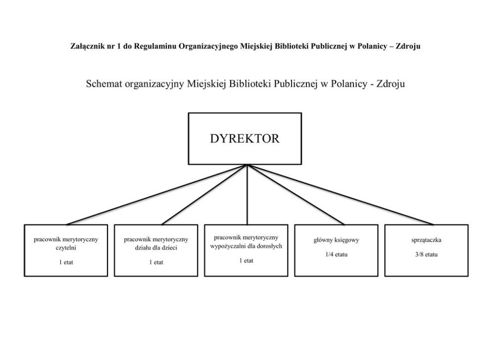 Załącznik nr 1 do Regulaminu Organizacyjnego Miejskiej Biblioteki Publicznej w Polanicy – Zdroju Schemat organizacyjny Miejskiej Biblioteki Publicznej w Polanicy - Zdroju DYREKTOR pracownik merytoryczny czytelni pracownik merytoryczny działu dla dzieci pracownik merytoryczny wypożyczalni dla dorosłych 1 etat 1 etat 1 etat główny księgowy sprzątaczka 1/4 etatu 3/8 etatu