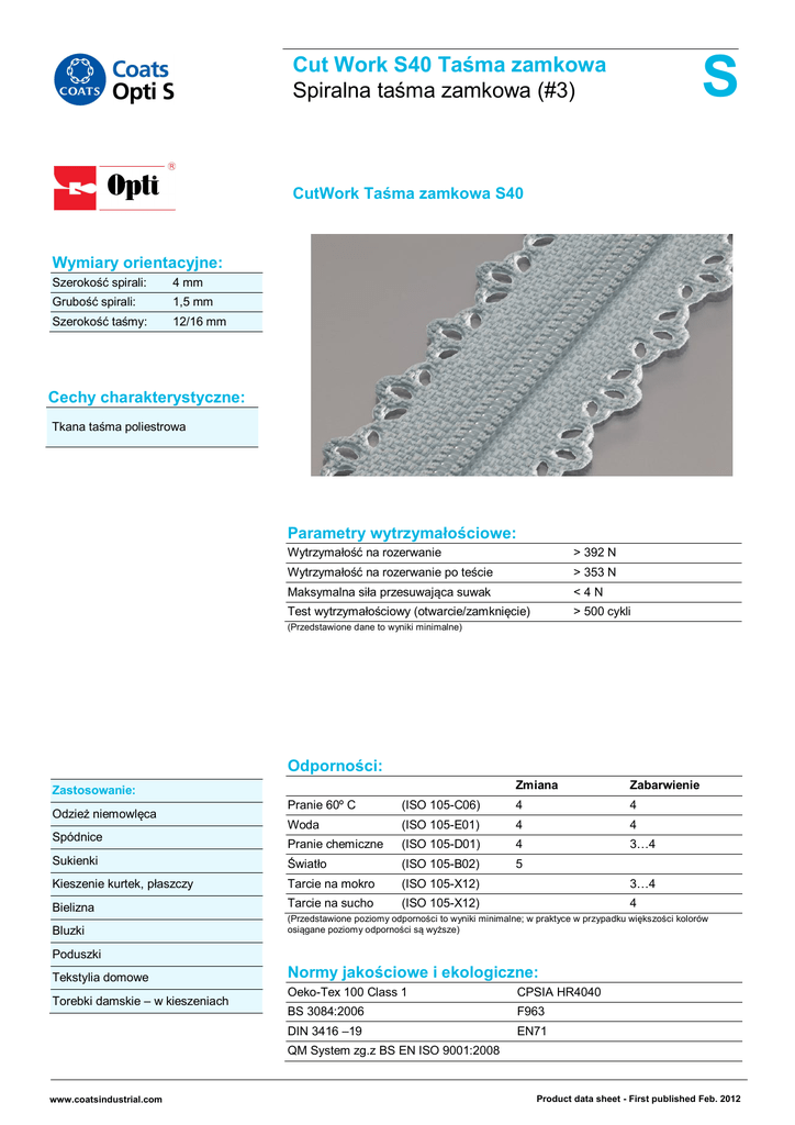 S Cut Work S40 Taśma zamkowa Spiralna taśma zamkowa (#3) CutWork Taśma zamkowa S40 Wymiary orientacyjne: Szerokość spirali: 4 mm Grubość spirali: 1,5 mm Szerokość taśmy: 12/16 mm Cechy charakterystyczne: Tkana taśma poliestrowa Parametry wytrzymałościowe: Wytrzymałość na rozerwanie > 392 N Wytrzymałość na rozerwanie po teście > 353 N Maksymalna siła przesuwająca suwak <4N Test wytrzymałościowy (otwarcie/zamknięcie) > 500 cykli (Przedstawione dane to wyniki minimalne) Odporności: Zastosowanie: Zmiana Zabarwienie Pranie 60º C (ISO 105-C06) 4 4 Woda (ISO 105-E01) 4 4 Pranie chemiczne (ISO 105-D01) 4 3…4 Sukienki Światło (ISO 105-B02) 5 Kieszenie kurtek, płaszczy Tarcie na mokro (ISO 105-X12) 3…4 Bielizna Tarcie na sucho (ISO 105-X12) 4 Bluzki (Przedstawione poziomy odporności to wyniki minimalne; w praktyce w przypadku większości kolorów osiągane poziomy odporności są wyższe) Odzież niemowlęca Spódnice Poduszki Tekstylia domowe Torebki damskie – w kieszeniach Normy jakościowe i ekologiczne: Oeko-Tex 100 Class 1 CPSIA HR4040 BS 3084:2006 F963 DIN 3416 –19 EN71 QM System zg.z BS EN ISO 9001:2008 www.coatsindustrial.com Product data sheet - First published Feb. 2012