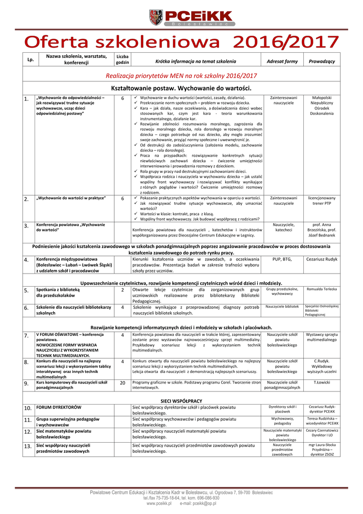 Lp. Nazwa szkolenia, warsztatu, konferencji Liczba godzin Krótka informacja na temat szkolenia Adresat formy Prowadzący Zainteresowani nauczyciele Małopolski Niepubliczny Ośrodek Doskonalenia Zainteresowani nauczyciele licencjonowany trener PTP Nauczyciele, katecheci prof. Anna Brzezińska, prof. Józef Bednarek Realizacja priorytetów MEN na rok szkolny 2016/2017 Kształtowanie postaw. Wychowanie do wartości. 1. „Wychowanie do odpowiedzialności – jak rozwiązywać trudne sytuacje wychowawcze, ucząc dzieci odpowiedzialnej postawy” 6 2. „Wychowanie do wartości w praktyce” 6 3. Konferencja powiatowa „Wychowanie do wartości” Wychowanie w duchu wartości (wartości, zasady, działania). Przekraczanie norm społecznych – problem w rozwoju dziecka. Kara – jak działa, nasze oczekiwania, a doświadczenia dzieci wobec stosowanych kar, czym jest kara - teoria warunkowania instrumentalnego, działanie kar. Rozwijanie zdolności rozumowania moralnego, zagrożenia dla rozwoju moralnego dziecka, rola dorosłego w rozwoju moralnym dziecka – czego potrzebuje od nas dziecko, aby mogło zrozumieć swoje zachowanie, przyjąć normy społeczne i uwewnętrznić je. Od destrukcji do zadośćuczynienia (założenia modelu, zachowanie dziecka – rola dorosłego). Praca na przypadkach: rozwiązywanie konkretnych sytuacji niewłaściwych zachowań dziecka – ćwiczenie umiejętności interweniowania i prowadzenia rozmowy z dzieckiem. Rola grupy w pracy nad destrukcyjnymi zachowaniami dzieci. Współpraca rodzica i nauczyciela w wychowaniu dziecka – jak ustalić wspólny front wychowawczy i rozwiązywać konflikty wynikające z różnych poglądów i wartości? Ćwiczenie umiejętności rozmowy z rodzicem. Pokazanie praktycznych aspektów wychowania w oparciu o wartości. Jak rozwiązywać trudne sytuacje wychowawcze, aby umacniać wartości? Wartości w klasie: kontrakt, praca z klasą. Wspólny front wychowawczy. Jak budować współpracę z rodzicami? Konferencja powiatowa dla nauczycieli , katechetów i instruktorów współorganizowana przez Diecezjalne Centrum Edukacyjne w Legnicy. Podniesienie jakości kształcenia zawodowego w szkołach ponadgimnazjalnych poprzez angażowanie pracodawców w proces dostosowania kształcenia zawodowego do potrzeb rynku pracy. 4. Konferencja międzypowiatowa (Bolesławiec – Lubań – Lwówek Śląski) z udziałem szkół i pracodawców 5. Spotkania z biblioteką dla przedszkolaków 6. Szkolenie dla nauczycieli bibliotekarzy szkolnych 7. 8. 9. Kierunki kształcenia uczniów w zawodach, a oczekiwania pracodawców. Prezentacja badań w zakresie trafności wyboru szkoły przez uczniów. PUP, BTG, Upowszechnianie czytelnictwa, rozwijanie kompetencji czytelniczych wśród dzieci i młodzieży. Otwarte lekcje czytelnicze dla zorganizowanych grup Grupy przedszkolne, 2 4 uczniowskich realizowane przez bibliotekarzy Biblioteki Pedagogicznej. Szkolenie wynikające z przeprowadzonej diagnozy potrzeb nauczycieli bibliotek szkolnych. 4 20 Romualda Terlecka wychowawcy Nauczyciele bibliotek Rozwijanie kompetencji informatycznych dzieci i młodzieży w szkołach i placówkach. V FORUM OŚWIATOWE – konferencja Konferencja powiatowa dla nauczycieli w trakcie której, zaprezentowany Nauczyciele szkół 4 powiatowa. NOWOCZESNE FORMY WSPARCIA NAUCZYCIELI Z WYKORZYSTANIEM TECHNIK MULTIMEDIALNYCH. Konkurs dla nauczycieli na najlepszy scenariusz lekcji z wykorzystaniem tablicy interaktywnej oraz innych technik multimedialnych Kurs komputerowy dla nauczycieli szkół ponadgimnazjalnych Cezariusz Rudyk zostanie przez wystawców najnowocześniejszy sprzęt multimedialny. Przykładowy scenariusz lekcji z wykorzystaniem technik multimedialnych. powiatu bolesławieckiego Konkurs otwarty dla nauczycieli powiatu bolesławieckiego na najlepszy scenariusz lekcji z wykorzystaniem technik multimedialnych. Lekcja otwarta dla nauczycieli z demonstracją najlepszych scenariuszy. Nauczyciele szkół powiatu bolesławieckiego Programy graficzne w szkole. Podstawy programu Corel. Tworzenie stron Nauczyciele szkół internetowych. ponadgimnazjalnych Specjaliści Dolnośląskiej Biblioteki Pedagogicznej Wystawcy sprzętu multimedialnego C.Rudyk. Wykładowy wyższych uczelni T.Łowicki SIECI WSPÓŁPRACY 10. FORUM DYREKTORÓW 11. Grupa superwizyjna pedagogów i wychowawców Sieć matematyków powiatu bolesławieckiego Sieć współpracy dyrektorów szkół i placówek powiatu bolesławieckiego. Sieć współpracy wychowawców i pedagogów powiatu bolesławieckiego. Sieć współpracy nauczycieli matematyki powiatu bolesławieckiego. Sieć współpracy nauczycieli przedmiotów zawodowych Sieć współpracy nauczycieli przedmiotów zawodowych powiatu bolesławieckiego. 12. 13. Dyrektorzy szkół i placówek Cezariusz Rudykdyrektor PCEiKK Wychowawcy, pedagodzy Teresa Rudzińska – wicedyrektor PCEiKK Nauczyciele matematyki powiatu bolesławieckiego Nauczyciele przedmiotów zawodowych Cezary Czernatowicz Dyrektor I LO Powiatowe Centrum Edukacji i Kształcenia Kadr w Bolesławcu, ul. Ogrodowa 7, 59-700 Bolesławiec tel./fax 75-735-18-64, tel. kom. 696-086-930 www.pceikk.pl e-mail: [email protected] mgr Laura-Słocka Przydróżna – dyrektor ZSOiZ SZKOLENIA DLA NAUCZYCIELI PRZEDMIOTÓW ZAWODOWYCH Wykorzystanie wiedzy metodycznej i prawnej do określenia skali 8 14. Modyfikowanie programu nauczania do zawodu 15. Ewaluacja programu nauczania do zawodu 3 16. Wykorzystanie badań i analiz oraz wyników kształcenia do poprawy jakości pracy szkoły 12 17. Metody aktywizujące do twórczej pracy w zespołach 16 Neurodydaktyka w szkole 19. Tutoring jako metoda pracy pedagogicznej 3 20. Motywowanie uczniów szkoły ponadgimnazjalnej 12 21. Coachingowe lekcje wychowawcze 12 22. Jak motywować niezmotywowanych 6 23. Ocenianie wspierające 8 24. Innowacje i eksperymenty jako programy rozwojowe szkoły Jak efektywnie uczyć i angażować uczniów? Podejmowanie działań zwiększających efekty ksz